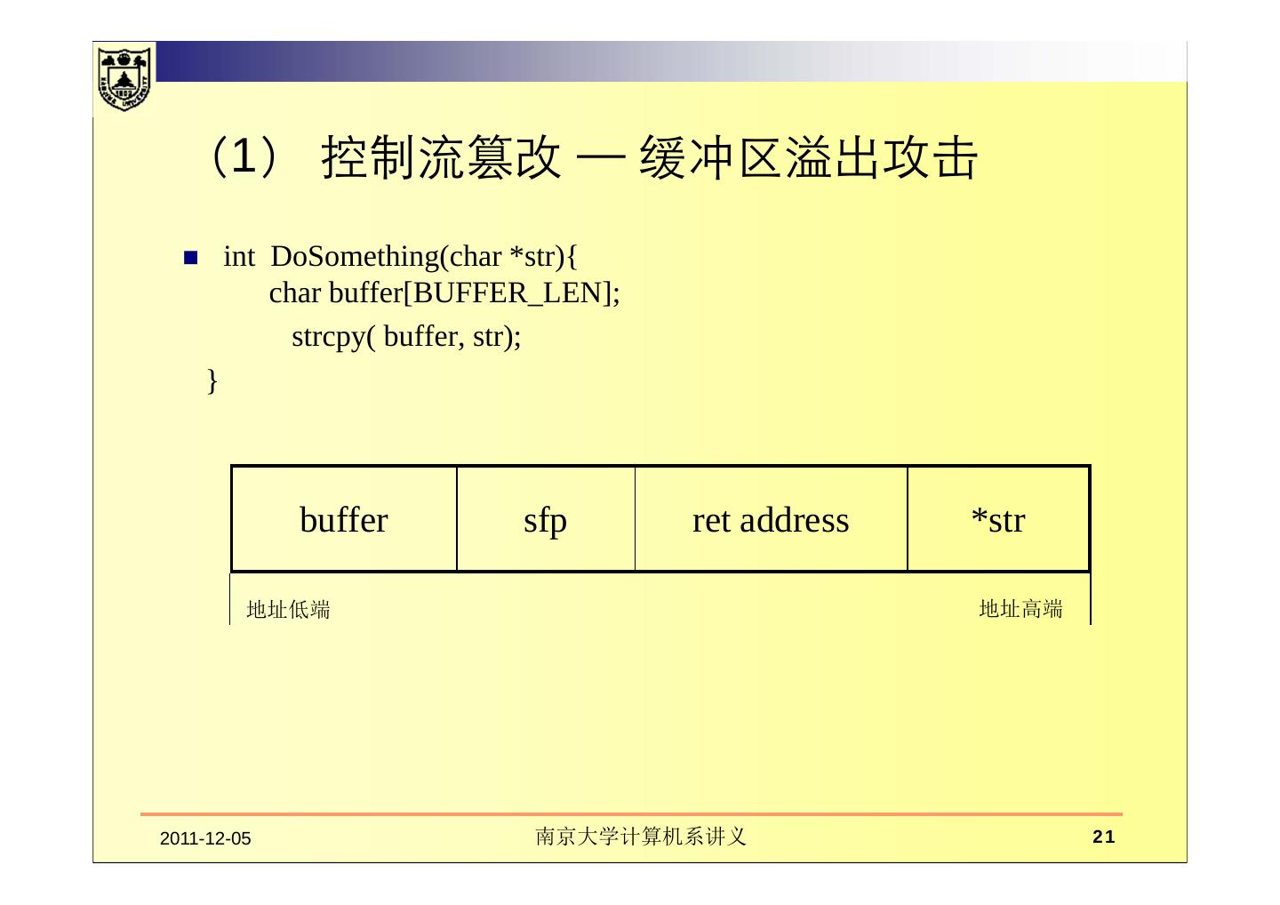 21 . (1) 控制流篡改 — 缓冲区溢出攻击 int DoSomething(char *str){ char buffer[BUFFER_LEN]; strcpy( buffer, str); } buffer sfp ret address *str 地址低端 地址高端 2011-12-05 南京大学计算机系讲义 21