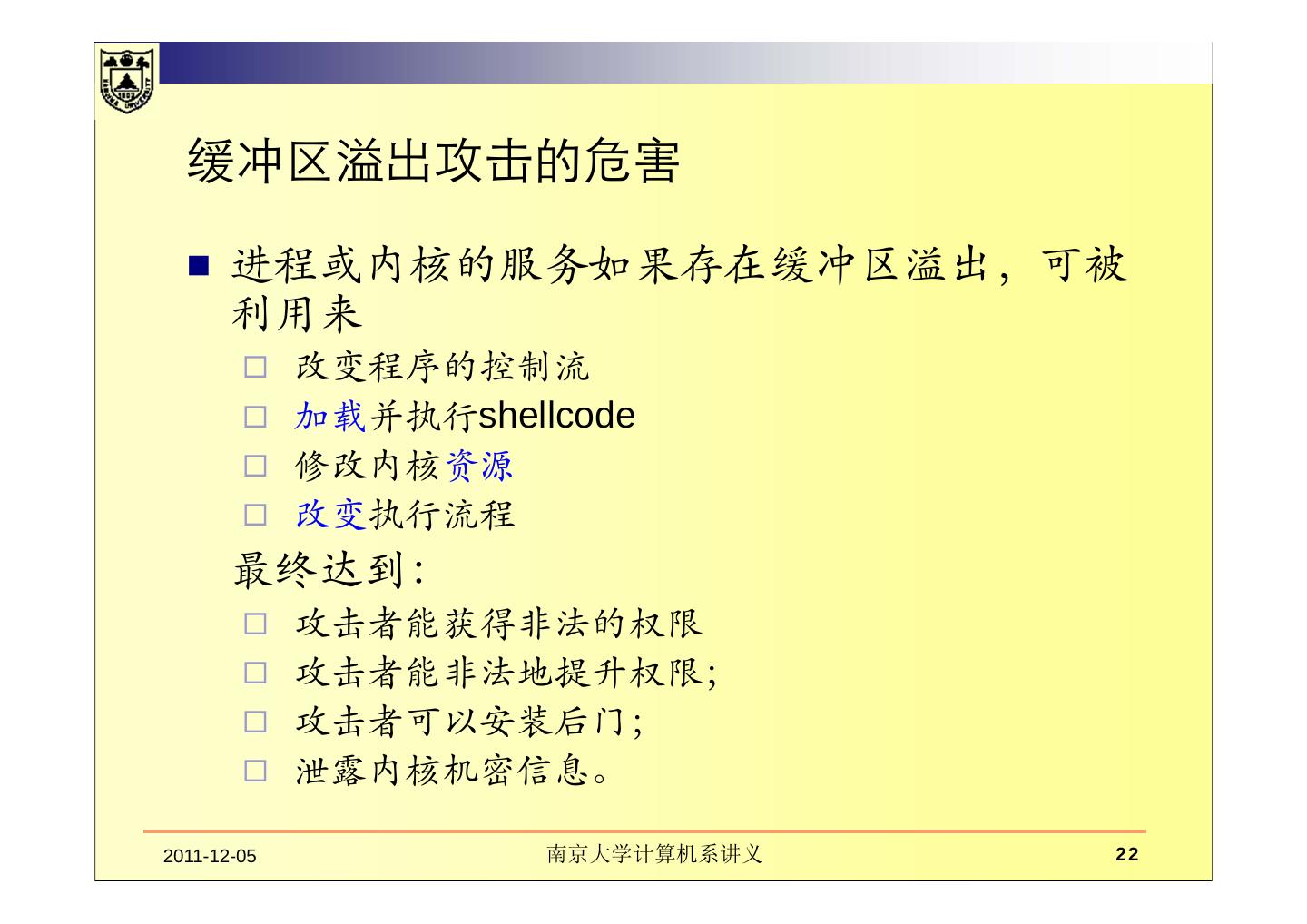 22 . 缓冲区溢出攻击的危害 进程或内核的服务如果存在缓冲区溢出,可被 利用来 改变程序的控制流 加载并执行shellcode 修改内核资源 改变执行流程 最终达到: 攻击者能获得非法的权限 攻击者能非法地提升权限; 攻击者可以安装后门; 泄露内核机密信息。 2011-12-05 南京大学计算机系讲义 22