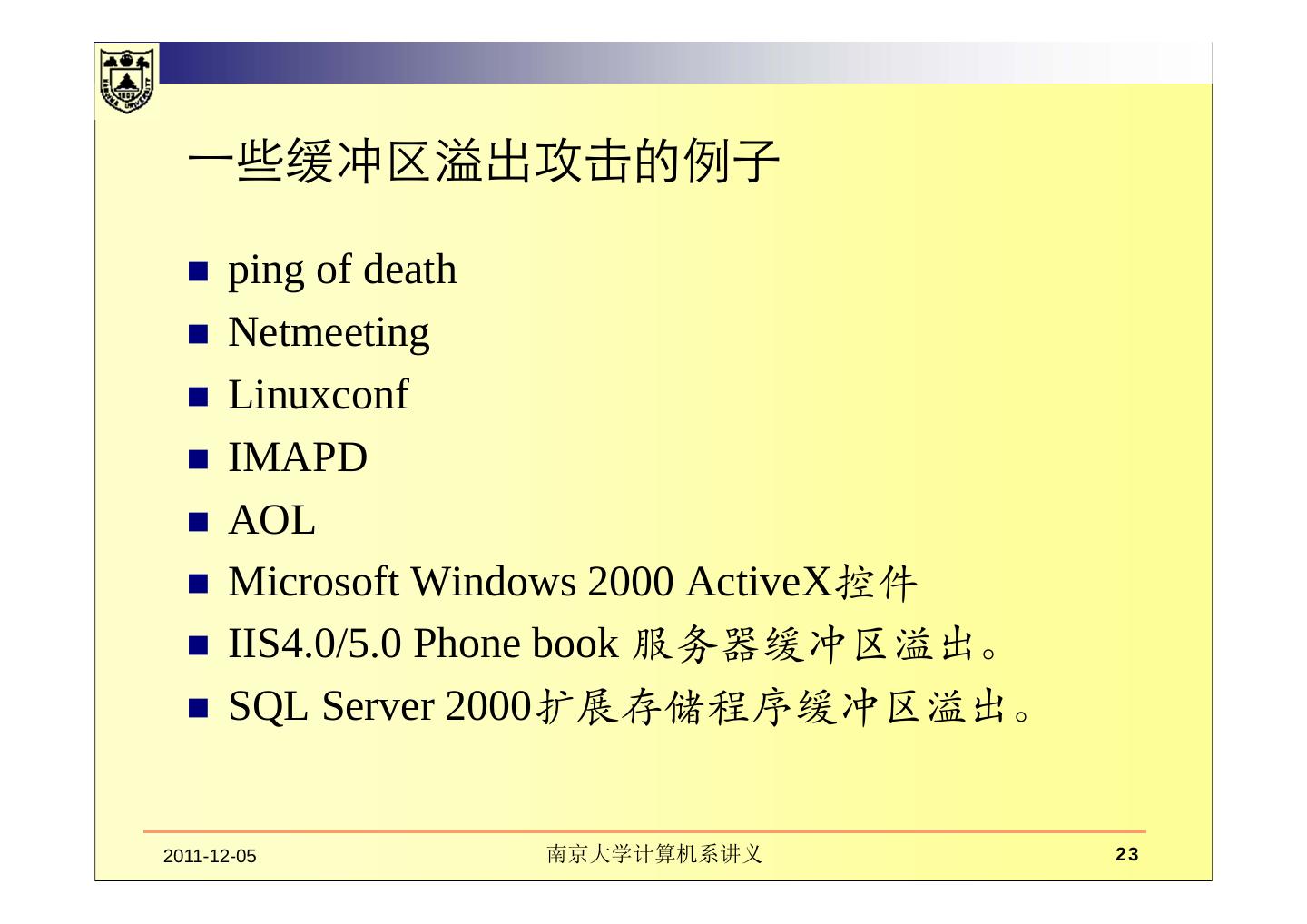 23 . 一些缓冲区溢出攻击的例子 ping of death Netmeeting Linuxconf IMAPD AOL Microsoft Windows 2000 ActiveX控件 IIS4.0/5.0 Phone book 服务器缓冲区溢出。 SQL Server 2000扩展存储程序缓冲区溢出。 2011-12-05 南京大学计算机系讲义 23
