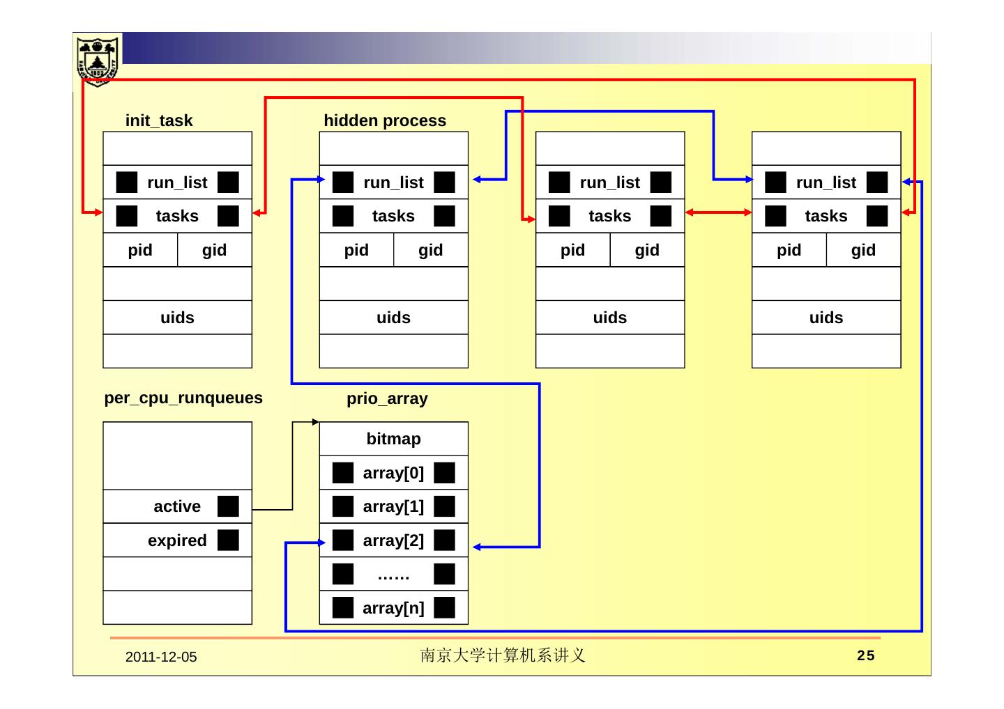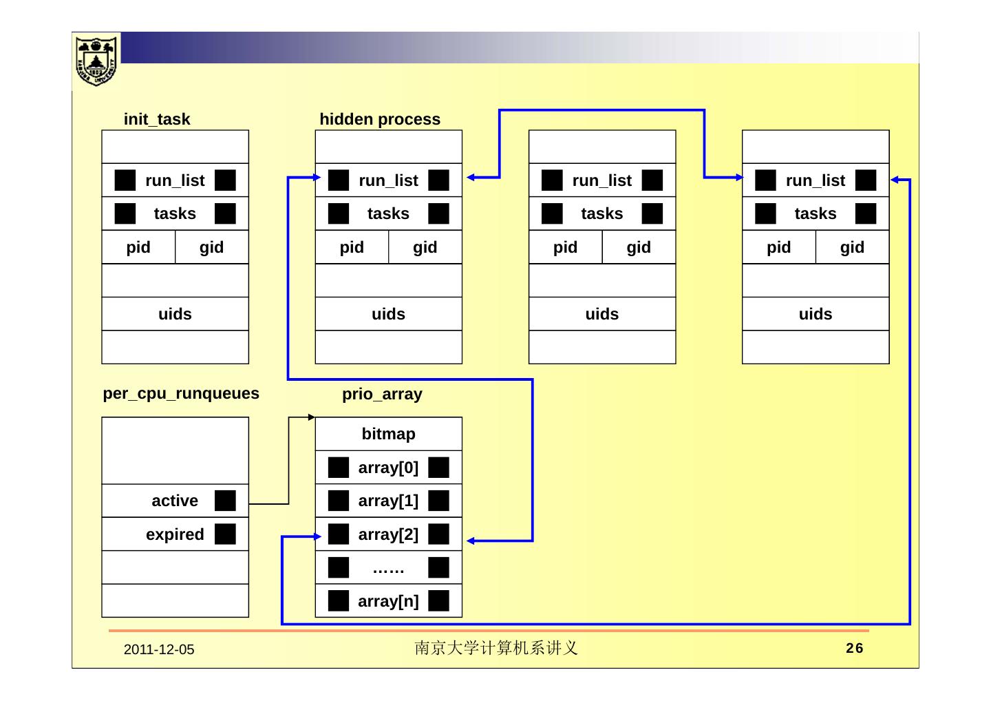 25 . init_task hidden process run_list run_list run_list run_list tasks tasks tasks tasks pid gid pid gid pid gid pid gid uids uids uids uids per_cpu_runqueues prio_array bitmap array[0] active array[1] expired array[2] …… array[n] 2011-12-05 南京大学计算机系讲义 25