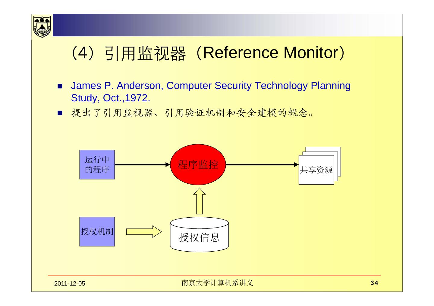 28 . (3)隐蔽信道 高安全 高安全 引用监 级主体 级客体 控机制 × × × 低安全 低安全 级客体 级主体 引用监控 隐蔽 机制未控制 信道 的信息 2011-12-05 南京大学计算机系讲义 28