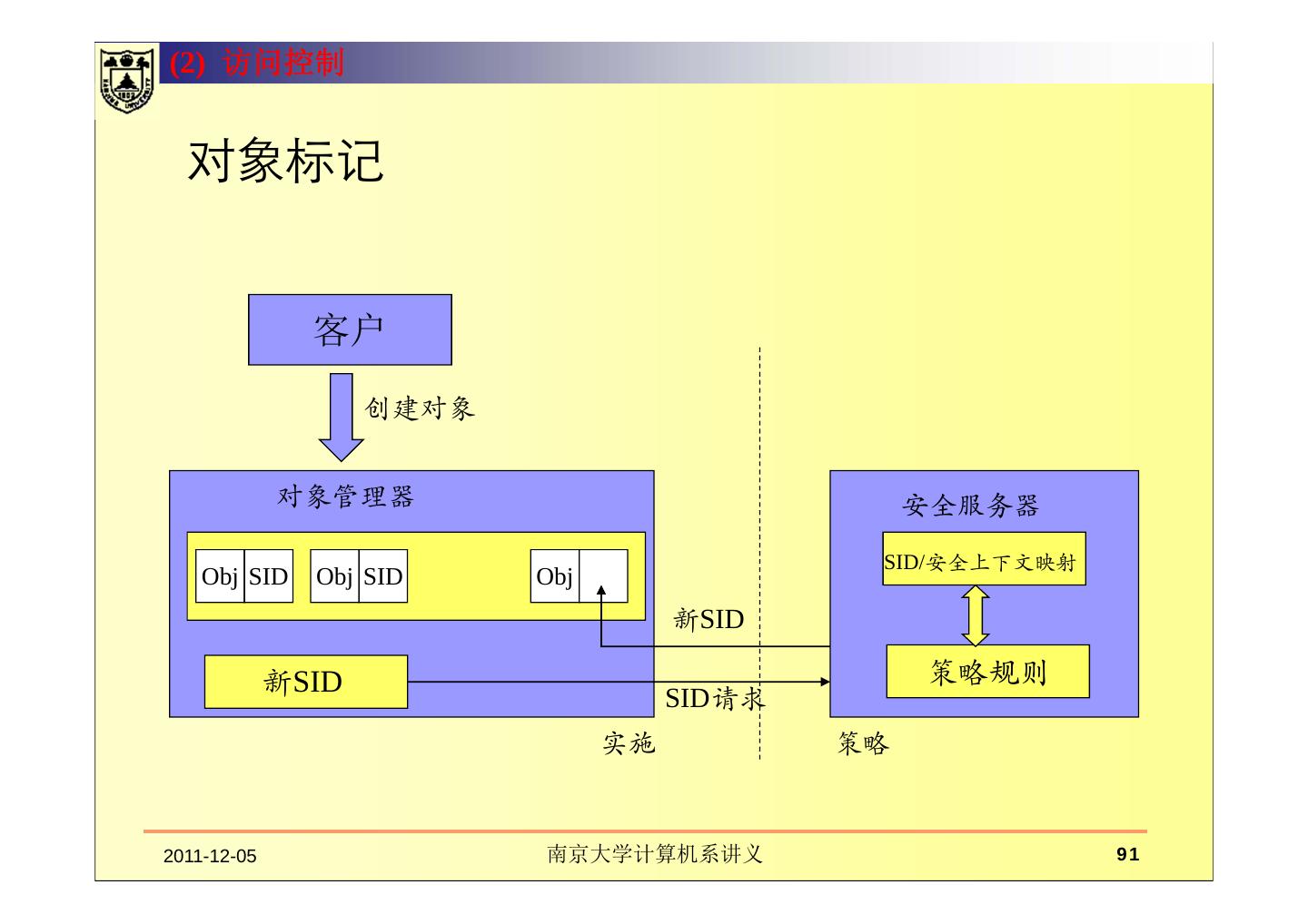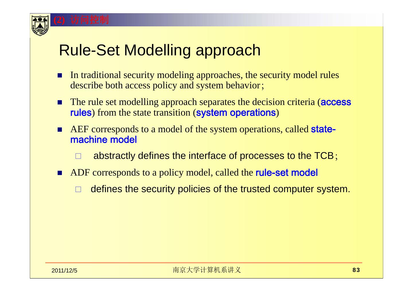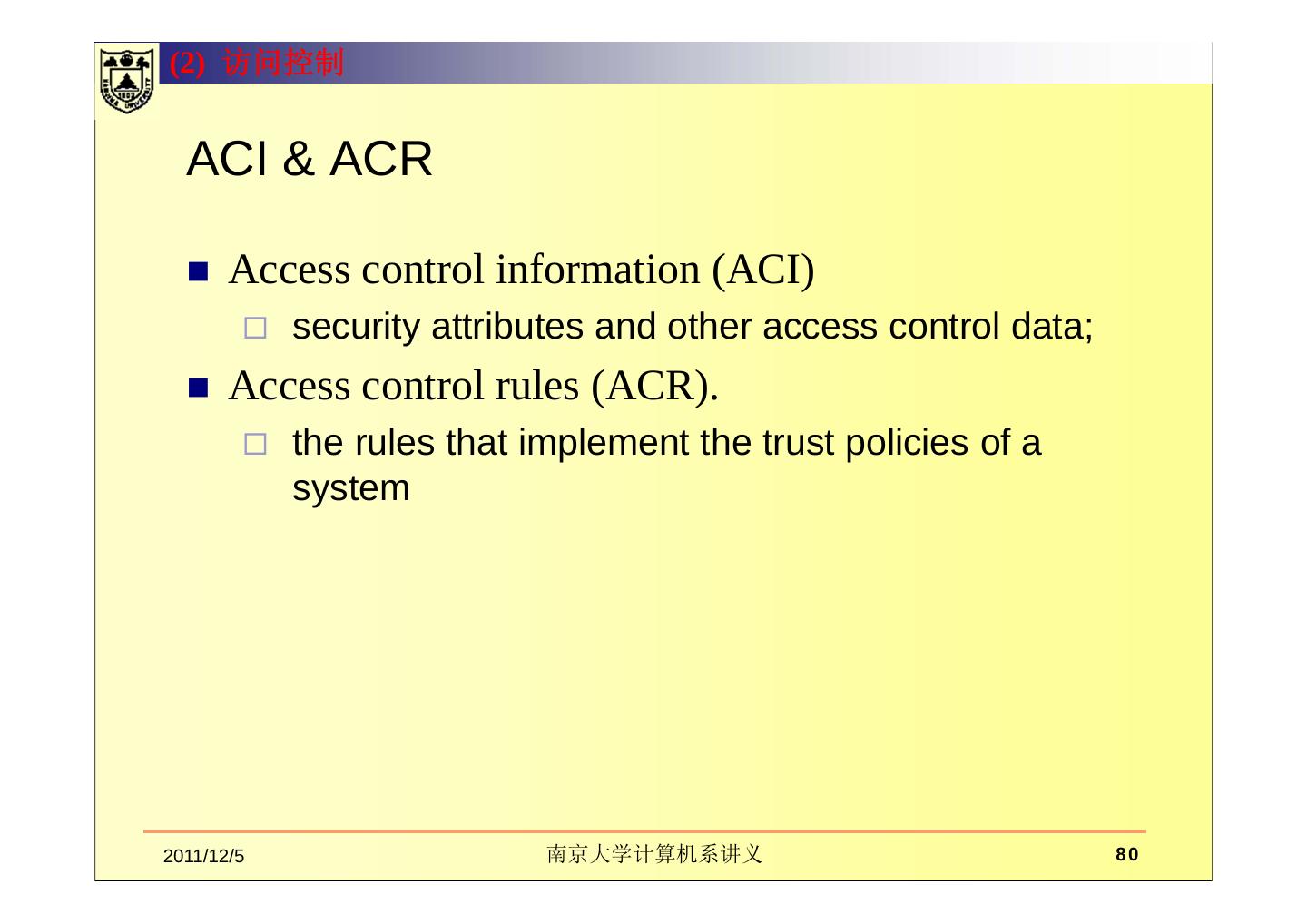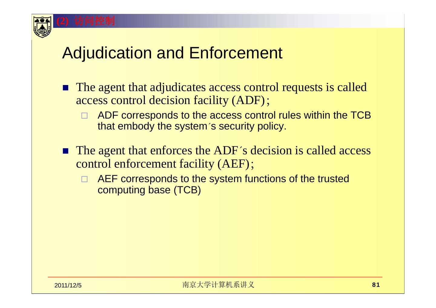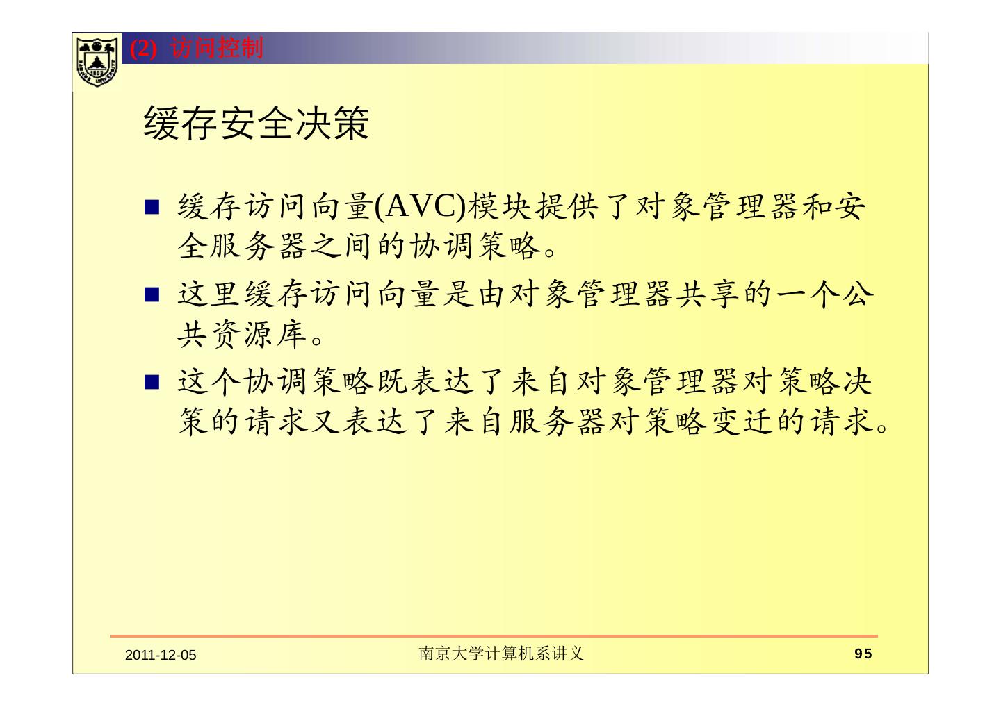 6 . 7.1 可信操作系统研究的发展 访问矩阵(access matrix) Lampson B.W. 通过形式化表示方法,运用主体(subject)、客体 (object)和访问矩阵(access matrix)的思想,第一次对访问控制问题进 行了抽象。 Lampson B.W., Dynamic Protection Structures. In Proceedings of the AFIPS, Fall Joint Computer Conference, volum 35, Las Vegas, Nevada, 27-38. Nov. 1969. 访问矩阵是以主体为行索引、以客体为列索引的矩阵,矩阵中的每 一个元素表示一组访问方式,是若干访问方式的集合。 矩阵中第i行第j列的元素Mij,记录着第i个主体Si,可以执行的对第j个 客体Oj的访问方式,比如Mij,等于(read,write)表示Si可以对Oj 进行 读和写访问。 2011-12-05 南京大学计算机系讲义 6