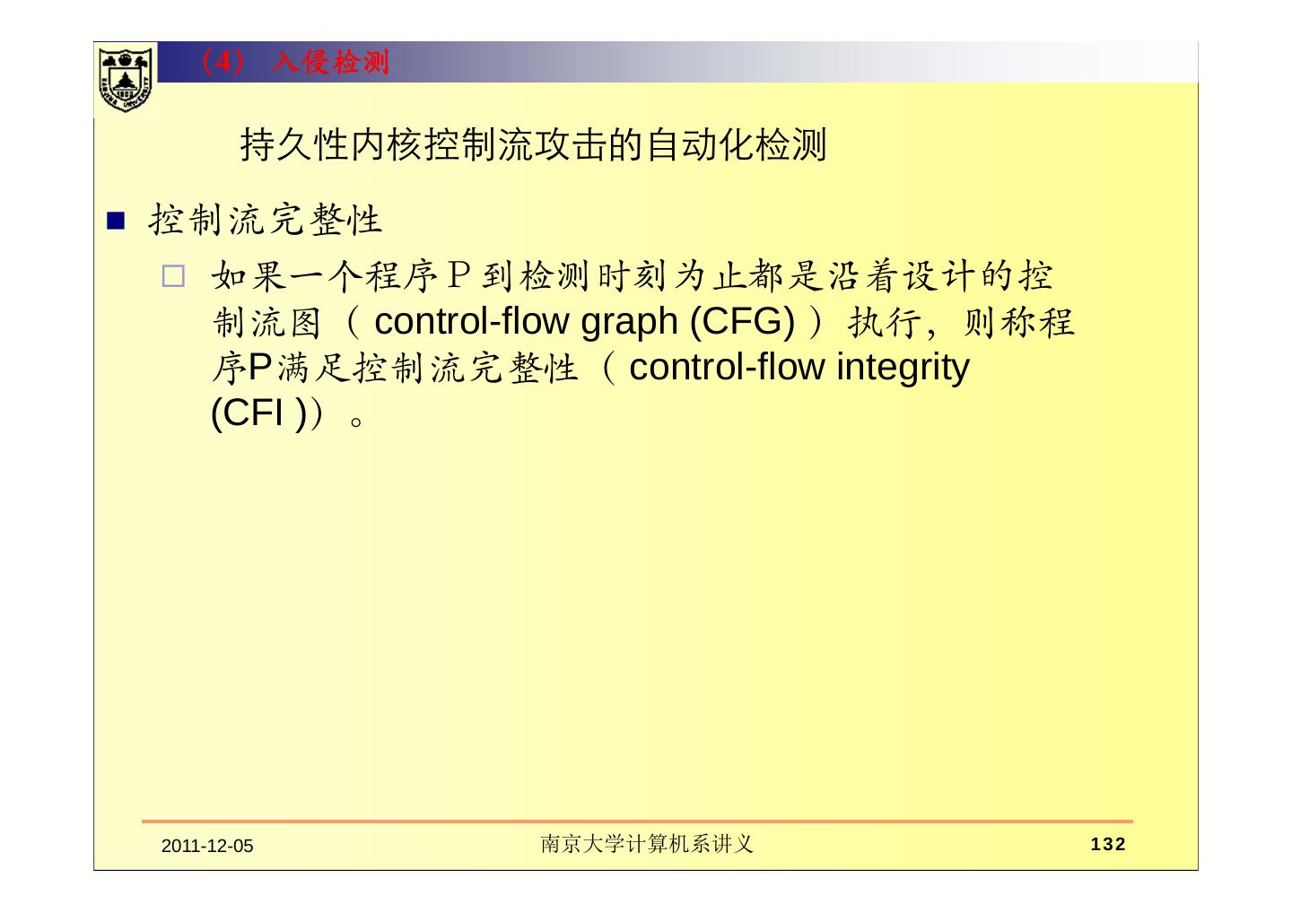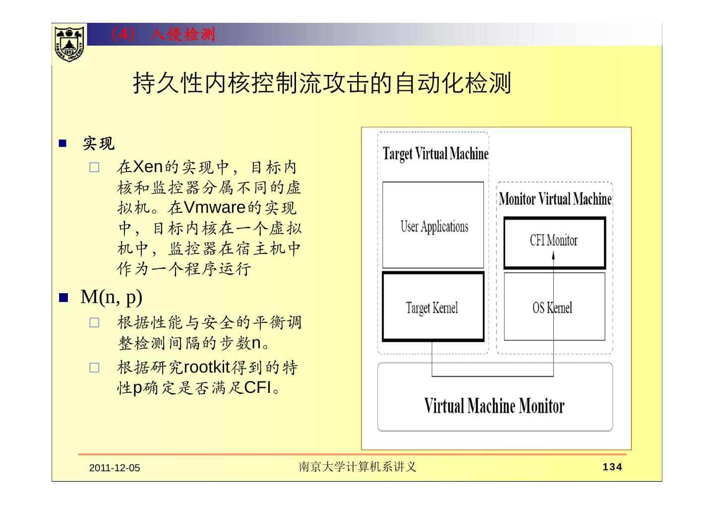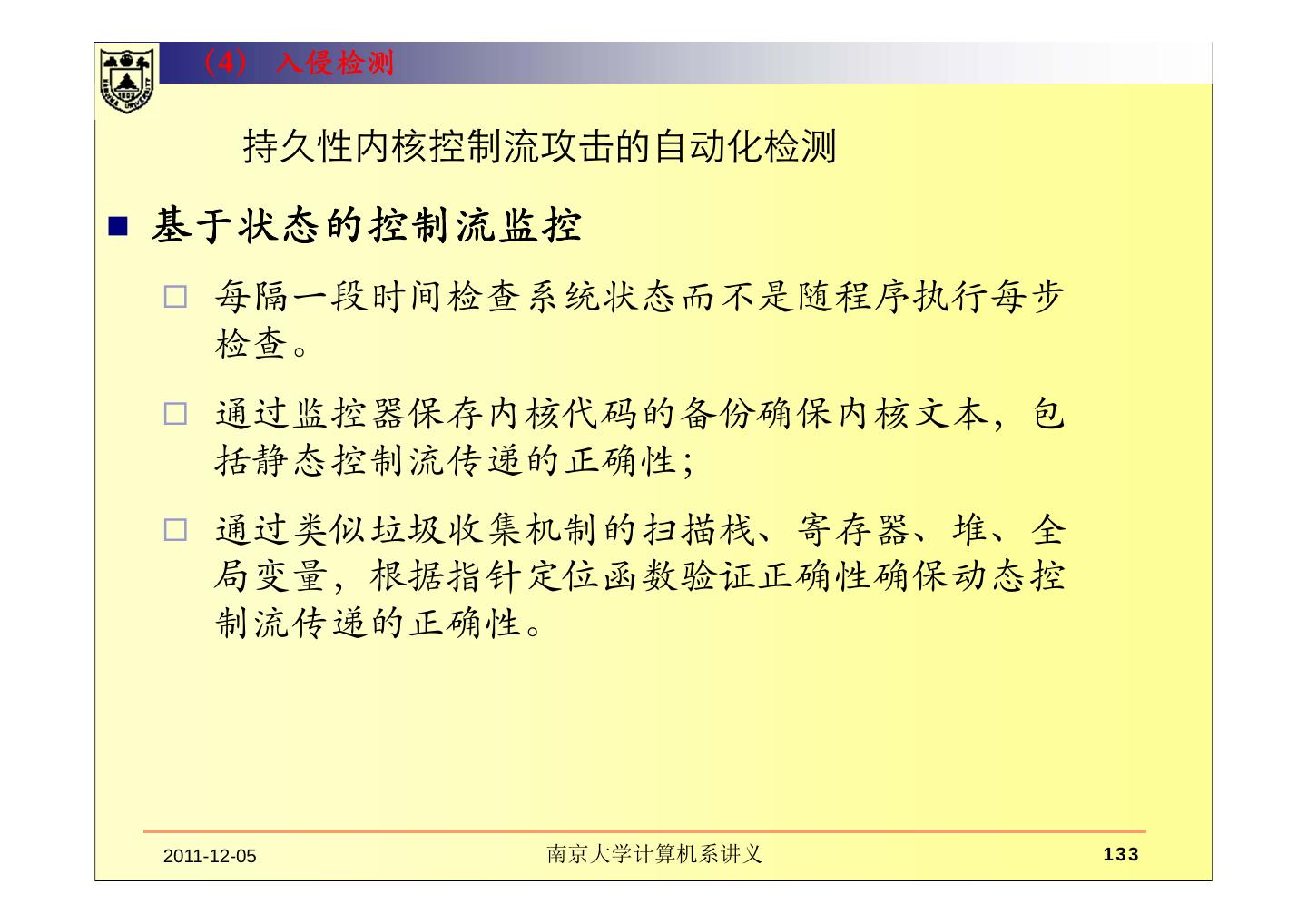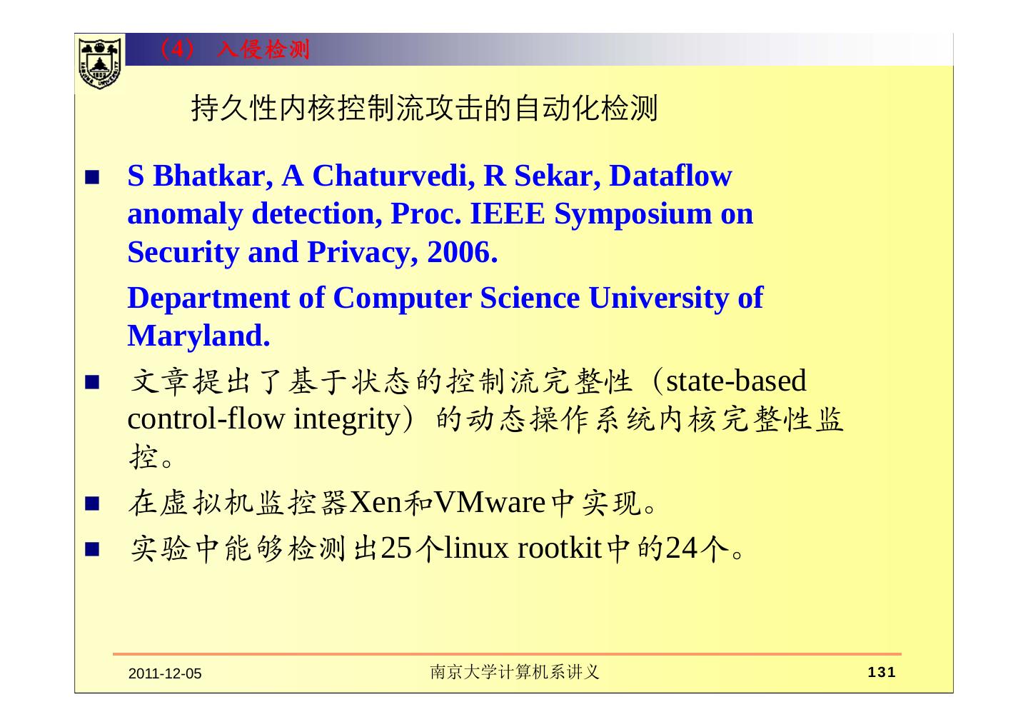 24 .(2) 关键数据篡改 — 进程隐藏的攻击与检测 修改数据:攻击者可以在不修改内核代码和控制 流的情况下隐藏它们的进程。 修改ps所依赖的底层数据,使其无法看到被隐藏的 进程。 能够让进程调度程序调度被隐藏的进程。 2011-12-05 南京大学计算机系讲义 24