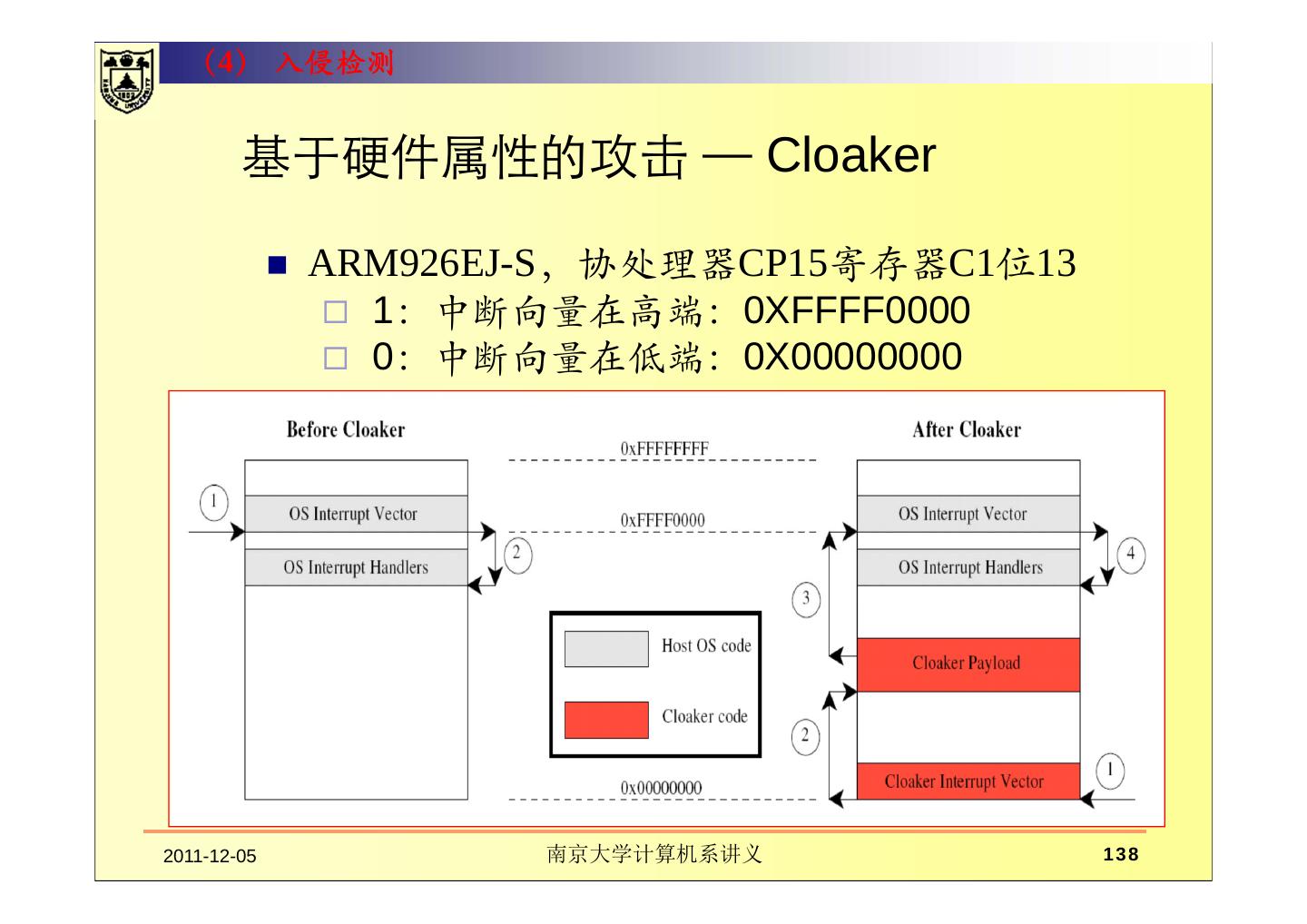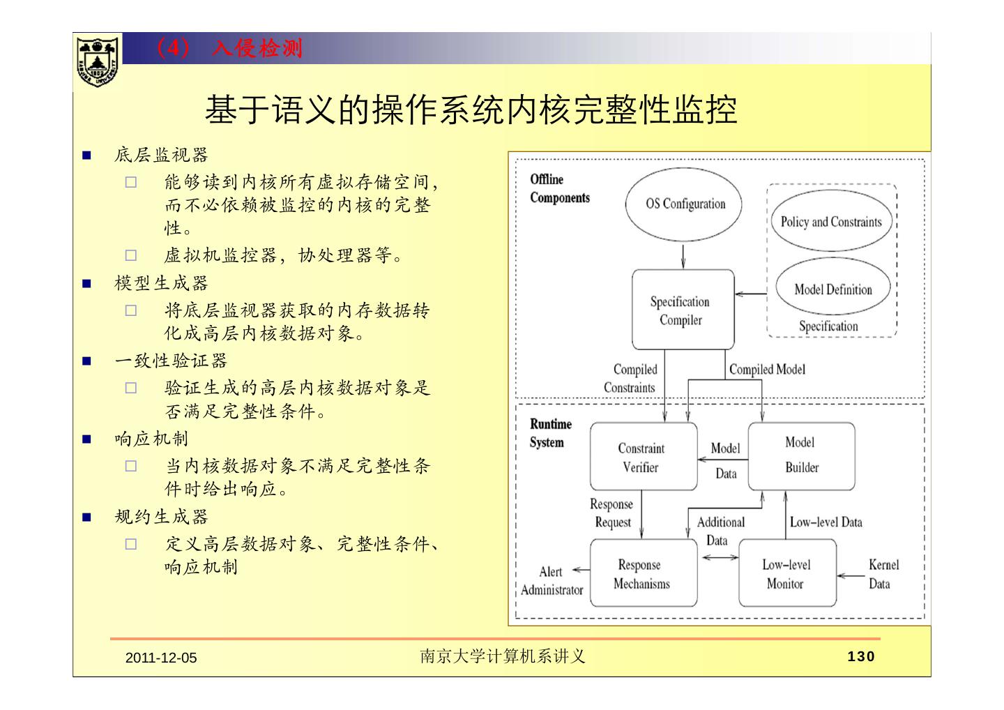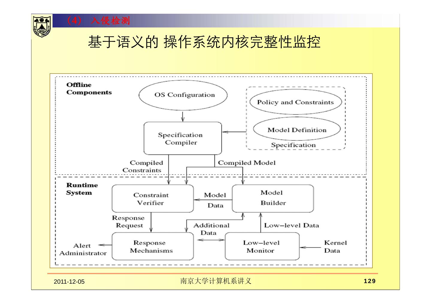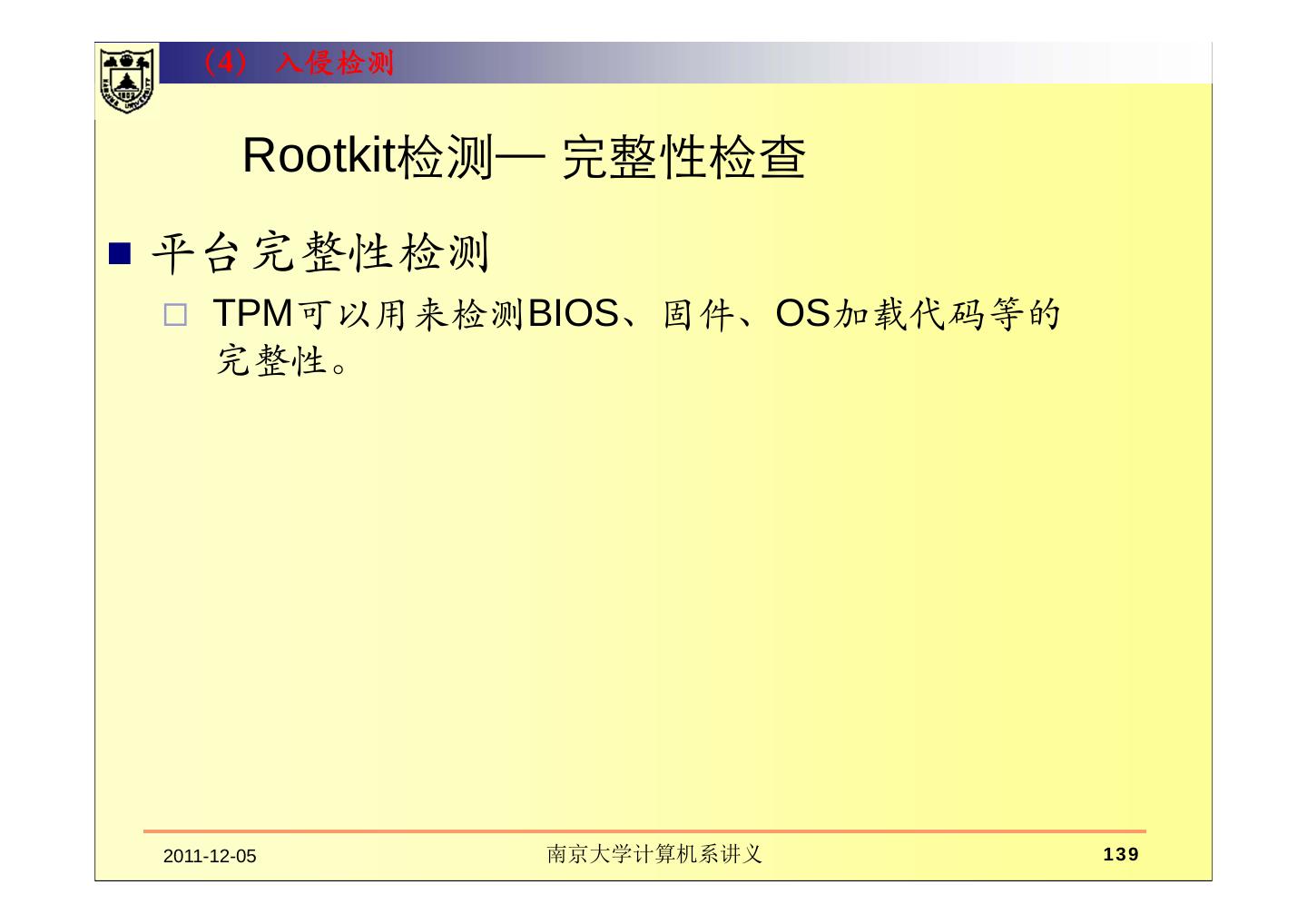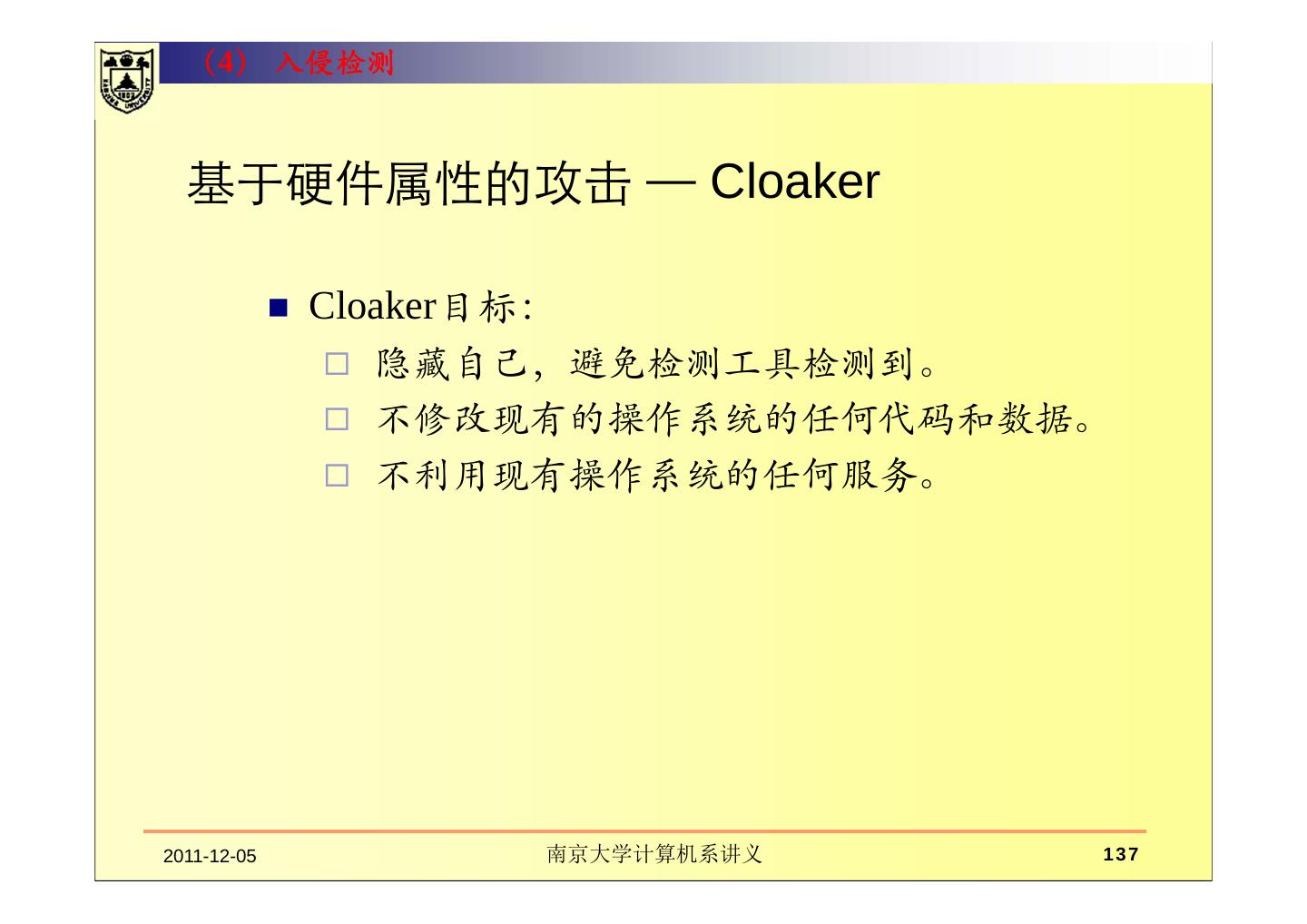 24 .(2) 关键数据篡改 — 进程隐藏的攻击与检测 修改数据:攻击者可以在不修改内核代码和控制 流的情况下隐藏它们的进程。 修改ps所依赖的底层数据,使其无法看到被隐藏的 进程。 能够让进程调度程序调度被隐藏的进程。 2011-12-05 南京大学计算机系讲义 24