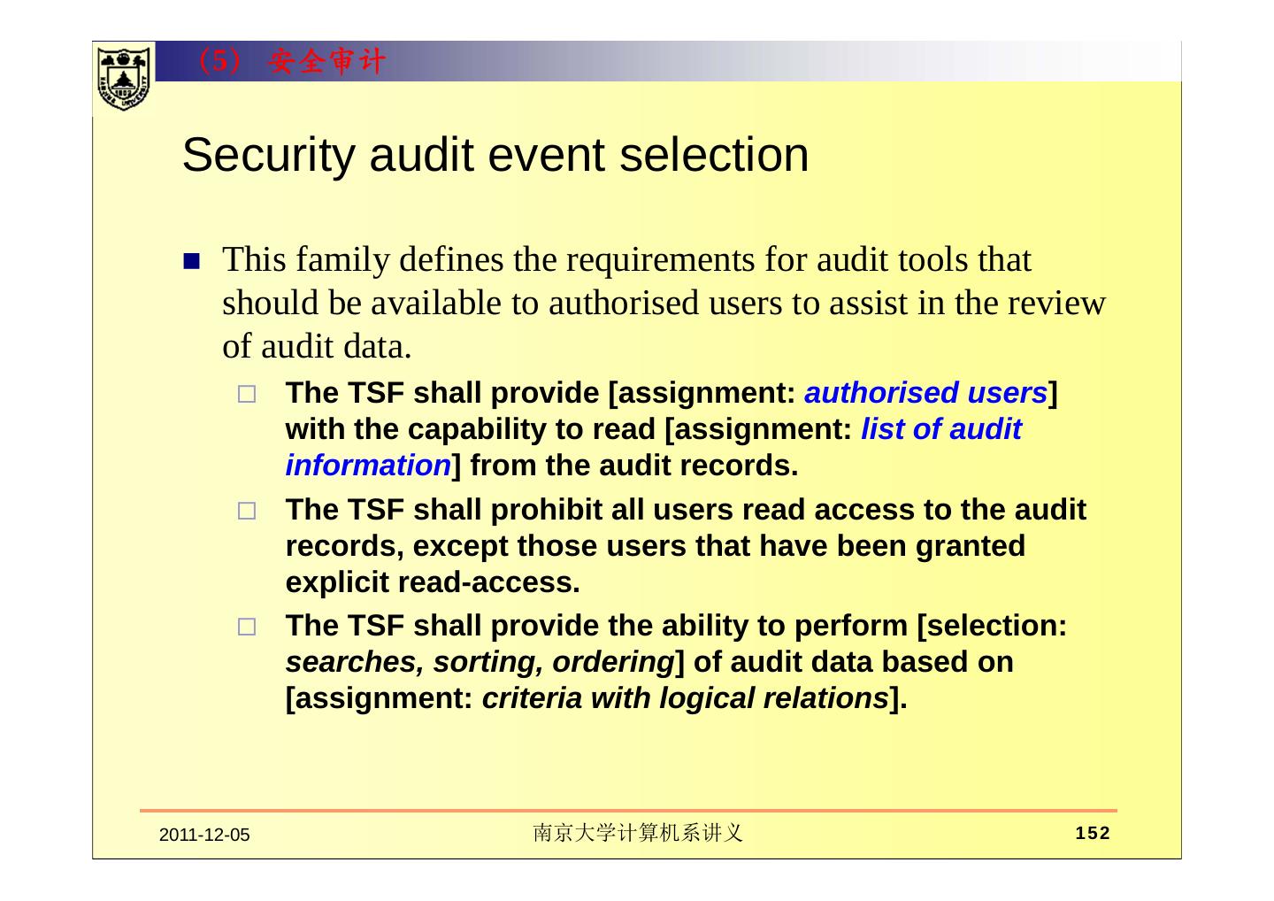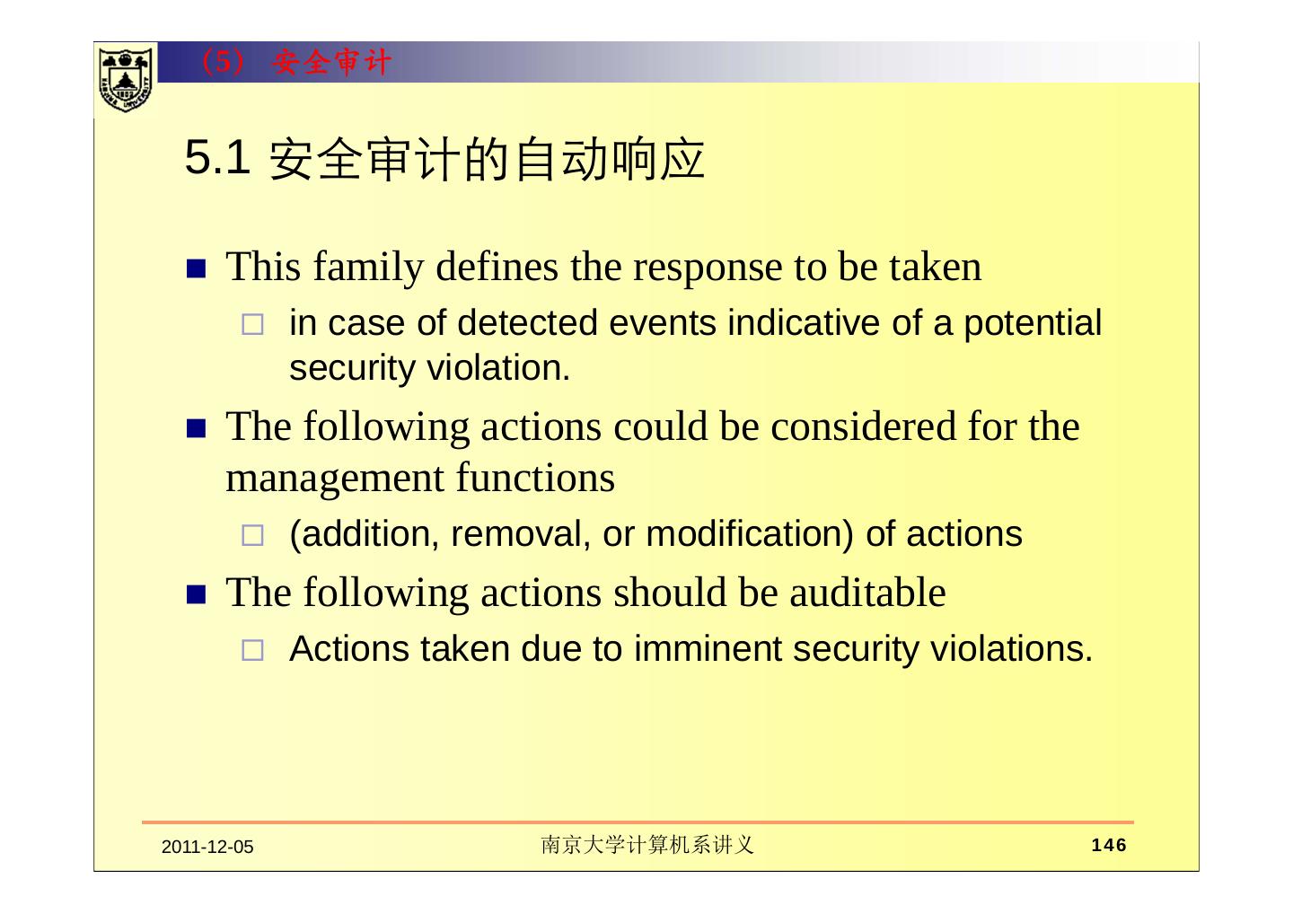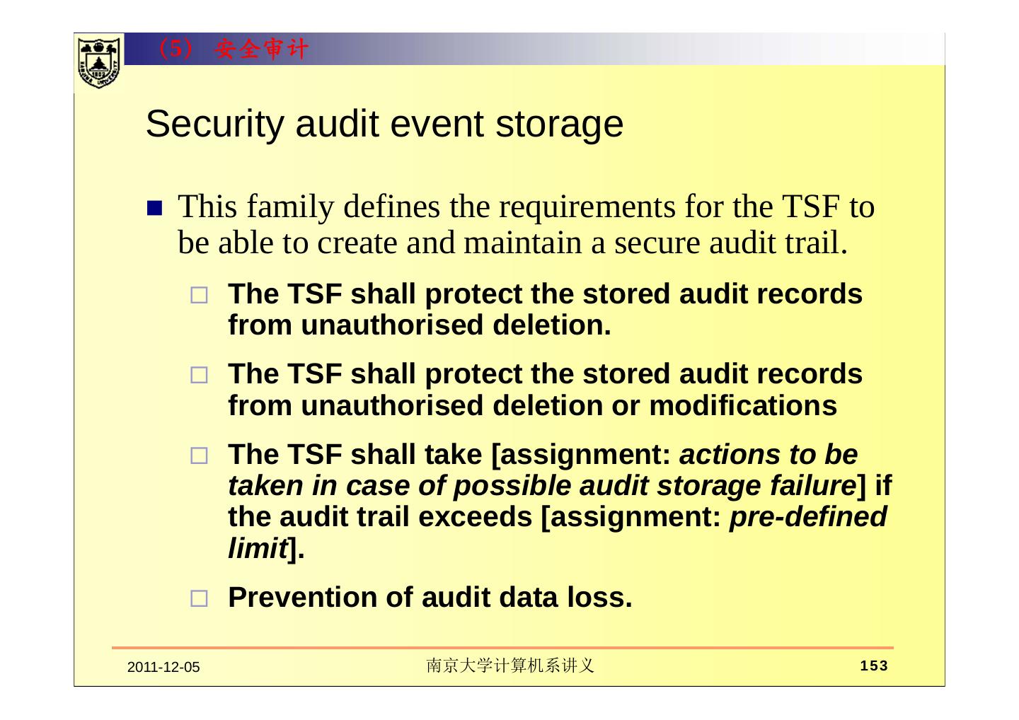 8 . 7.1 可信操作系统研究的发展 多级安全(Multilevel security system) 安全控制措施的特点 系统灵活性:在应用中可调整个体和信息的安全等级 可靠性:贯彻“失败-保险”思想,当不能确定是否授权时,采 取不授权的措施) 可审计性:记录安全相关行为人可管理性(安全控制、审计控制 等管理) 可依赖性:避免拒绝对用户的服务 配置完整性:确保系统自身的完整 报告认为计算机系统的安全控制是个系统设计问题,必 须从硬件、软件、通信、物理、人员和行政管理规程等 各个方面综合考虑。 2011-12-05 南京大学计算机系讲义 8