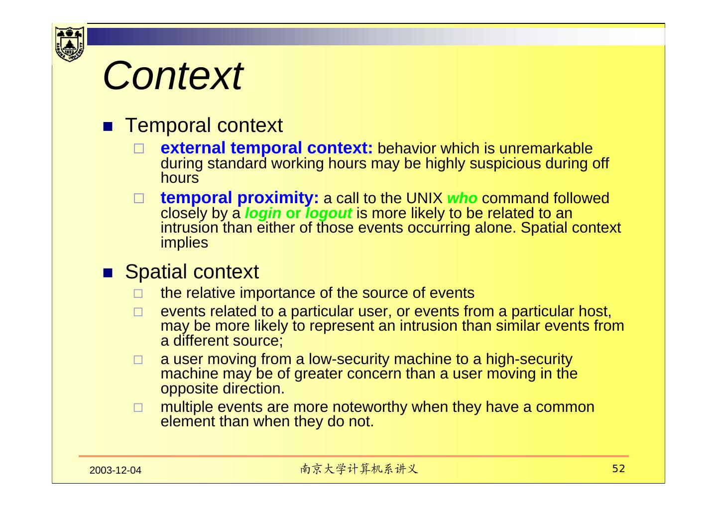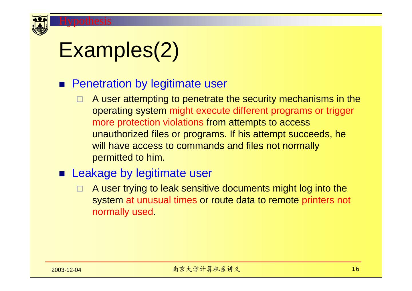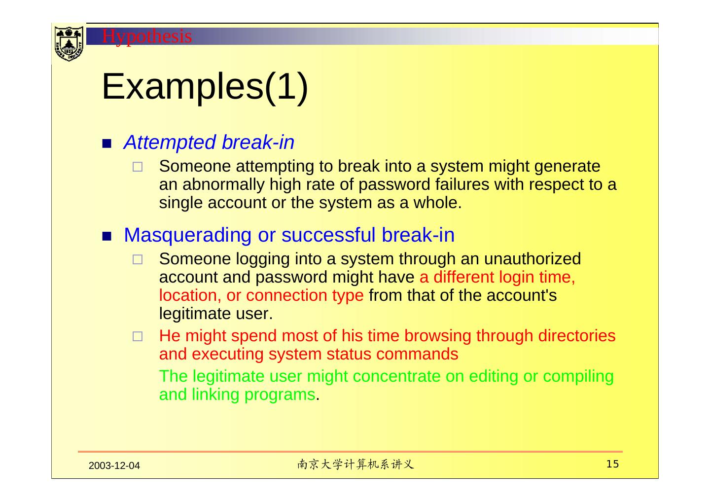 14 . Hypothesis exploitation of a system's vulnerabilities involves abnormal use, of the system; therefore, security violations could be detected from abnormal patterns of system usage. 2003-12-04 南京大学计算机系讲义 14