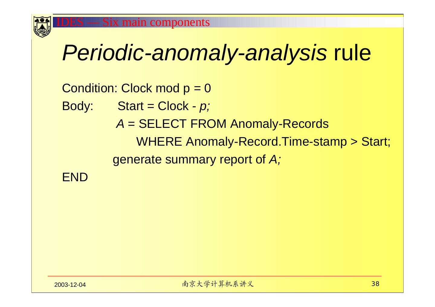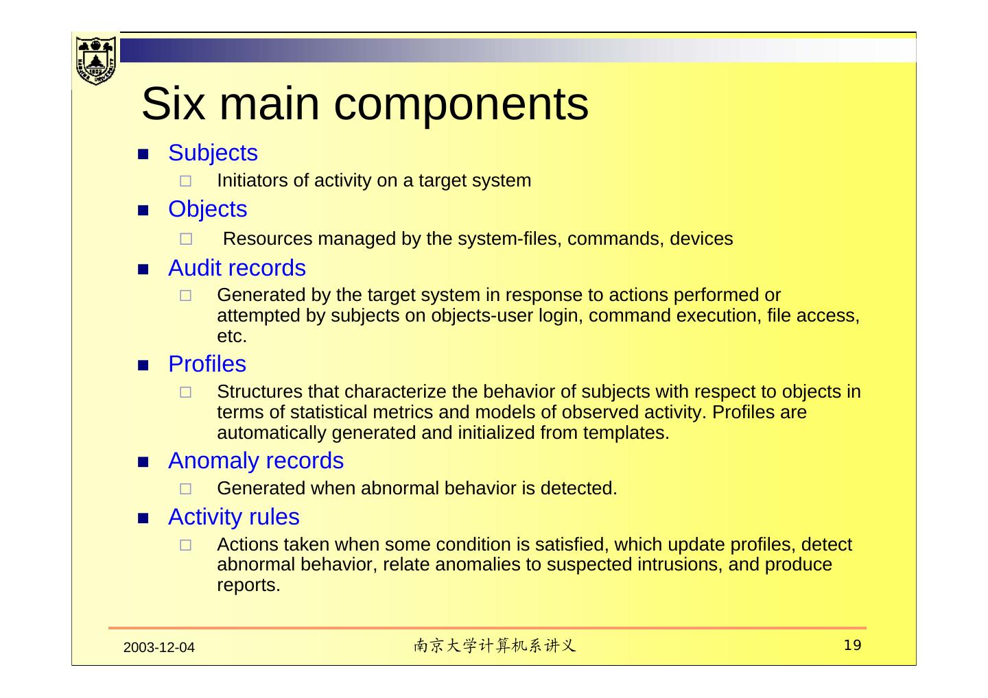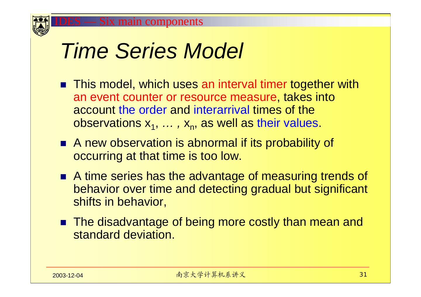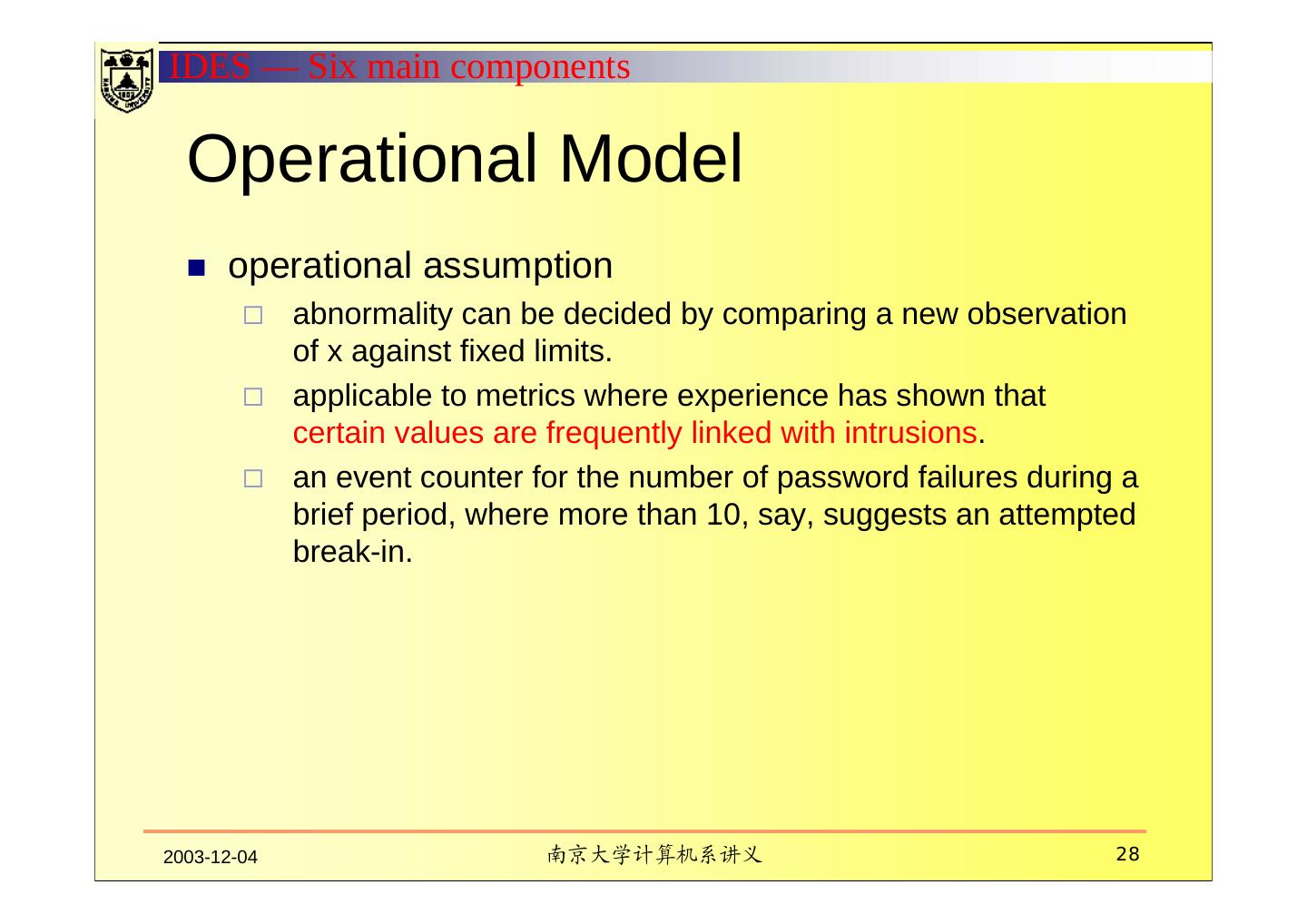 28 .IDES — Six main components Operational Model operational assumption abnormality can be decided by comparing a new observation of x against fixed limits. applicable to metrics where experience has shown that certain values are frequently linked with intrusions. an event counter for the number of password failures during a brief period, where more than 10, say, suggests an attempted break-in. 2003-12-04 南京大学计算机系讲义 28