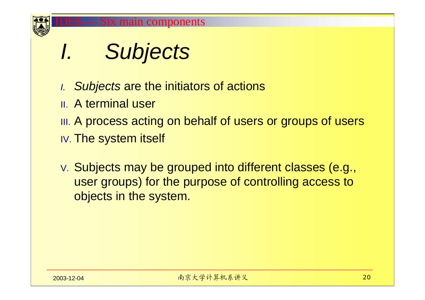 20 .IDES — Six main components I. Subjects I. Subjects are the initiators of actions II. A terminal user III. A process acting on behalf of users or groups of users IV. The system itself V. Subjects may be grouped into different classes (e.g., user groups) for the purpose of controlling access to objects in the system. 2003-12-04 南京大学计算机系讲义 20