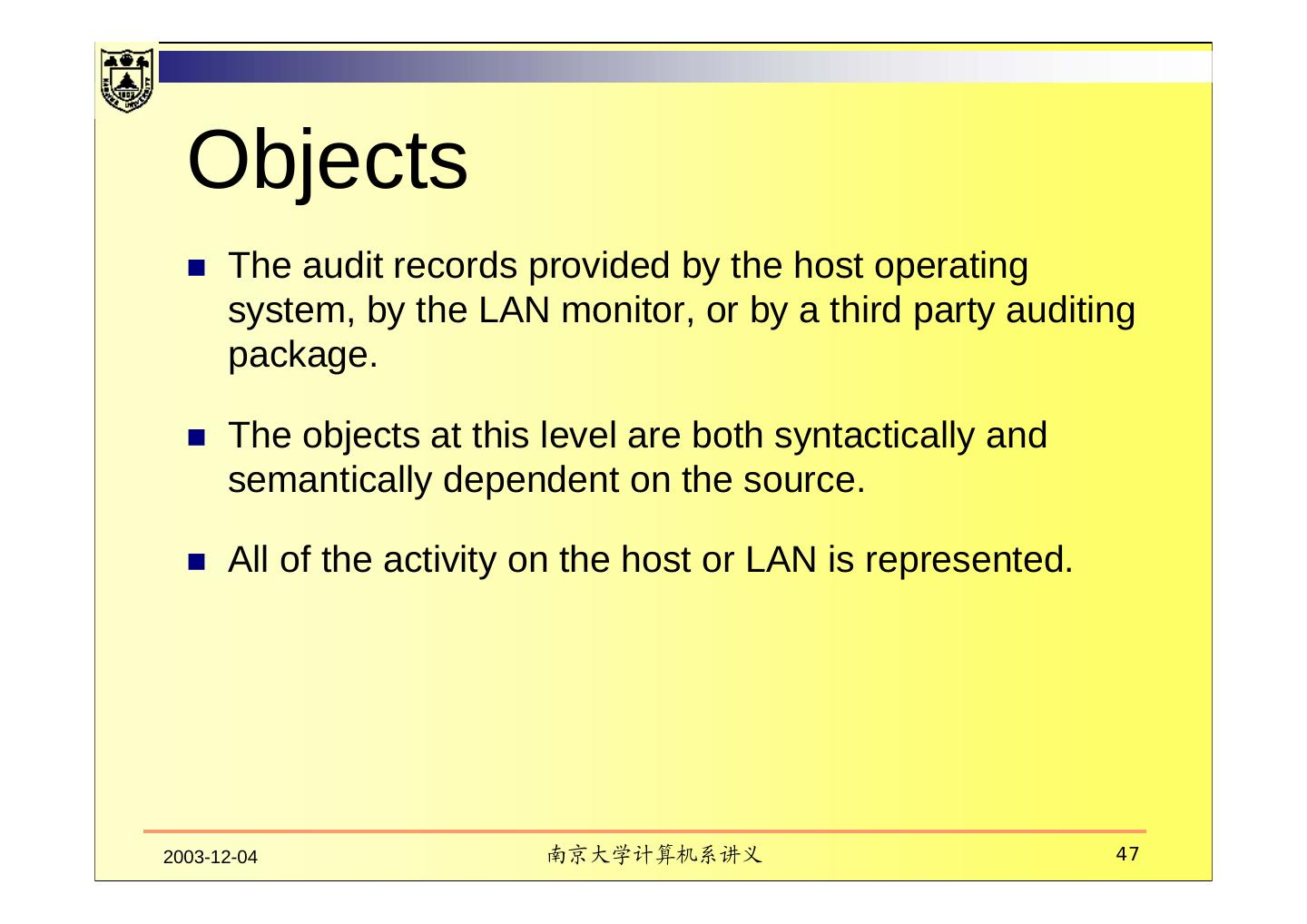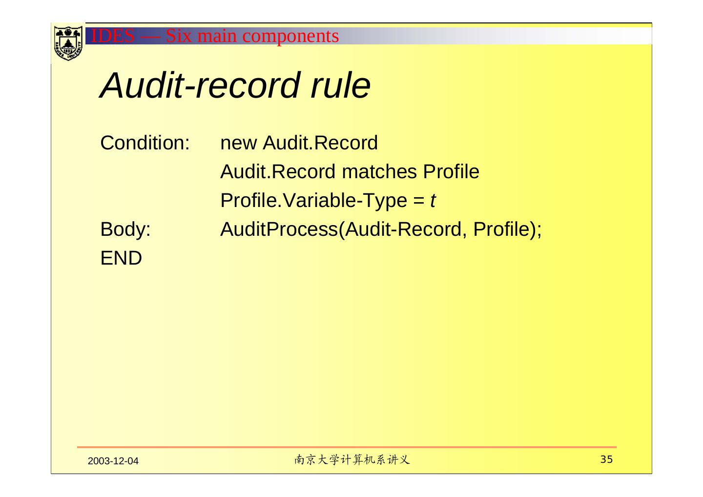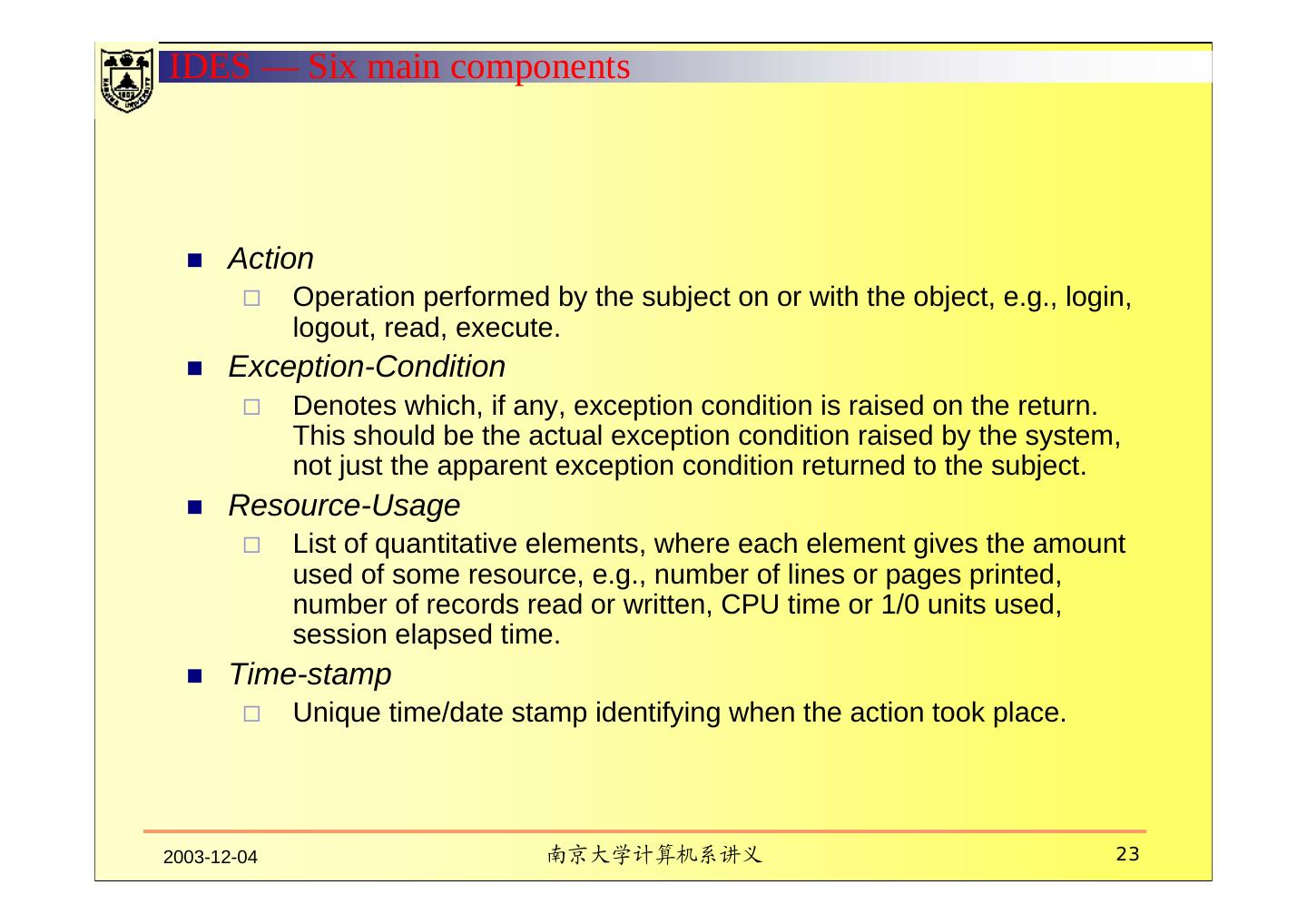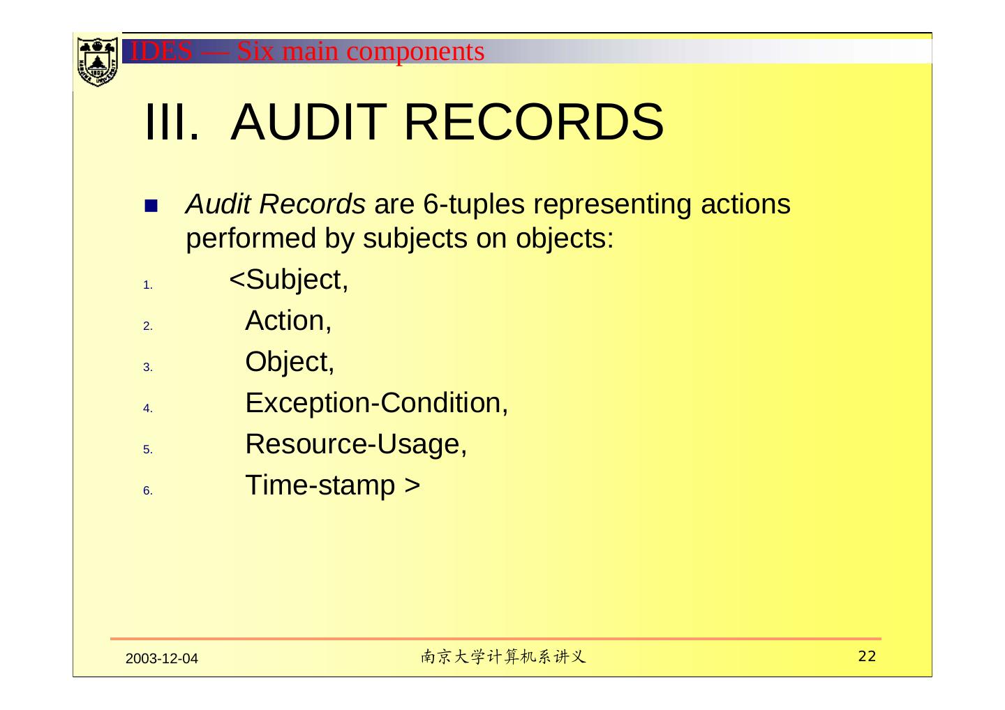 22 .IDES — Six main components III. AUDIT RECORDS Audit Records are 6-tuples representing actions performed by subjects on objects: 1. <Subject, 2. Action, 3. Object, 4. Exception-Condition, 5. Resource-Usage, 6. Time-stamp > 2003-12-04 南京大学计算机系讲义 22