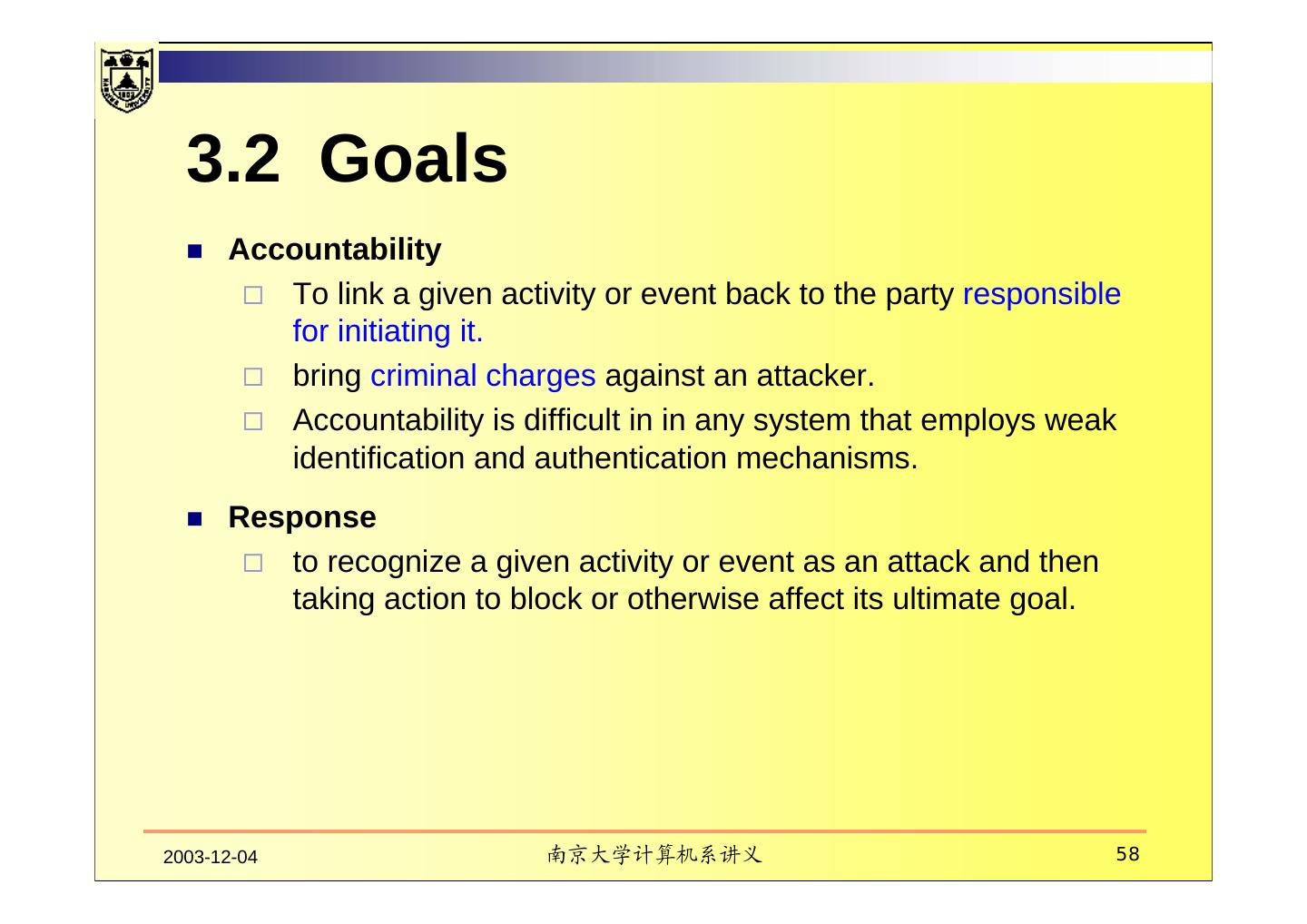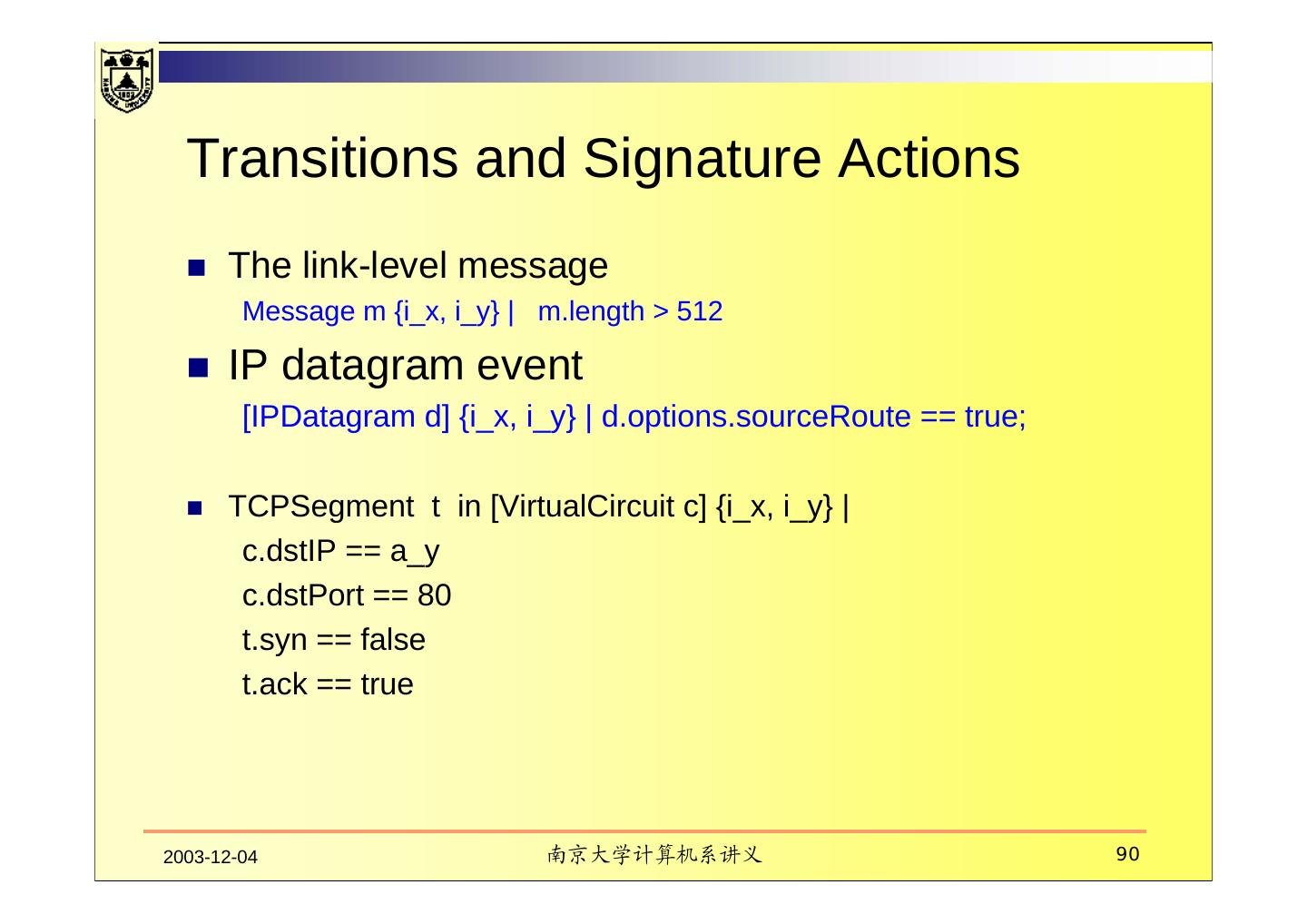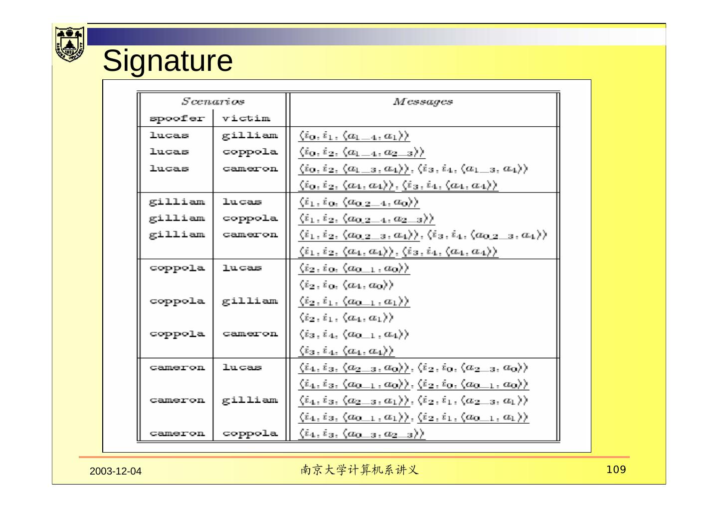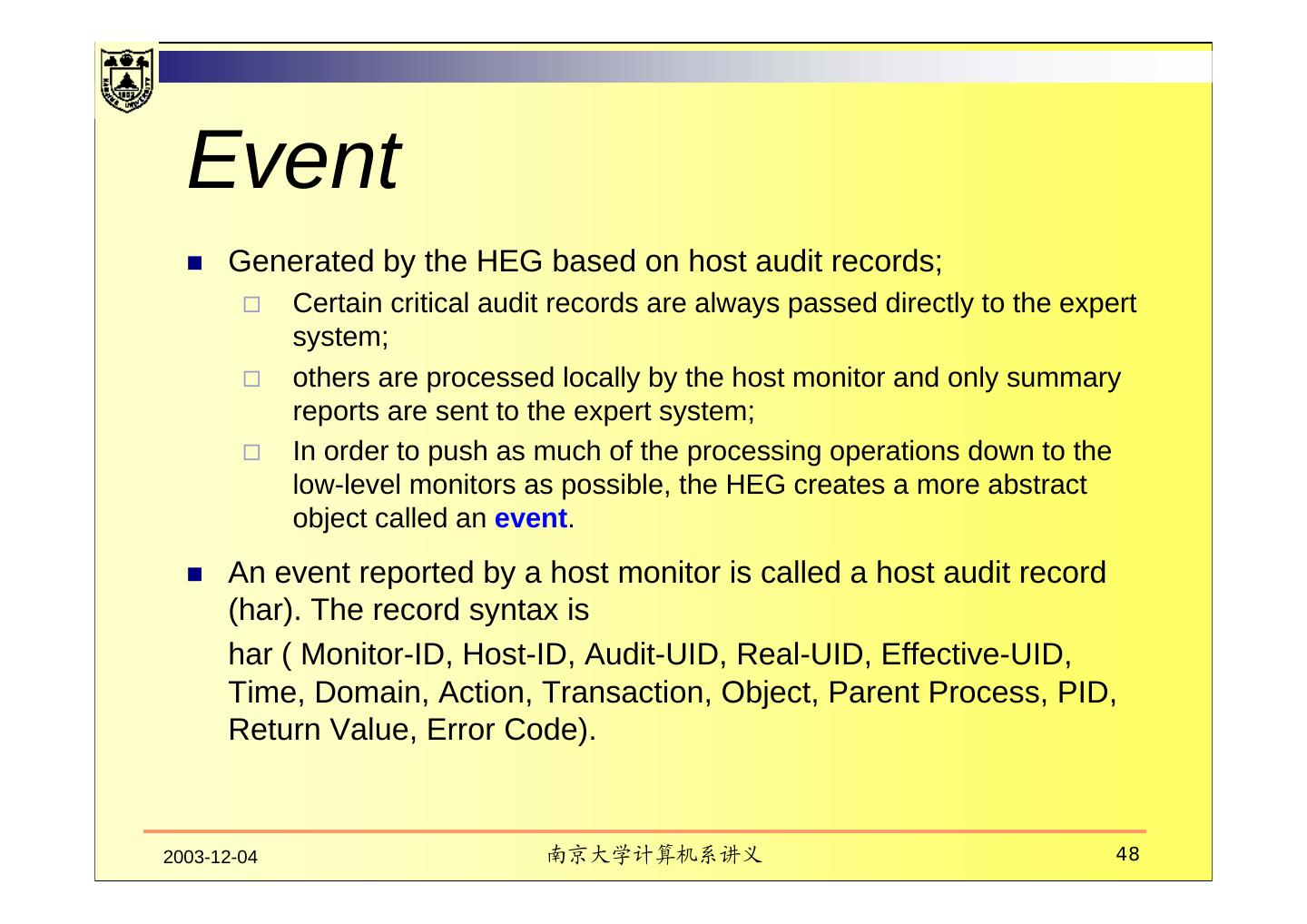 22 .IDES — Six main components III. AUDIT RECORDS Audit Records are 6-tuples representing actions performed by subjects on objects: 1. <Subject, 2. Action, 3. Object, 4. Exception-Condition, 5. Resource-Usage, 6. Time-stamp > 2003-12-04 南京大学计算机系讲义 22