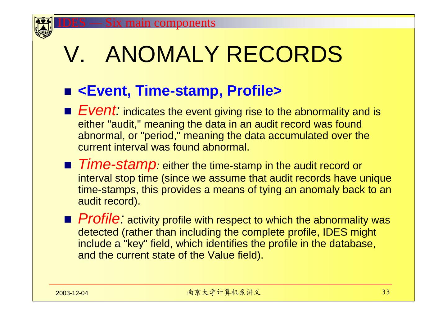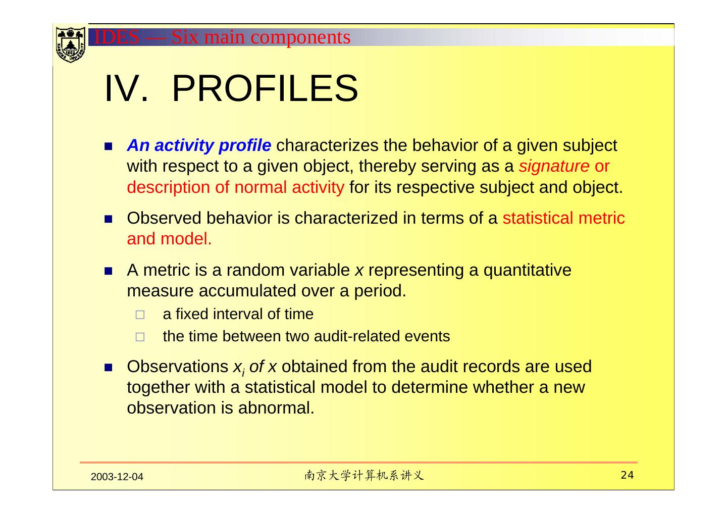 24 .IDES — Six main components IV. PROFILES An activity profile characterizes the behavior of a given subject with respect to a given object, thereby serving as a signature or description of normal activity for its respective subject and object. Observed behavior is characterized in terms of a statistical metric and model. A metric is a random variable x representing a quantitative measure accumulated over a period. a fixed interval of time the time between two audit-related events Observations xi of x obtained from the audit records are used together with a statistical model to determine whether a new observation is abnormal. 2003-12-04 南京大学计算机系讲义 24