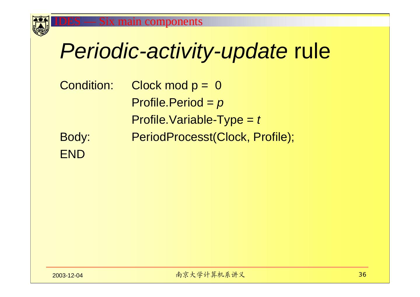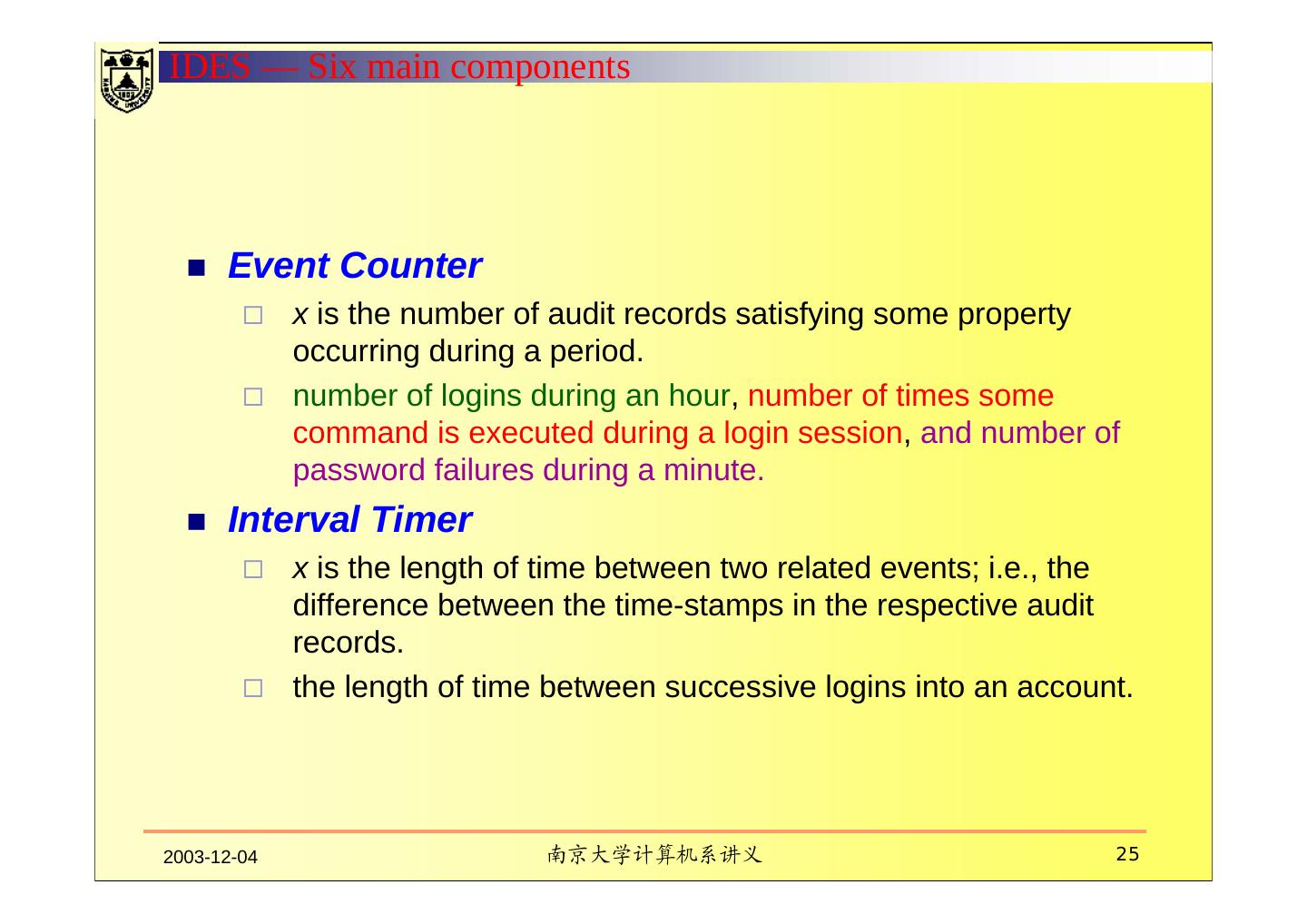 25 .IDES — Six main components Event Counter x is the number of audit records satisfying some property occurring during a period. number of logins during an hour, number of times some command is executed during a login session, and number of password failures during a minute. Interval Timer x is the length of time between two related events; i.e., the difference between the time-stamps in the respective audit records. the length of time between successive logins into an account. 2003-12-04 南京大学计算机系讲义 25