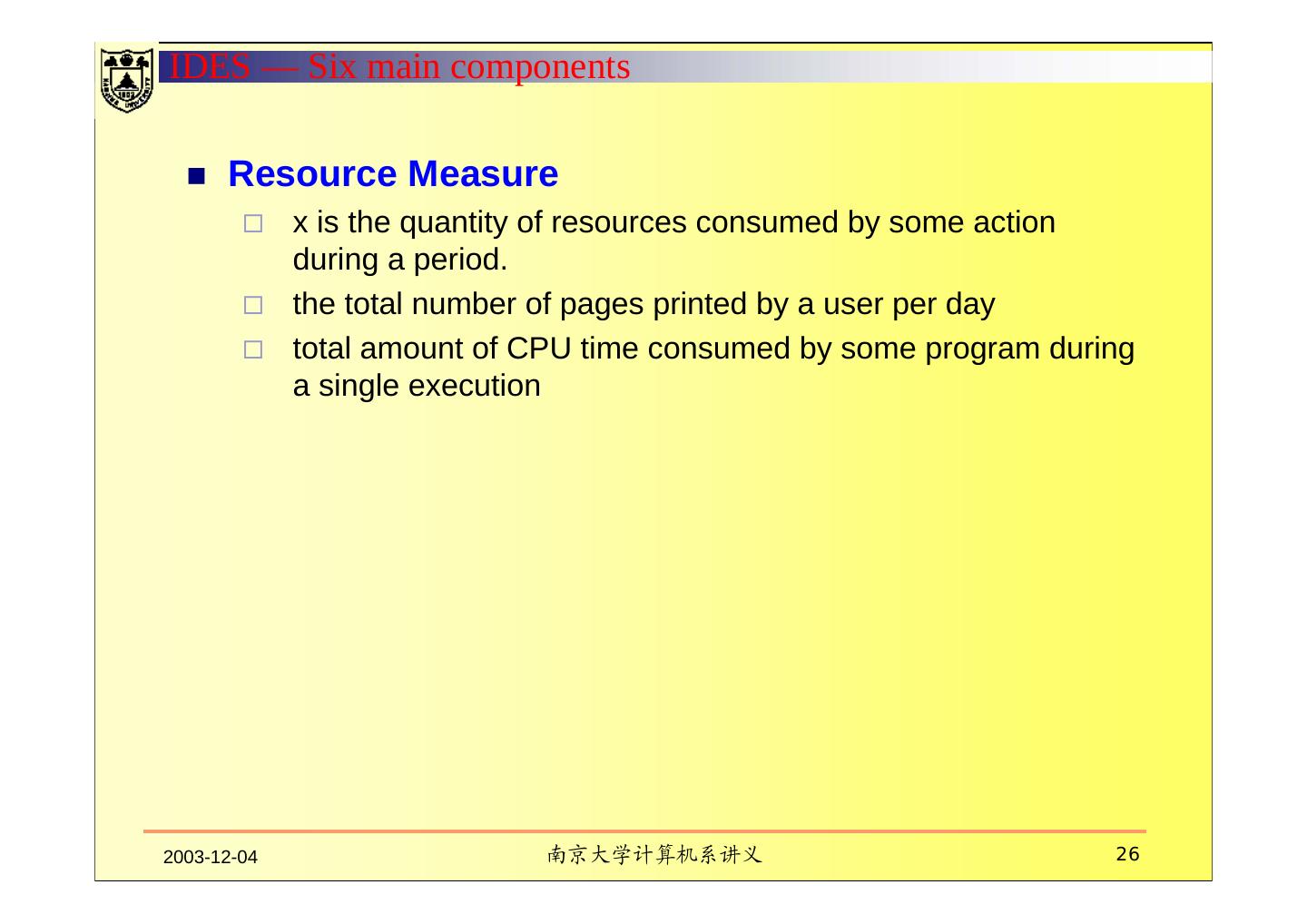 26 .IDES — Six main components Resource Measure x is the quantity of resources consumed by some action during a period. the total number of pages printed by a user per day total amount of CPU time consumed by some program during a single execution 2003-12-04 南京大学计算机系讲义 26