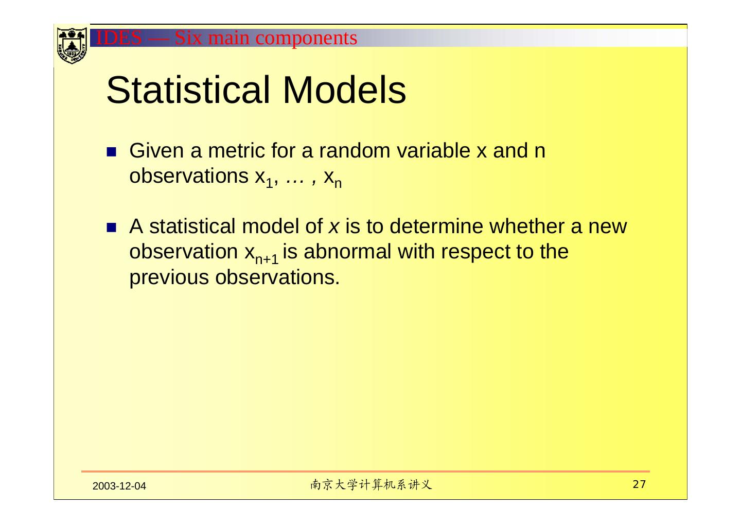 27 .IDES — Six main components Statistical Models Given a metric for a random variable x and n observations x1, … , xn A statistical model of x is to determine whether a new observation xn+1 is abnormal with respect to the previous observations. 2003-12-04 南京大学计算机系讲义 27