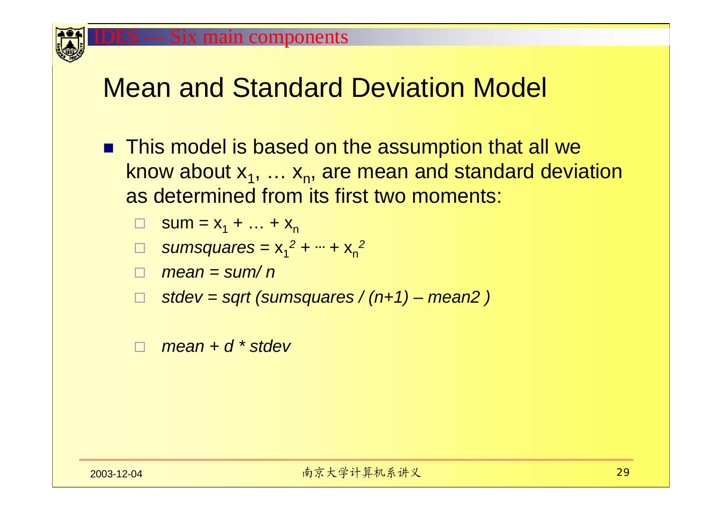 29 .IDES — Six main components Mean and Standard Deviation Model This model is based on the assumption that all we know about x1, … xn, are mean and standard deviation as determined from its first two moments: sum = x1 + … + xn sumsquares = x12 + … + xn2 mean = sum/ n stdev = sqrt (sumsquares / (n+1) – mean2 ) mean + d * stdev 2003-12-04 南京大学计算机系讲义 29