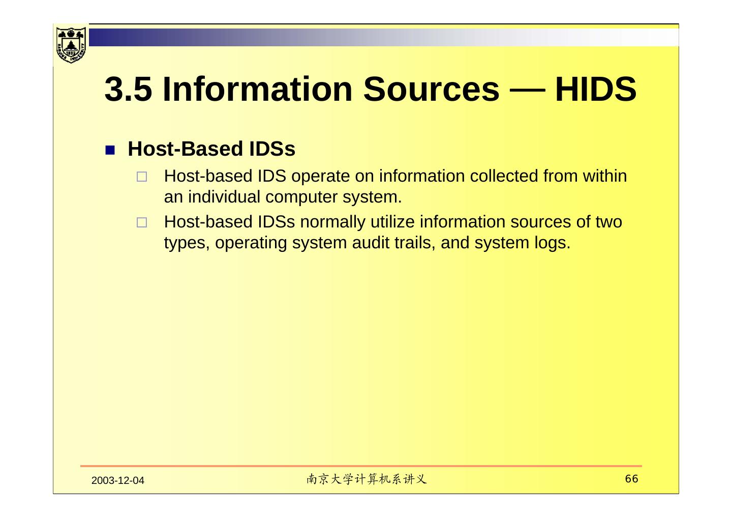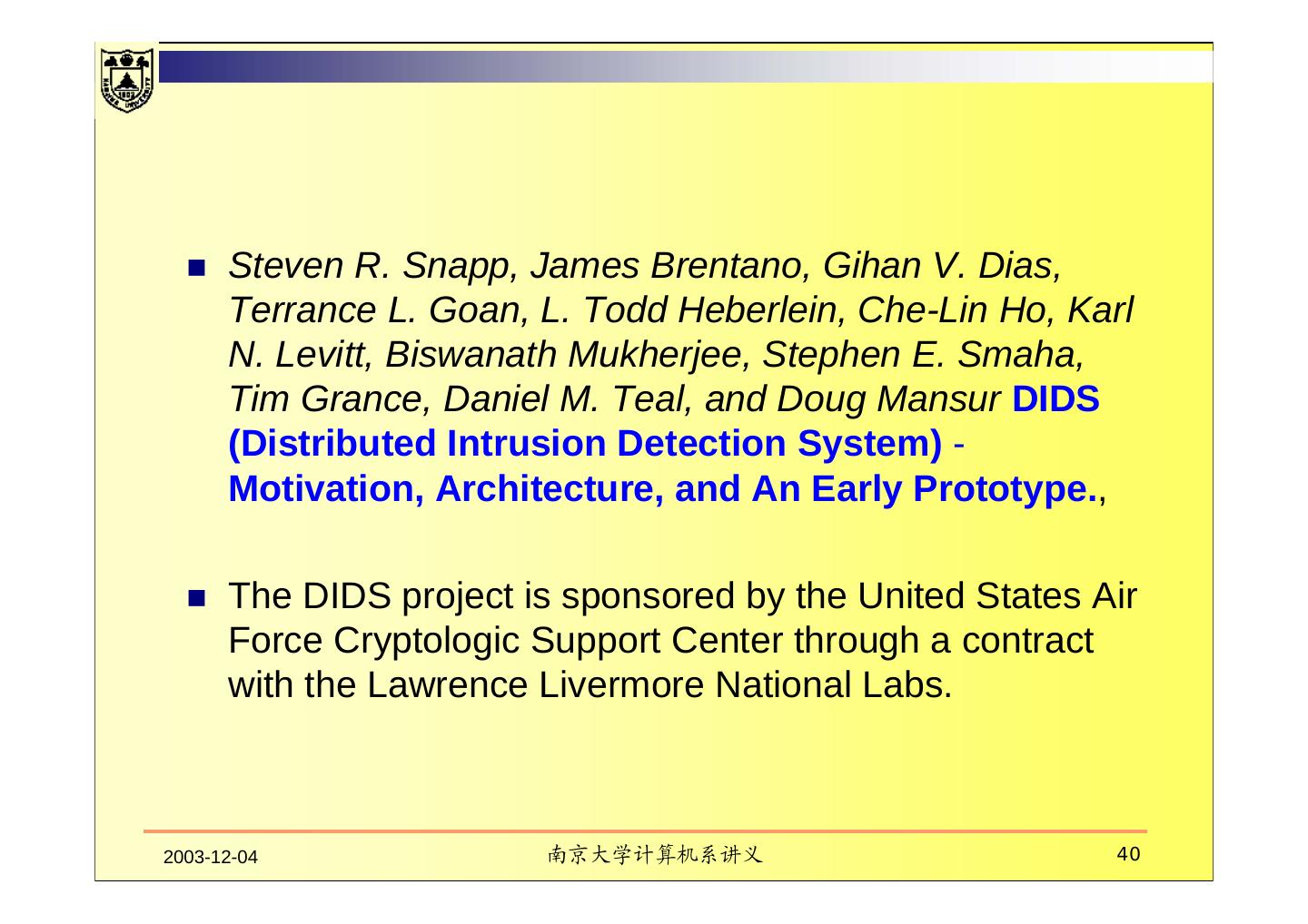 2 . References [1] Rebecca Bace, Peter Mell, Intrusion Detection Systems, NIST Special Publication on Intrusion Detection Systems; [2] Dorothy E. Denning, An Intrusion-Detection Model, IEEE Trans. Software Engineering, Vol. SE-13, No. 2, 1987, pp222-232. [3] Steven R. Snapp, et al. , DIDS (Distributed Intrusion Detection System) - Motivation, Architecture, and An Early Prototype. 2003-12-04 南京大学计算机系讲义 2