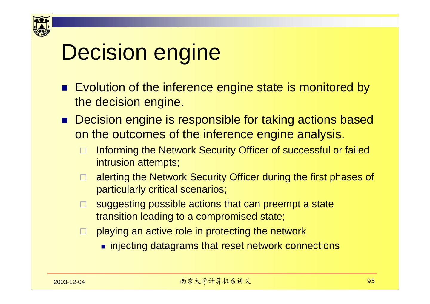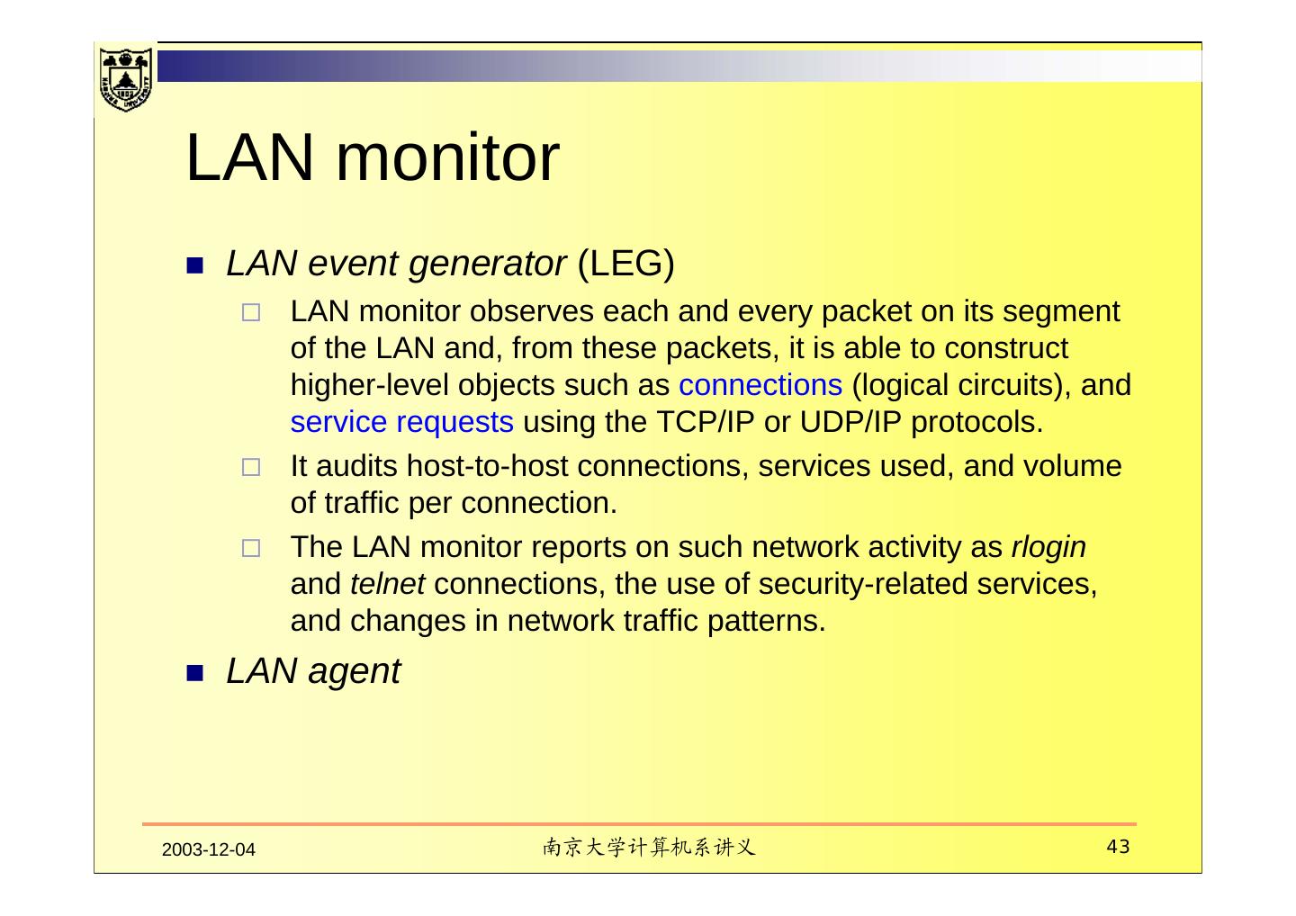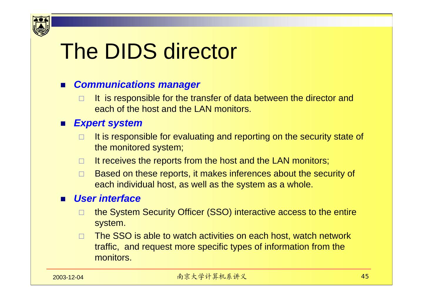 13 . 2.1 Intrusion Detection Expert System (IDES) Dorothy E. Denning, An Intrusion-Detection Model, IEEE Trans. Software Engineering, Vol. SE-13, No. 2, 1987, pp222-232. 2003-12-04 南京大学计算机系讲义 13