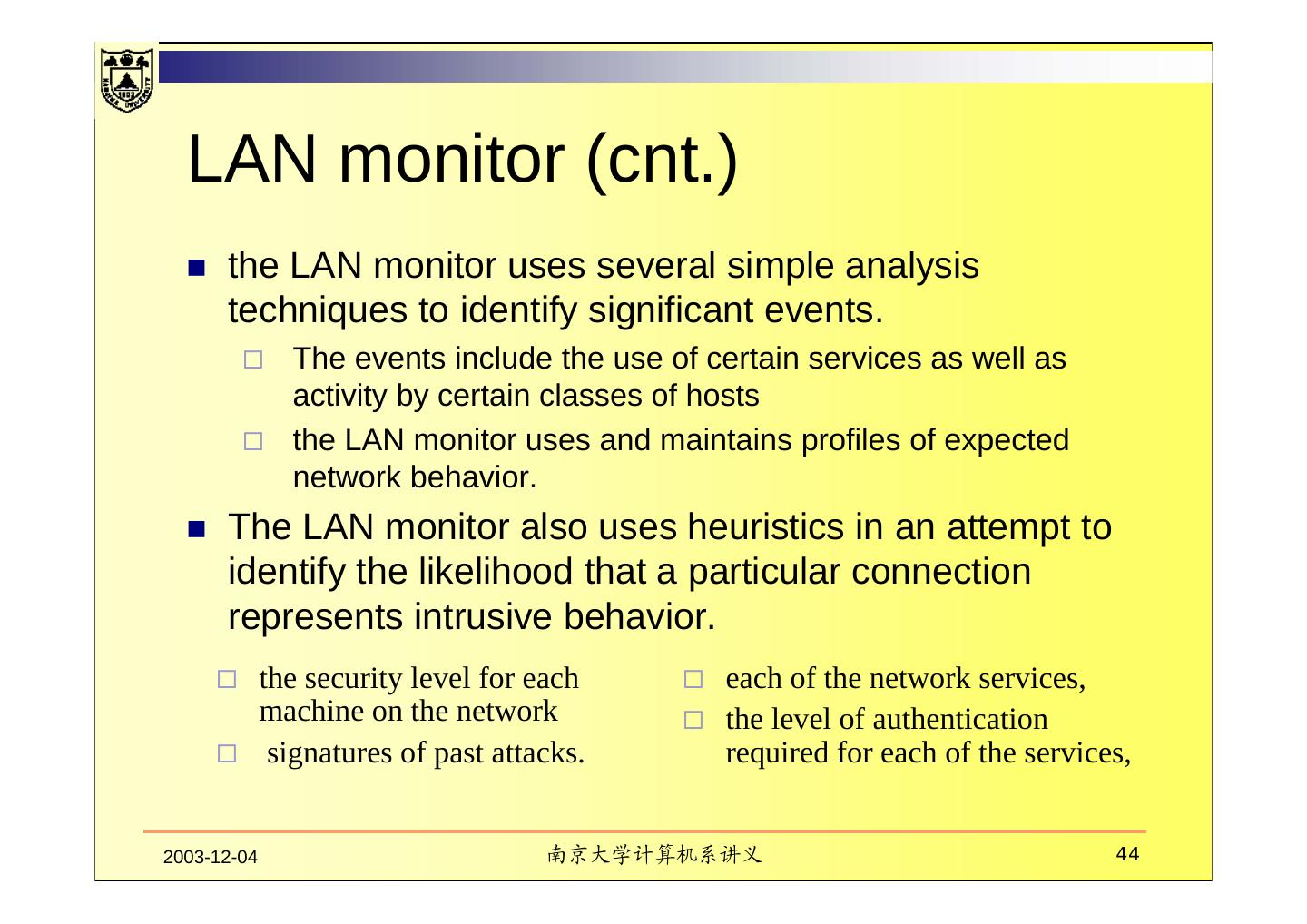 19 . Six main components Subjects Initiators of activity on a target system Objects Resources managed by the system-files, commands, devices Audit records Generated by the target system in response to actions performed or attempted by subjects on objects-user login, command execution, file access, etc. Profiles Structures that characterize the behavior of subjects with respect to objects in terms of statistical metrics and models of observed activity. Profiles are automatically generated and initialized from templates. Anomaly records Generated when abnormal behavior is detected. Activity rules Actions taken when some condition is satisfied, which update profiles, detect abnormal behavior, relate anomalies to suspected intrusions, and produce reports. 2003-12-04 南京大学计算机系讲义 19