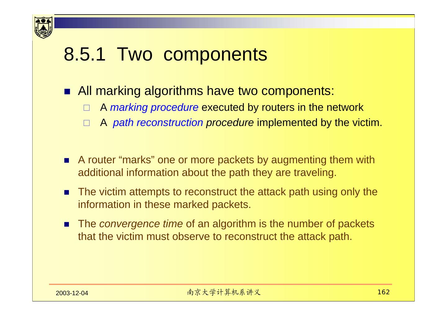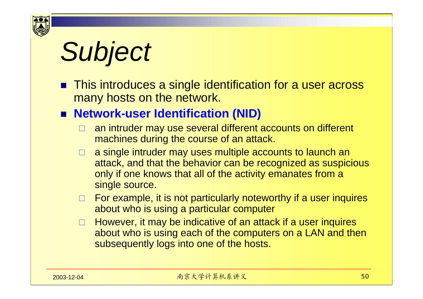 17 . Hypothesis Examples(3) Inference by legitimate user A user attempting to obtain unauthorized data from a database through aggregation and inference might retrieve more records than usual. Trojan horse The behavior of a Trojan horse planted in or substituted for a program may differ from the legitimate program in terms of its CPU time or 1/0 activity. Denial-of-Service An intruder able to monopolize a resource (e.g., network) might have abnormally high activity with respect to the resource, while activity for all other users is abnormally low. 2003-12-04 南京大学计算机系讲义 17
