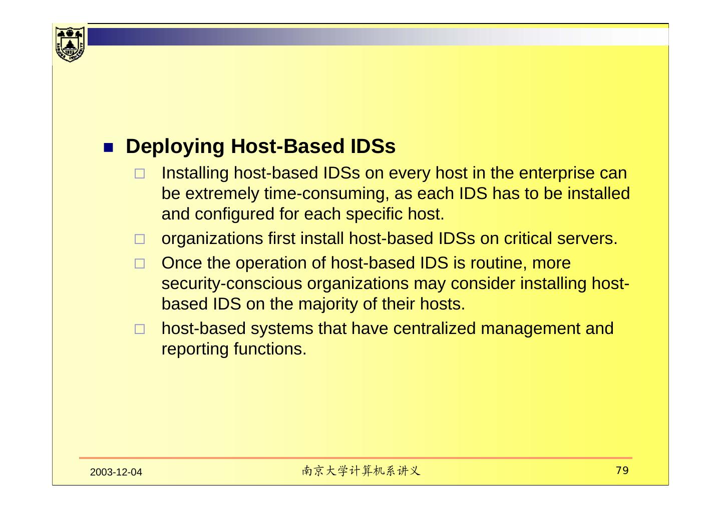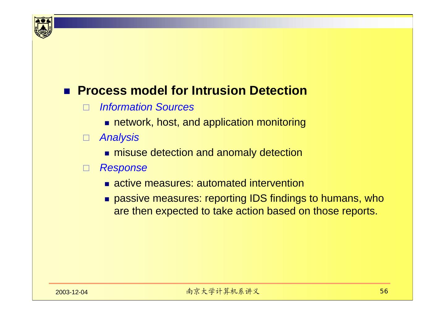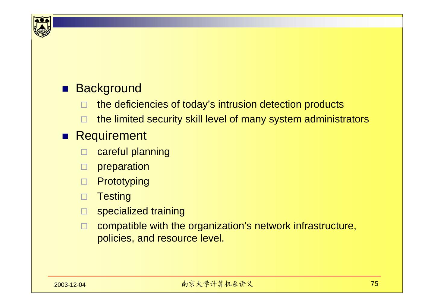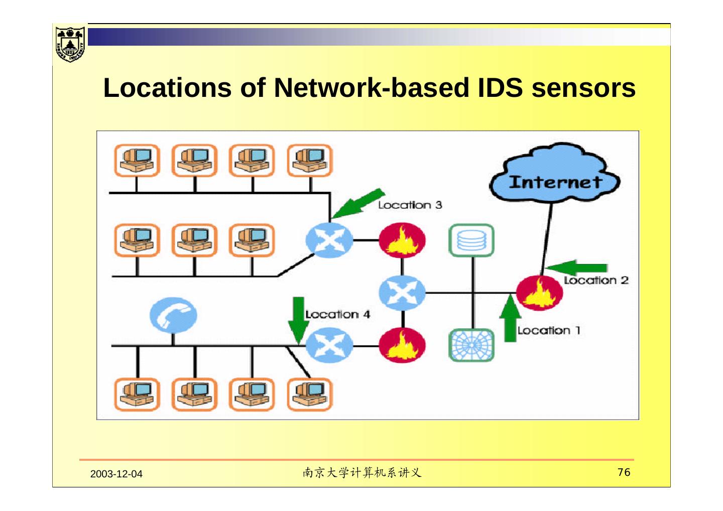 11 . Why should IDS (5) Quality control for security design and administration Highlight flaws in the design and management of security for the system Supports security management correcting those deficiencies before they cause an incident. Providing useful information about actual intrusions Collect relevant, detailed, and trustworthy information about the attack Supports incident handling and recovery efforts. 2003-12-04 南京大学计算机系讲义 11
