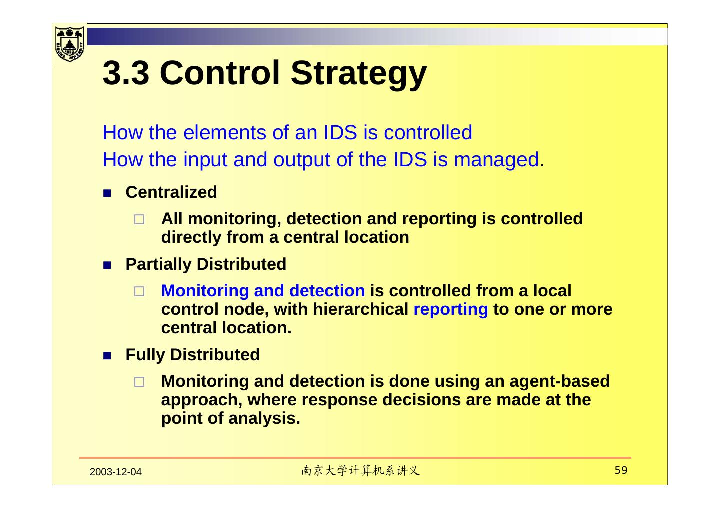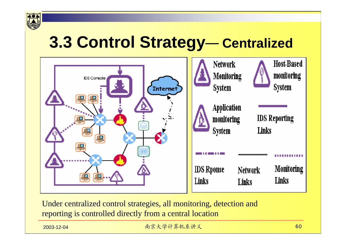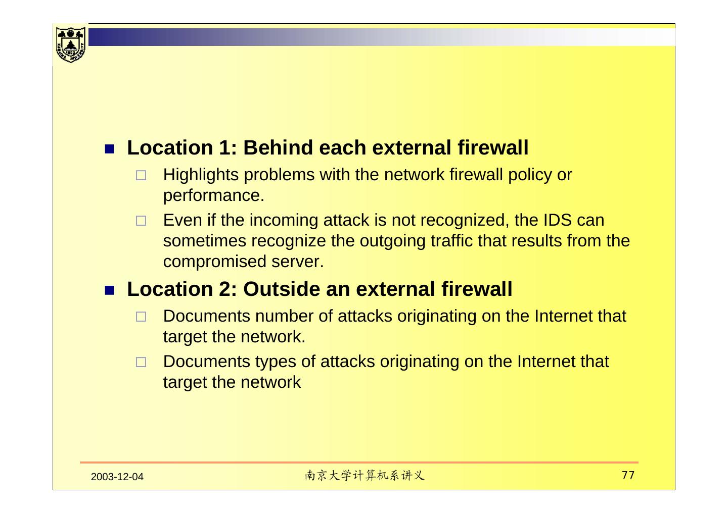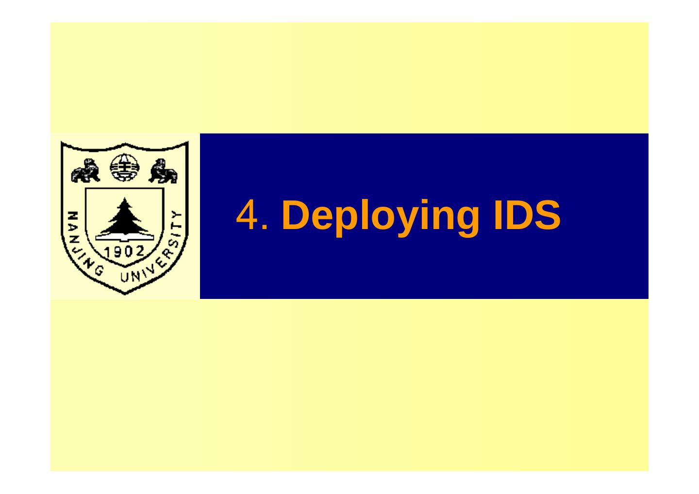 10 . Why should IDS (4) Documenting the existing threat IDS verify, itemize, and characterize the threat. Assisting you in making sound decisions regarding your allocation of computer security resources. The information from IDS regarding the source and nature of attacks, allows you to make decisions regarding security strategy. 2003-12-04 南京大学计算机系讲义 10