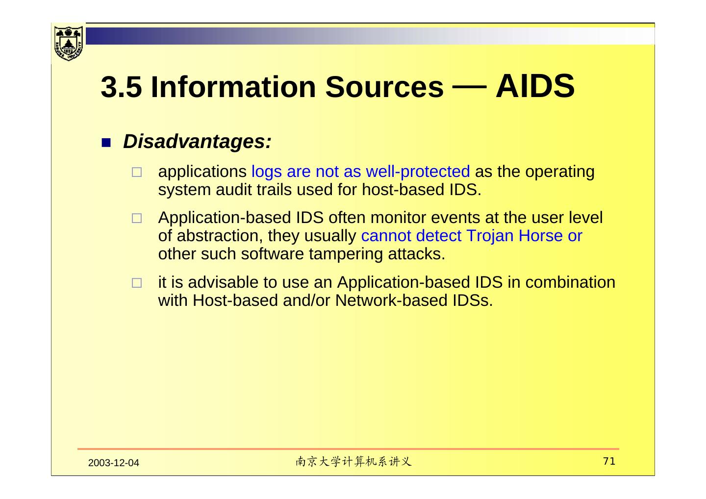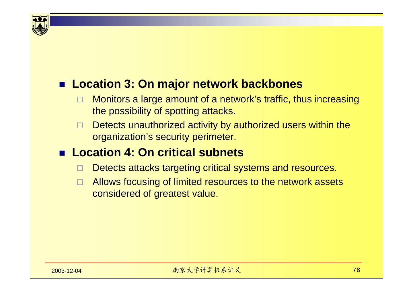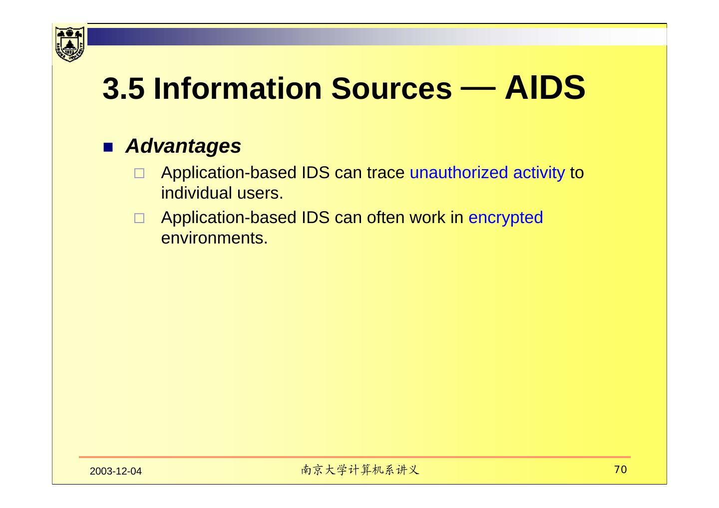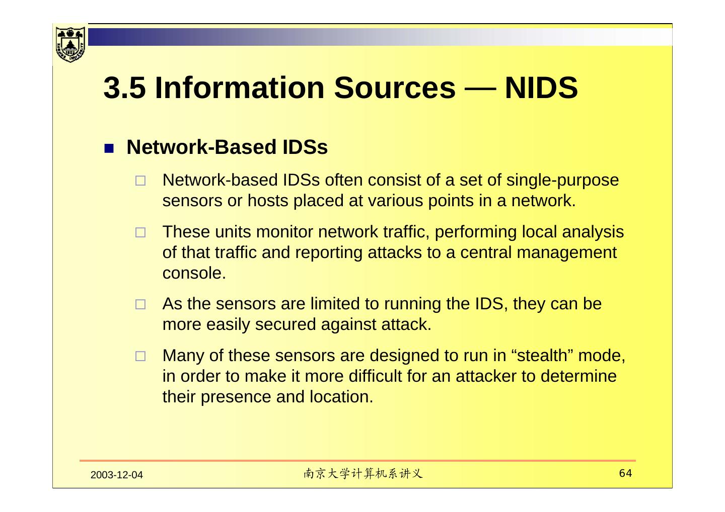 10 . Why should IDS (4) Documenting the existing threat IDS verify, itemize, and characterize the threat. Assisting you in making sound decisions regarding your allocation of computer security resources. The information from IDS regarding the source and nature of attacks, allows you to make decisions regarding security strategy. 2003-12-04 南京大学计算机系讲义 10