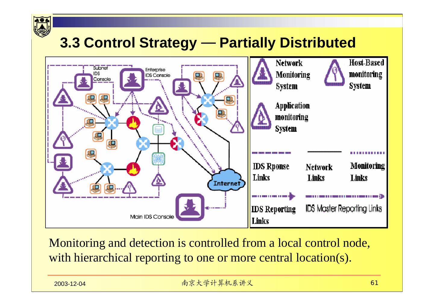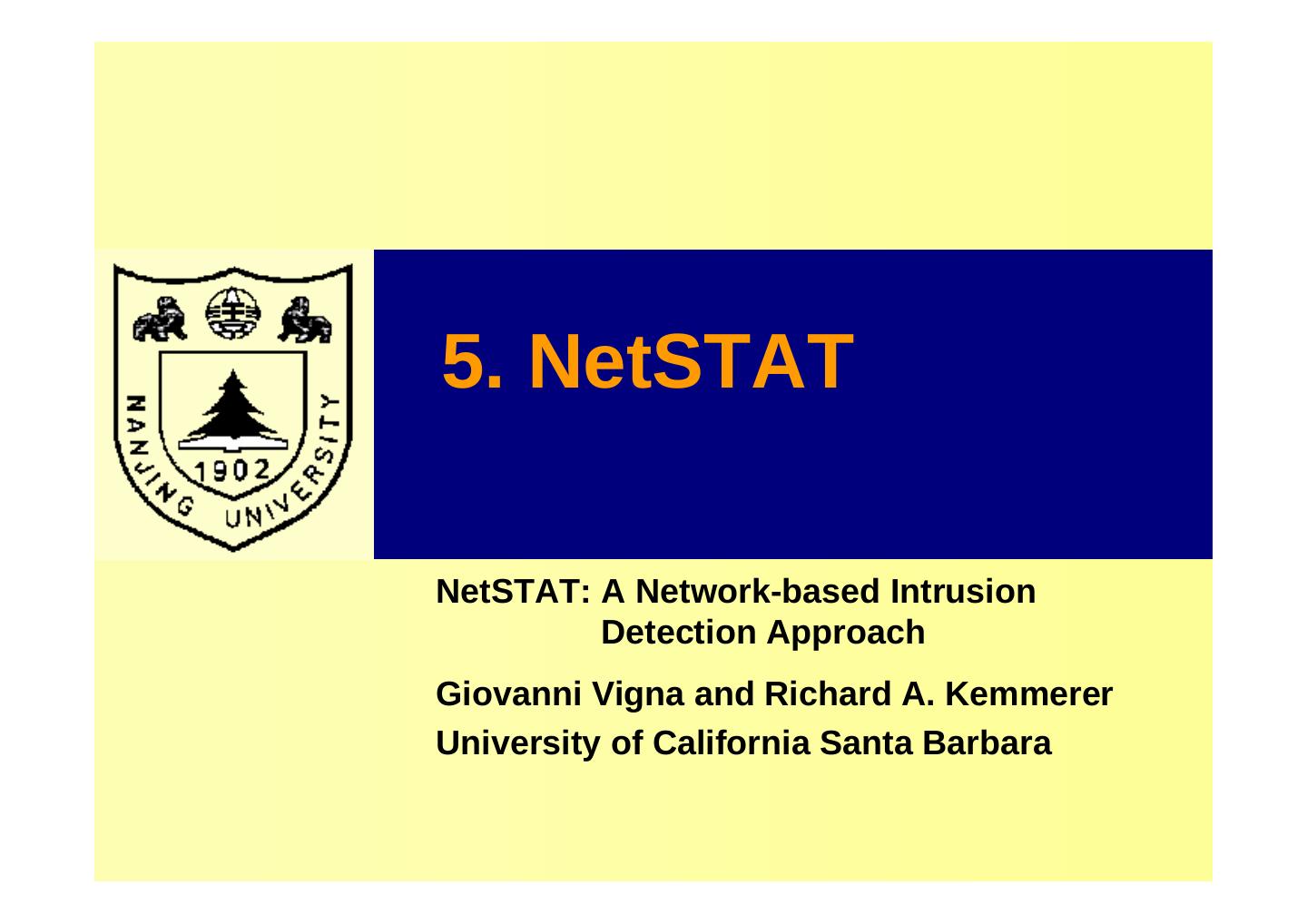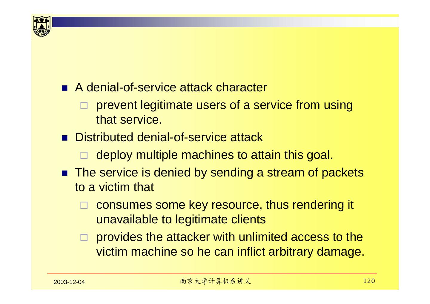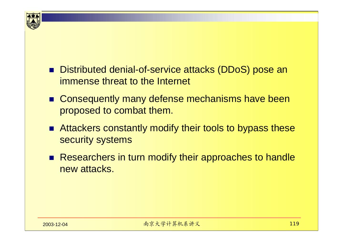 3 . [4] Jelena Mirkovic, Janice Martin and Peter Reiher, A Taxonomy of DDoS Attacks and DDoS Defense Mechanisms, Computer Science Department, University of California, Los Angeles, Technical report #020018. [5] Giovanni Vigna and Richard A. Kemmerer, NetSTAT: A Network-based Intrusion Detection Approach, Department of Computer Science, University of California Santa Barbara. 2003-12-04 南京大学计算机系讲义 3