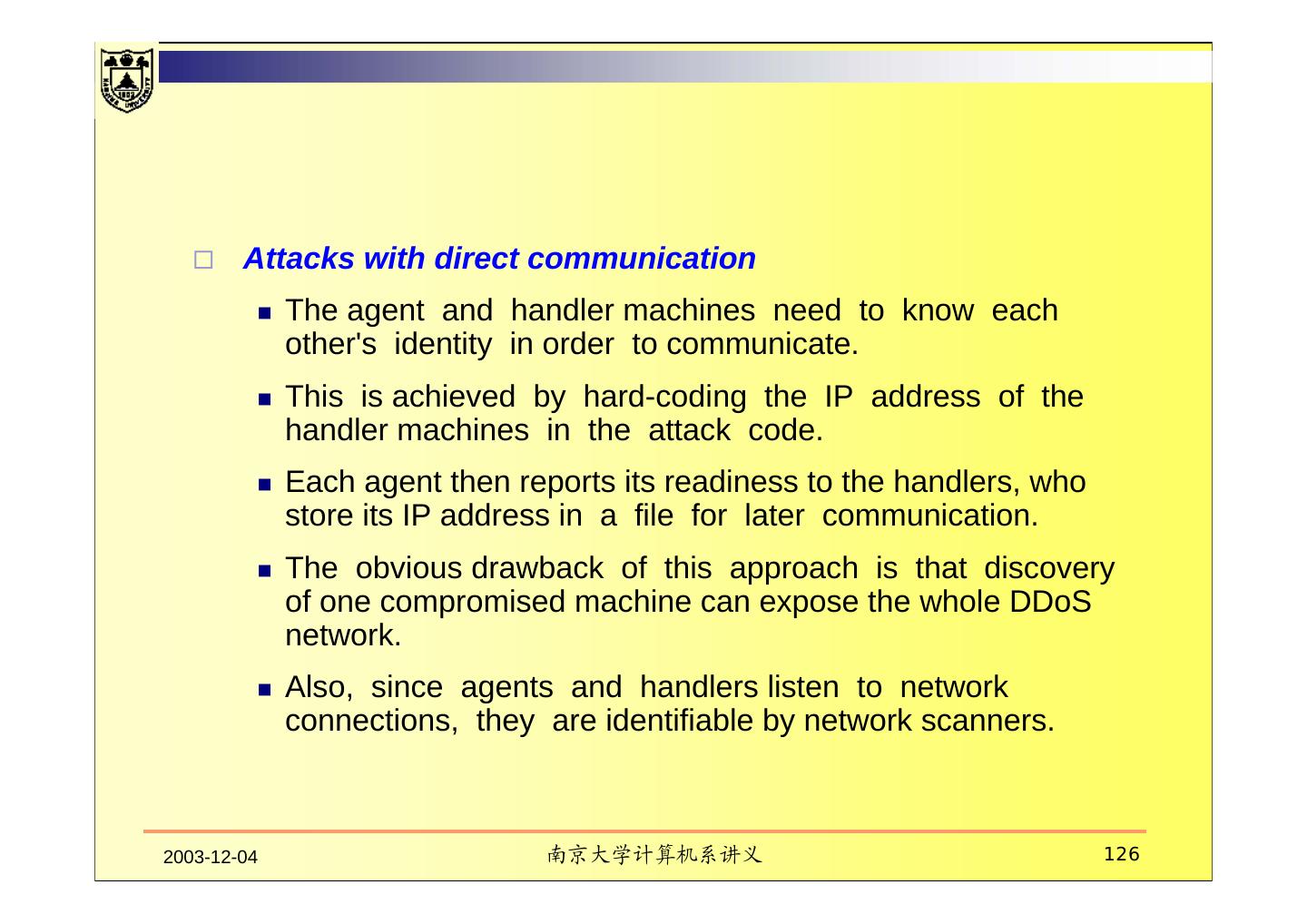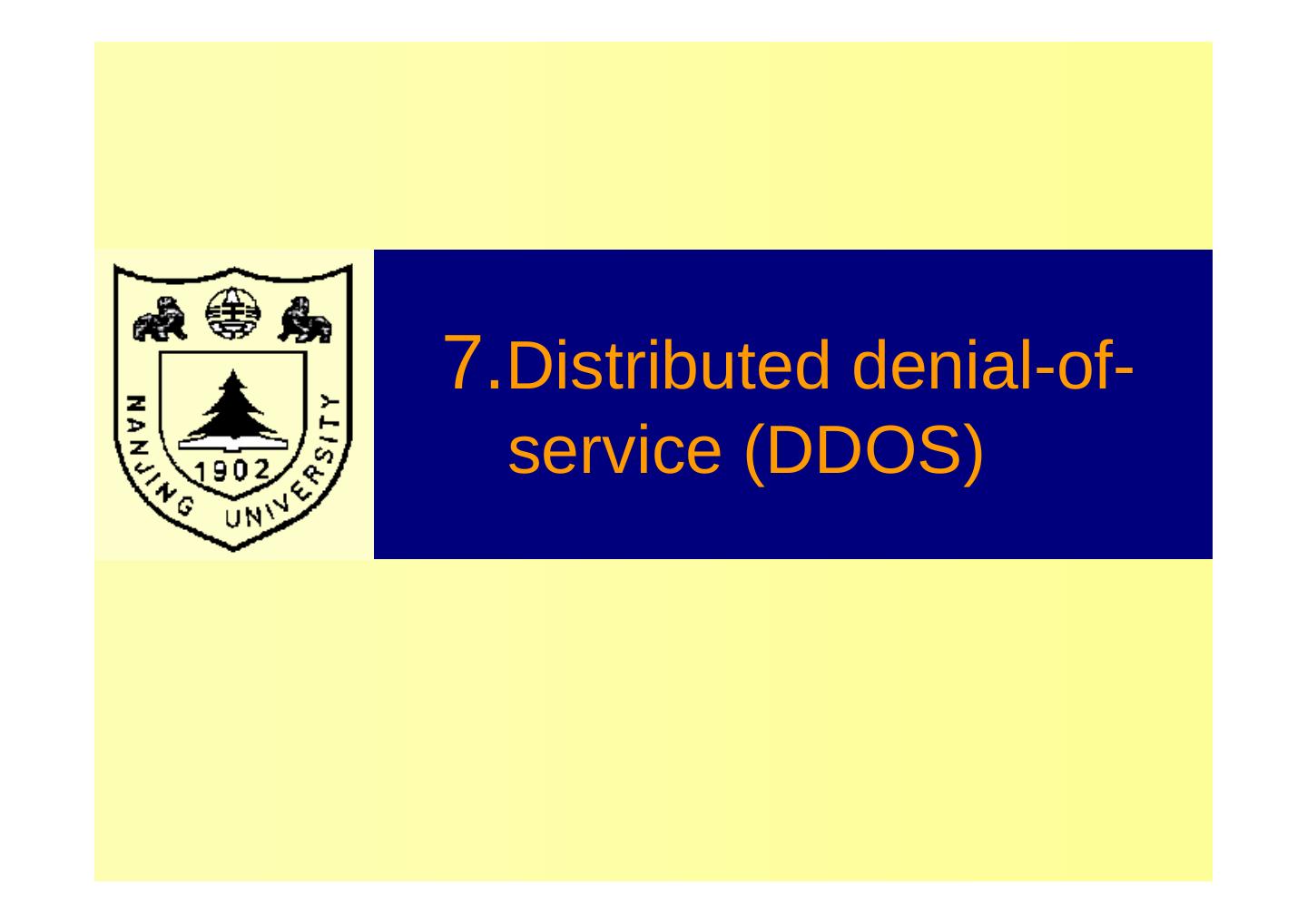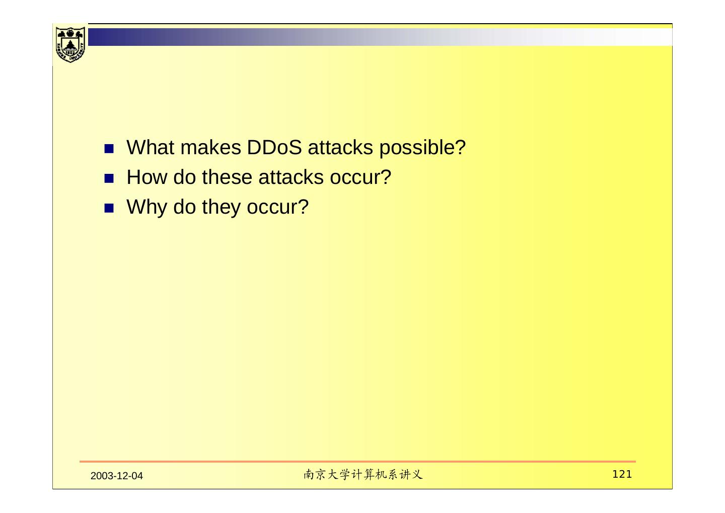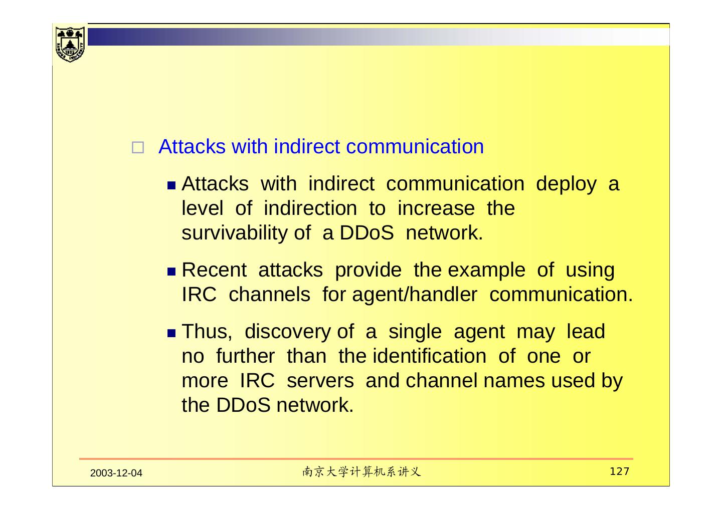 3 . [4] Jelena Mirkovic, Janice Martin and Peter Reiher, A Taxonomy of DDoS Attacks and DDoS Defense Mechanisms, Computer Science Department, University of California, Los Angeles, Technical report #020018. [5] Giovanni Vigna and Richard A. Kemmerer, NetSTAT: A Network-based Intrusion Detection Approach, Department of Computer Science, University of California Santa Barbara. 2003-12-04 南京大学计算机系讲义 3