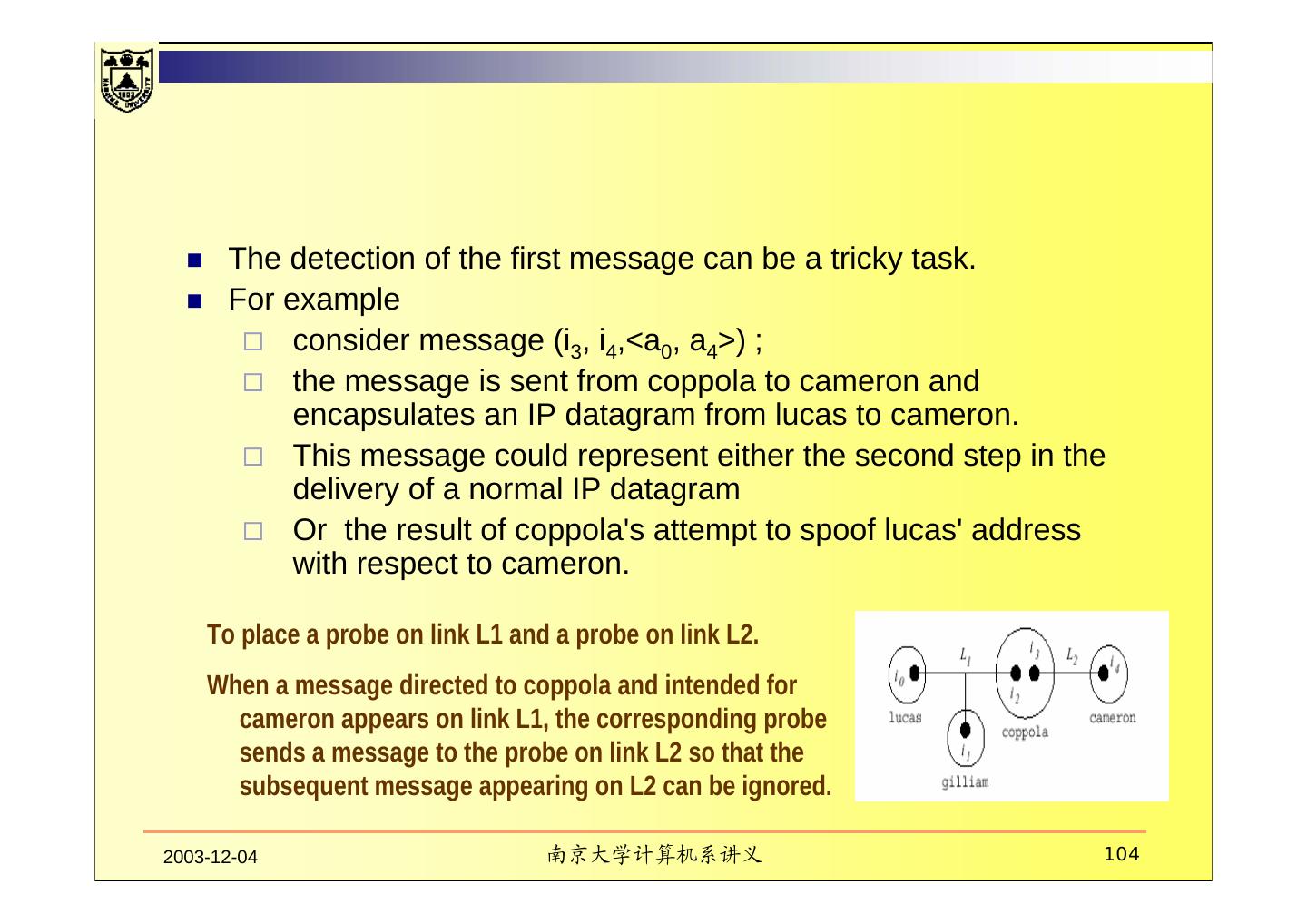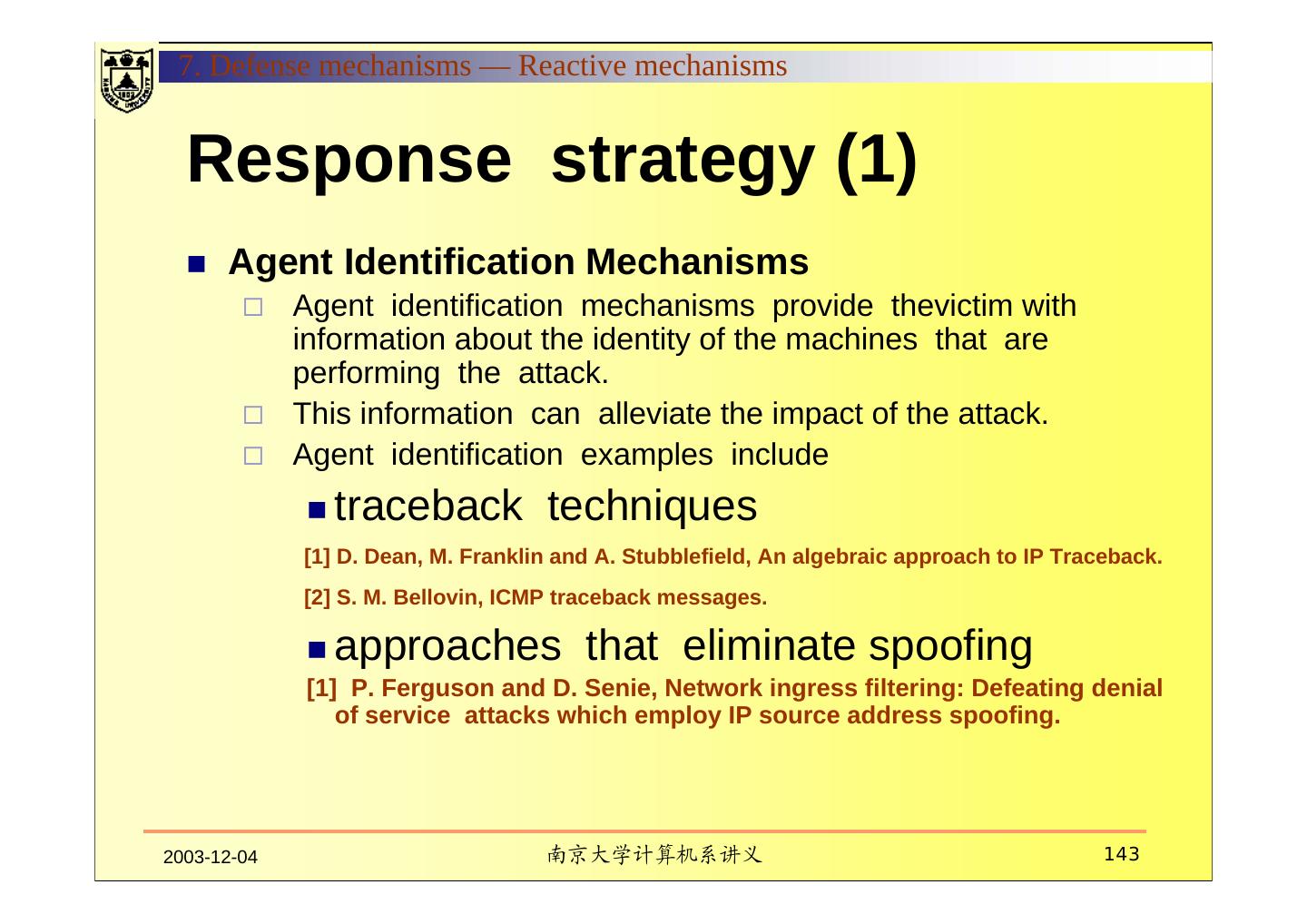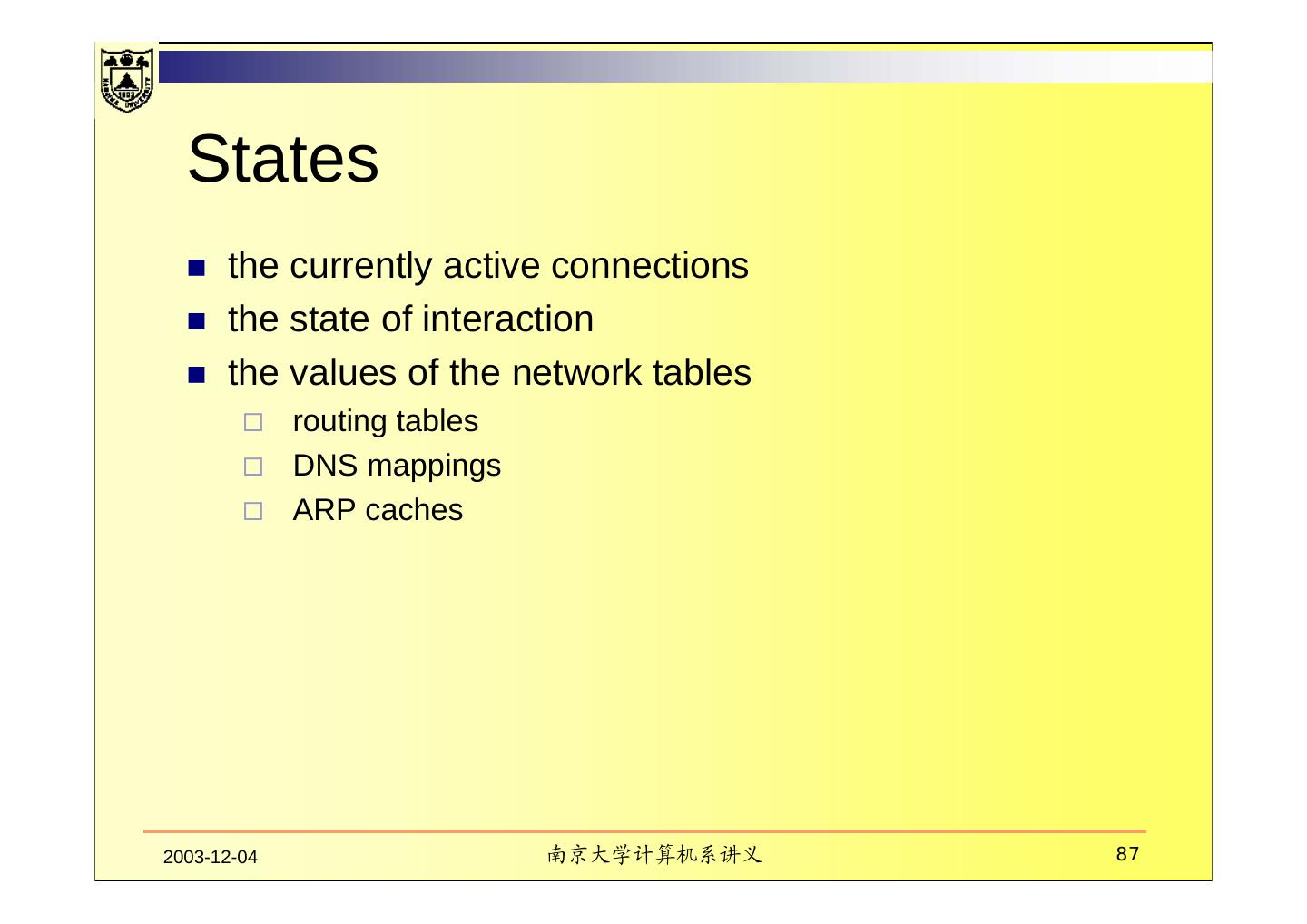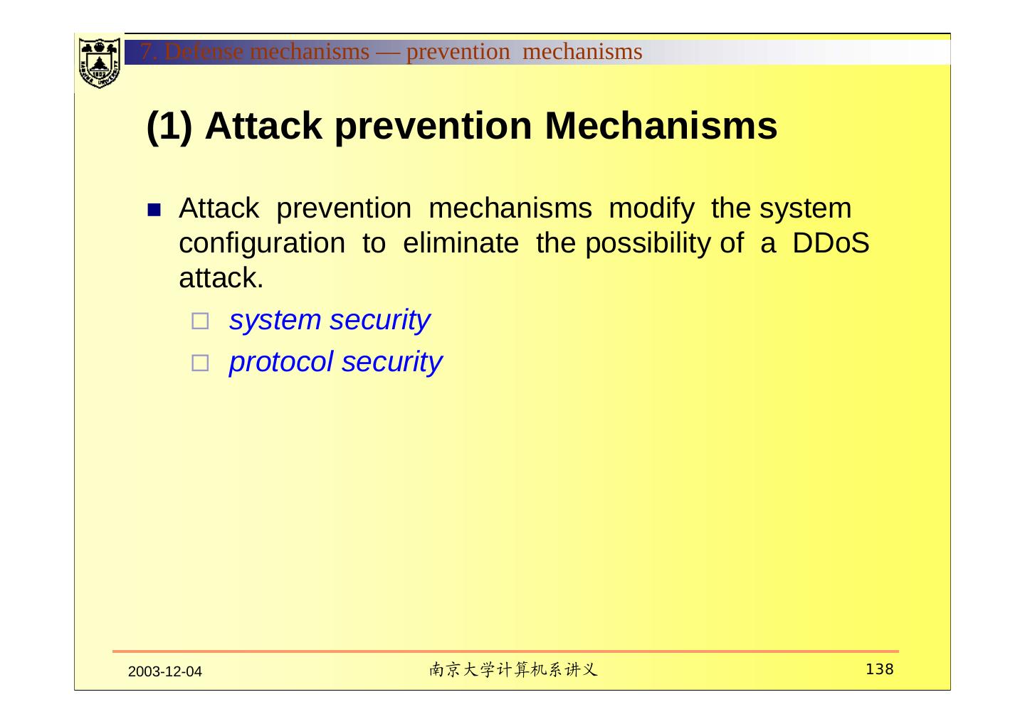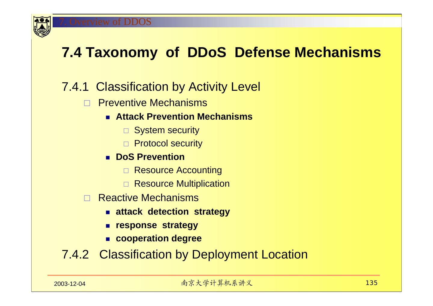 3 . [4] Jelena Mirkovic, Janice Martin and Peter Reiher, A Taxonomy of DDoS Attacks and DDoS Defense Mechanisms, Computer Science Department, University of California, Los Angeles, Technical report #020018. [5] Giovanni Vigna and Richard A. Kemmerer, NetSTAT: A Network-based Intrusion Detection Approach, Department of Computer Science, University of California Santa Barbara. 2003-12-04 南京大学计算机系讲义 3