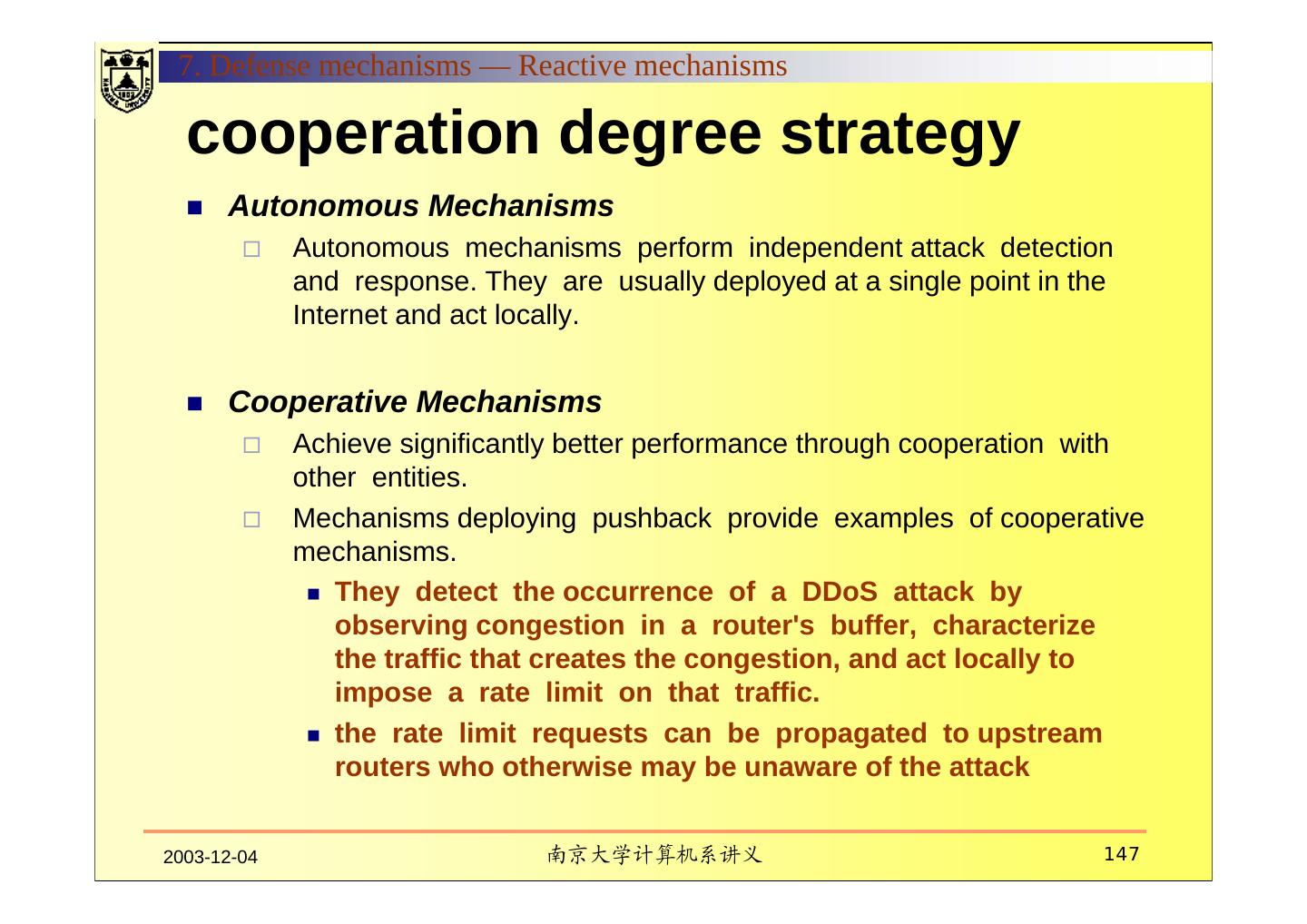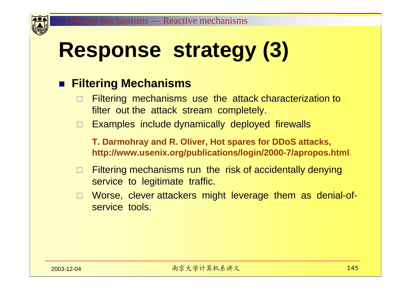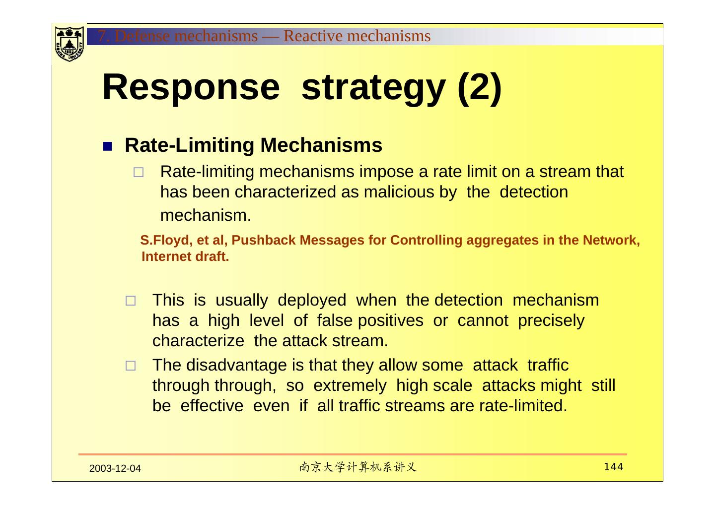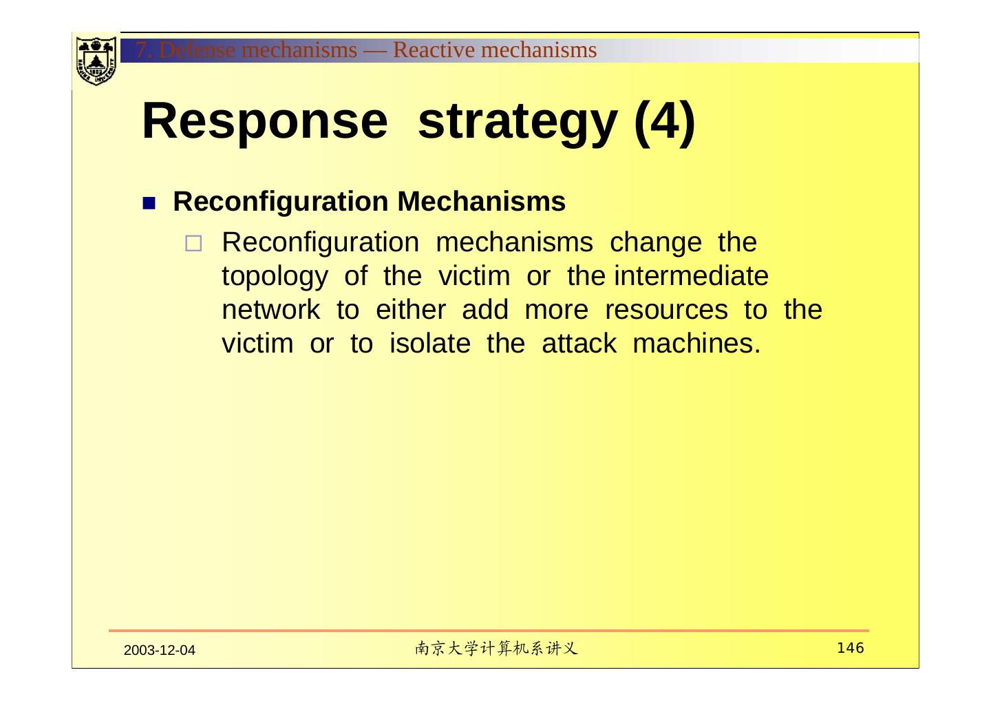 3 . [4] Jelena Mirkovic, Janice Martin and Peter Reiher, A Taxonomy of DDoS Attacks and DDoS Defense Mechanisms, Computer Science Department, University of California, Los Angeles, Technical report #020018. [5] Giovanni Vigna and Richard A. Kemmerer, NetSTAT: A Network-based Intrusion Detection Approach, Department of Computer Science, University of California Santa Barbara. 2003-12-04 南京大学计算机系讲义 3