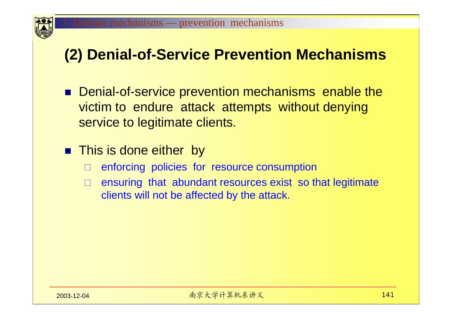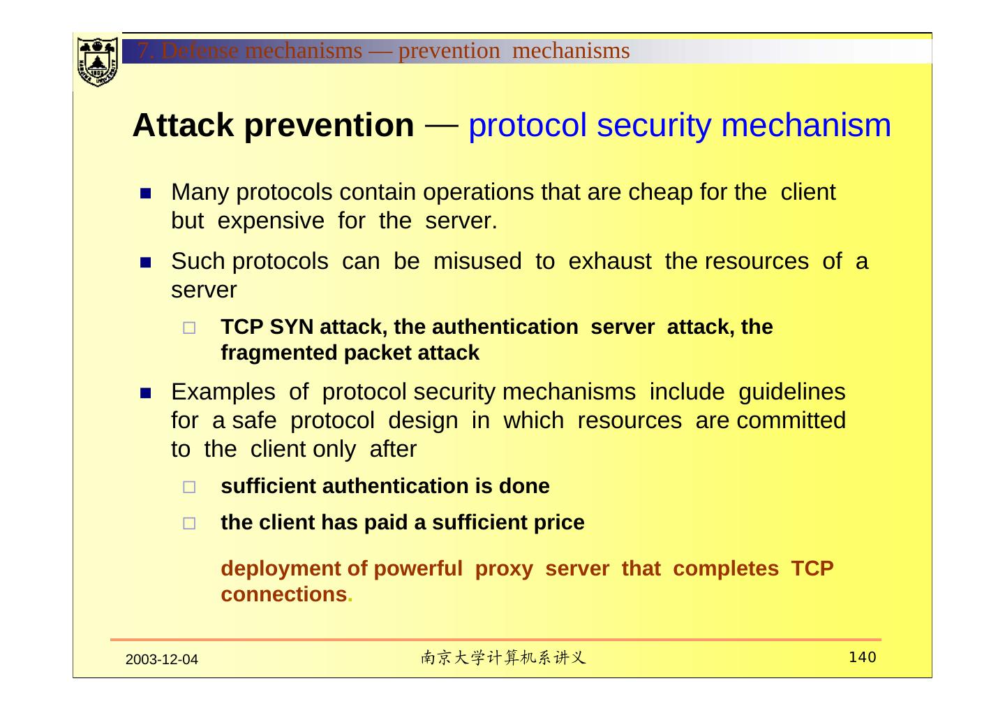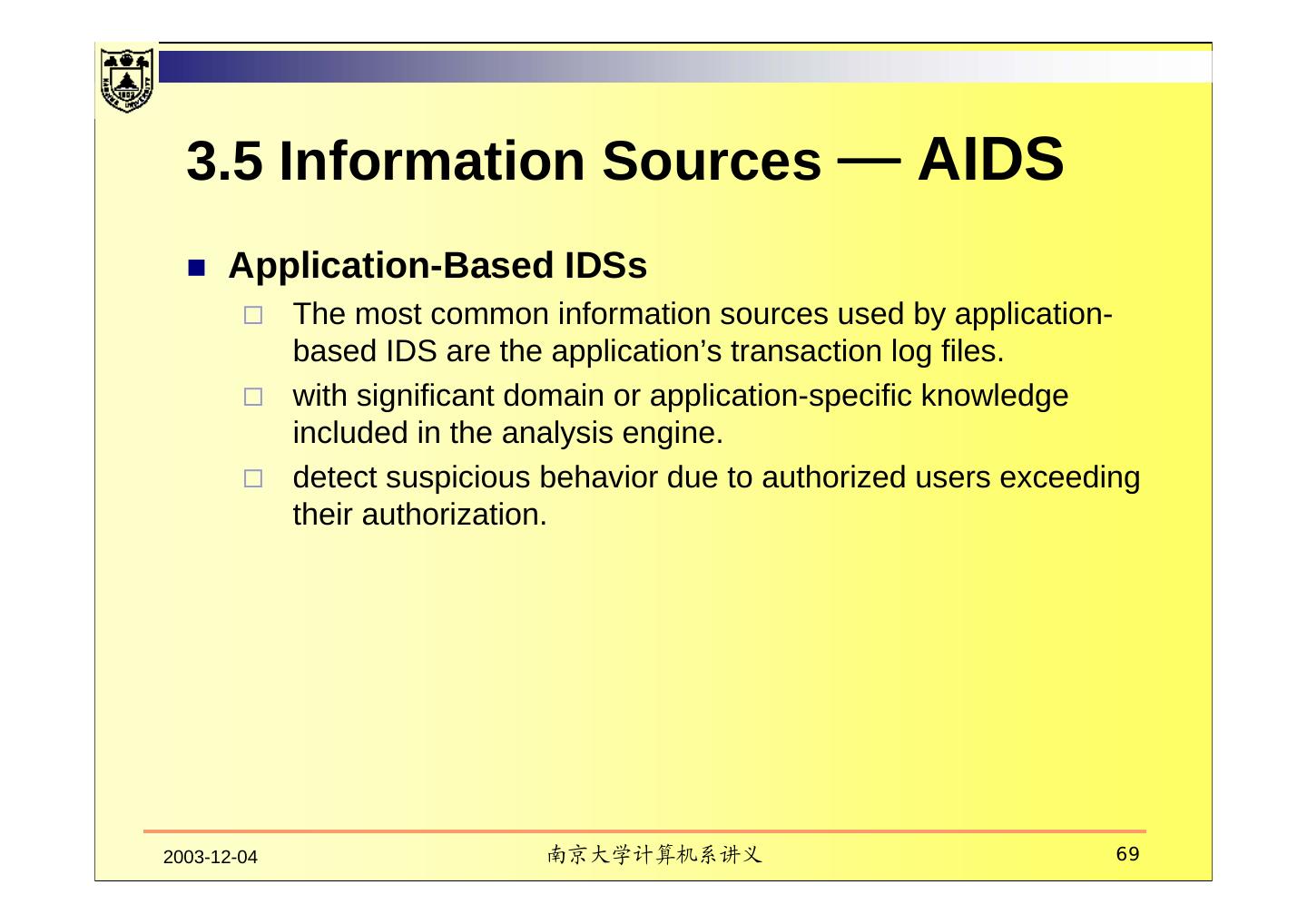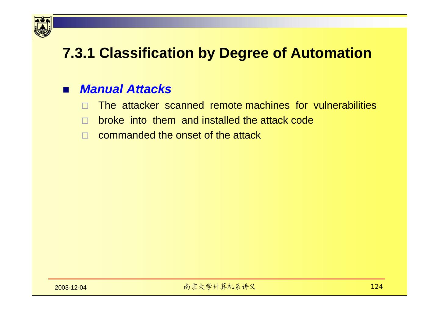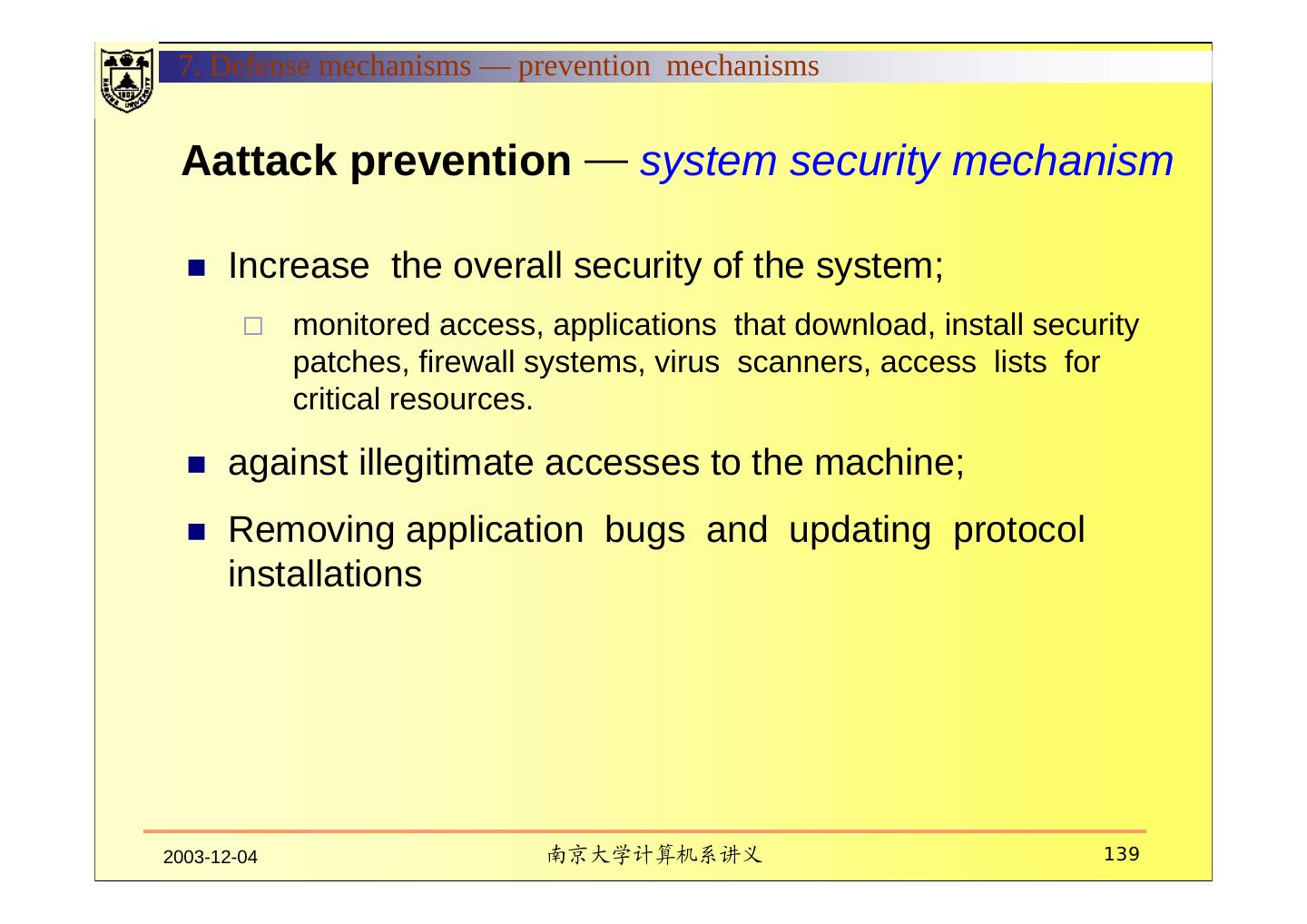 6 . What is a IDS Intrusions caused by attackers accessing the systems from the Internet; authorized users of the systems who attempt to gain additional privileges for which they are not authorized, authorized users who misuse the privileges given them. Intrusion detection monitoring the events occurring in a computer system or network analyzing them for signs of intrusions, defined as attempts to compromise the confidentiality, integrity, availability, or to bypass the security mechanisms of a computer or network. Intrusion Detection Systems software or hardware products that automate this monitoring and analysis process. 2003-12-04 南京大学计算机系讲义 6