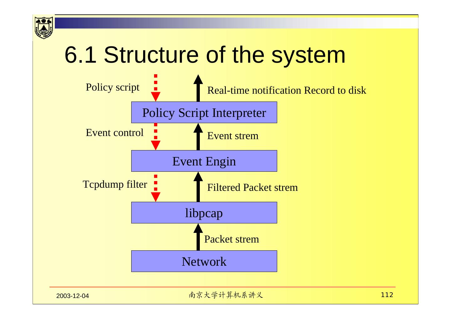 5 . 1. Introduction Understand what security goals intrusion detection mechanisms serve; How to select and configure intrusion detection systems for their specific system and network environments; How to manage the output of intrusion detection systems; How to integrate intrusion detection functions with the rest of the organizational security infrastructure. 2003-12-04 南京大学计算机系讲义 5