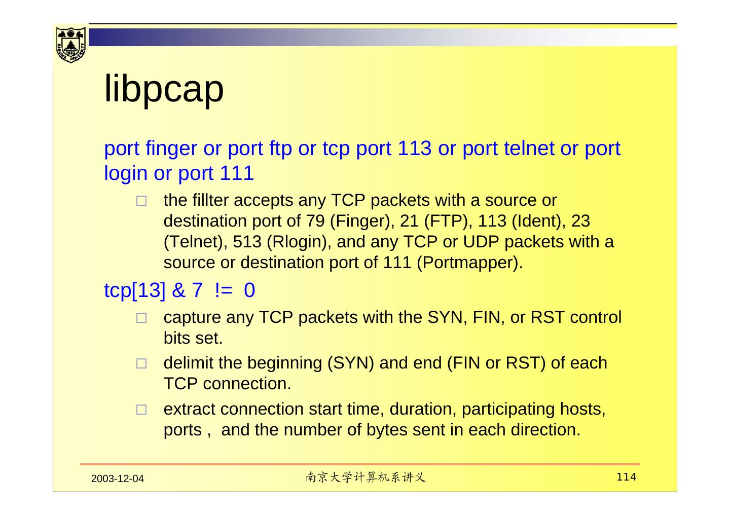 15 . Hypothesis Examples(1) Attempted break-in Someone attempting to break into a system might generate an abnormally high rate of password failures with respect to a single account or the system as a whole. Masquerading or successful break-in Someone logging into a system through an unauthorized account and password might have a different login time, location, or connection type from that of the account's legitimate user. He might spend most of his time browsing through directories and executing system status commands The legitimate user might concentrate on editing or compiling and linking programs. 2003-12-04 南京大学计算机系讲义 15