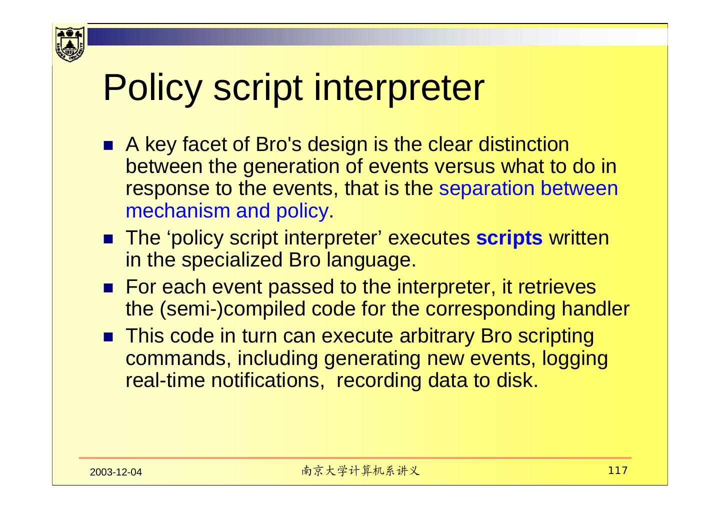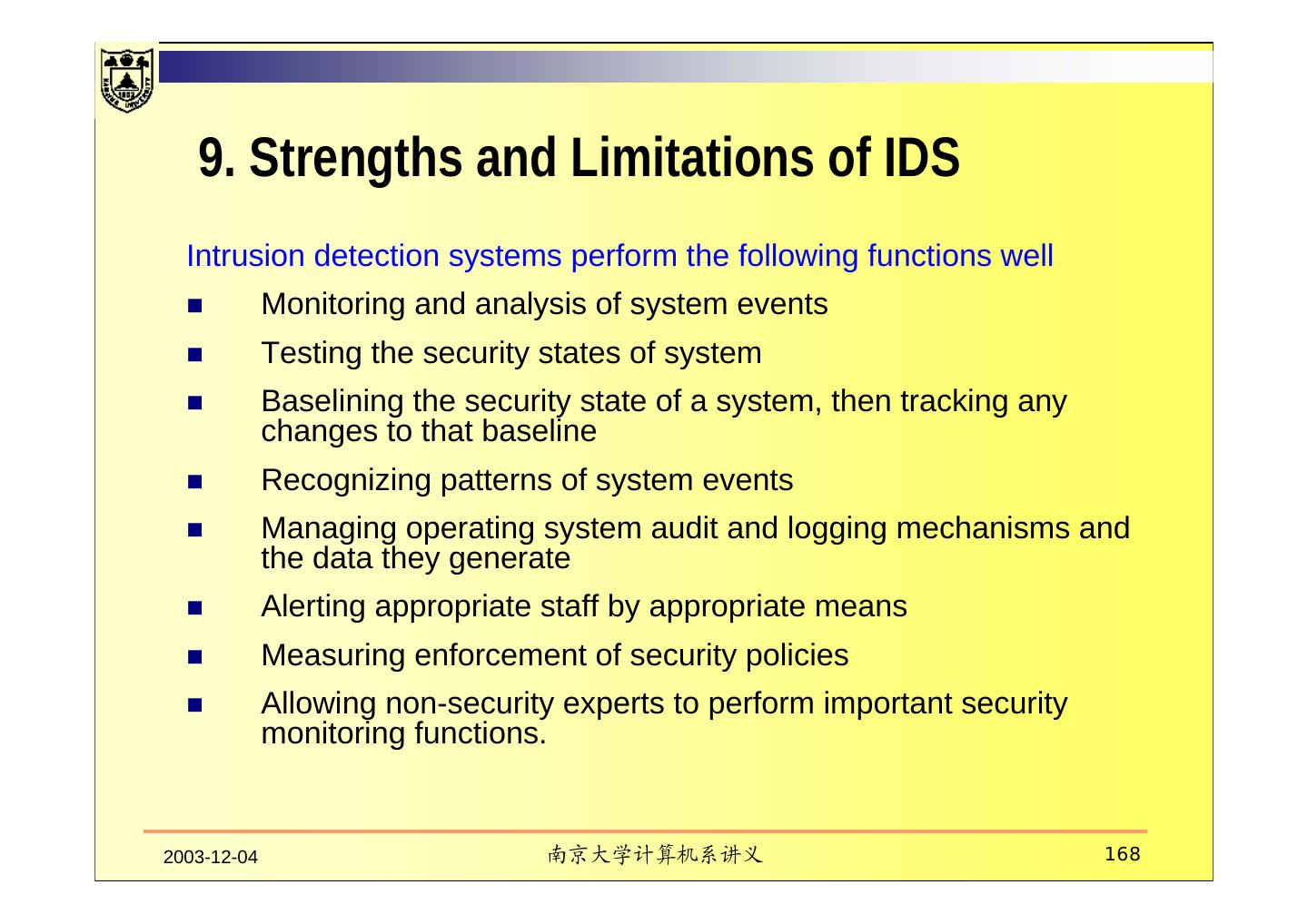 8 . Why should IDS (2) Detecting problems that are not prevented by other security measures The operating systems cannot be patched or updated. Administrators sometimes have neither sufficient time nor resource to track and install all the necessary patches. Both users and administrators make errors in configuring and using systems. Discrepancies of an organization’s procedural computer use policy. Flaws and vulnerabilities are discovered on a daily basis. 2003-12-04 南京大学计算机系讲义 8