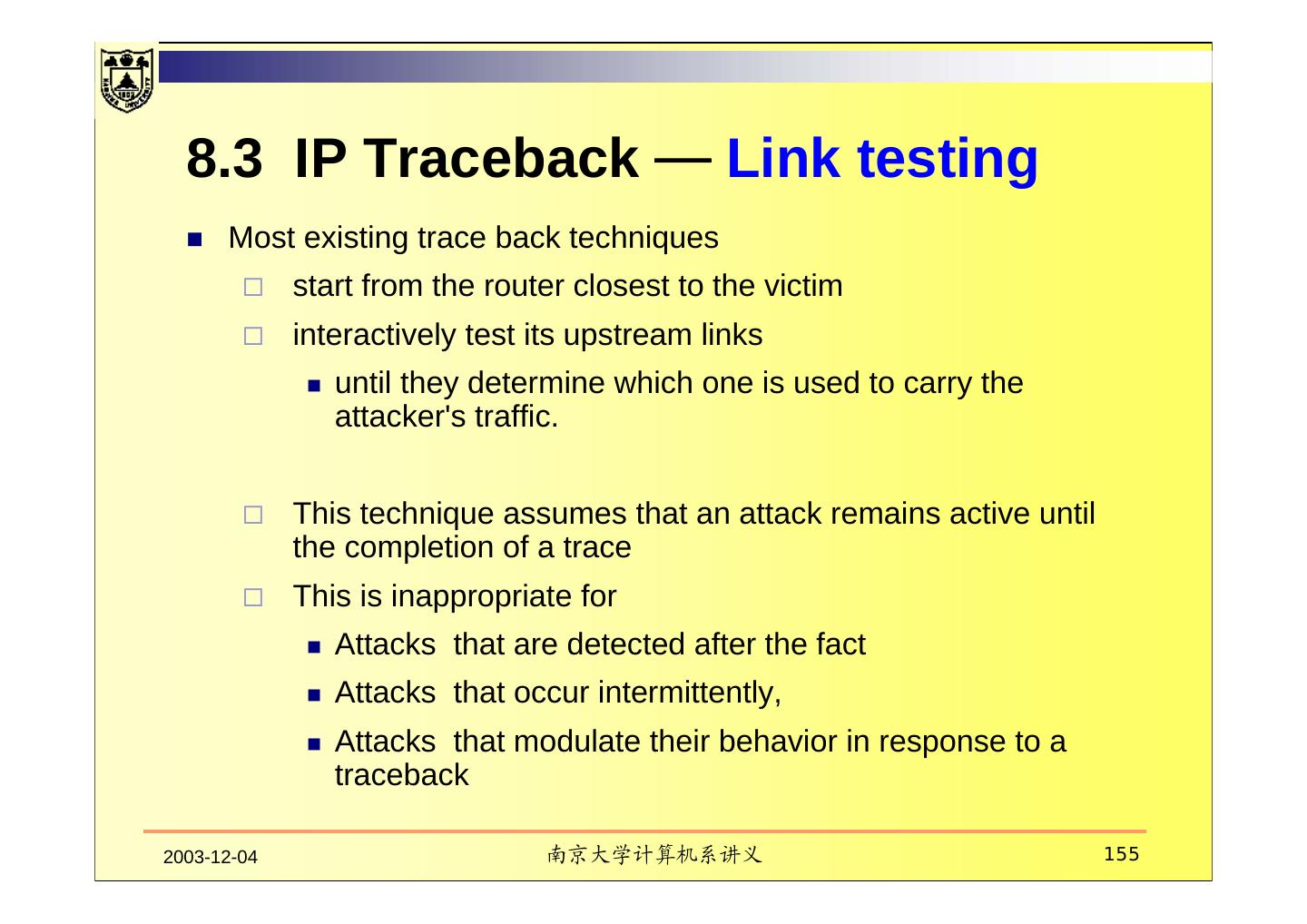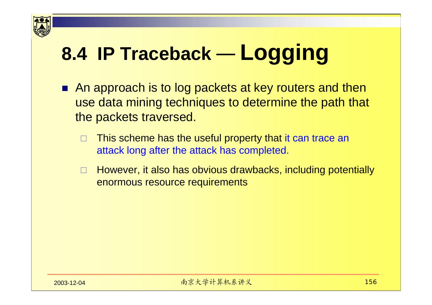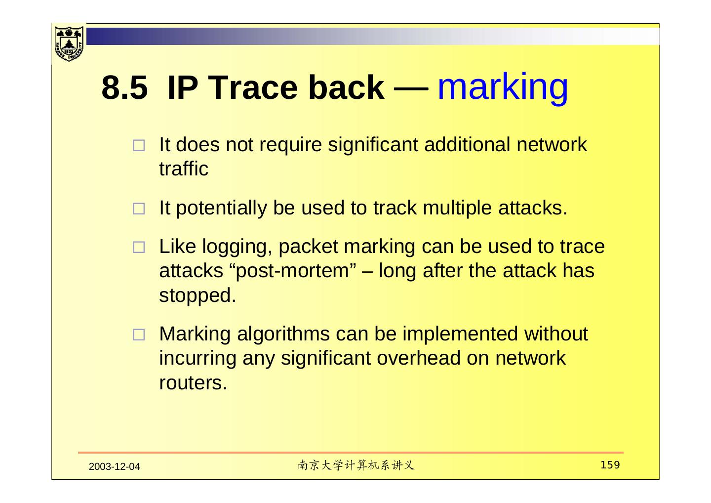 7 . 为什么需要IDS (1) Preventing problems increasing the perceived risk of discovery increasing punishment of attackers affect the behavior of individual users 2003-12-04 南京大学计算机系讲义 7