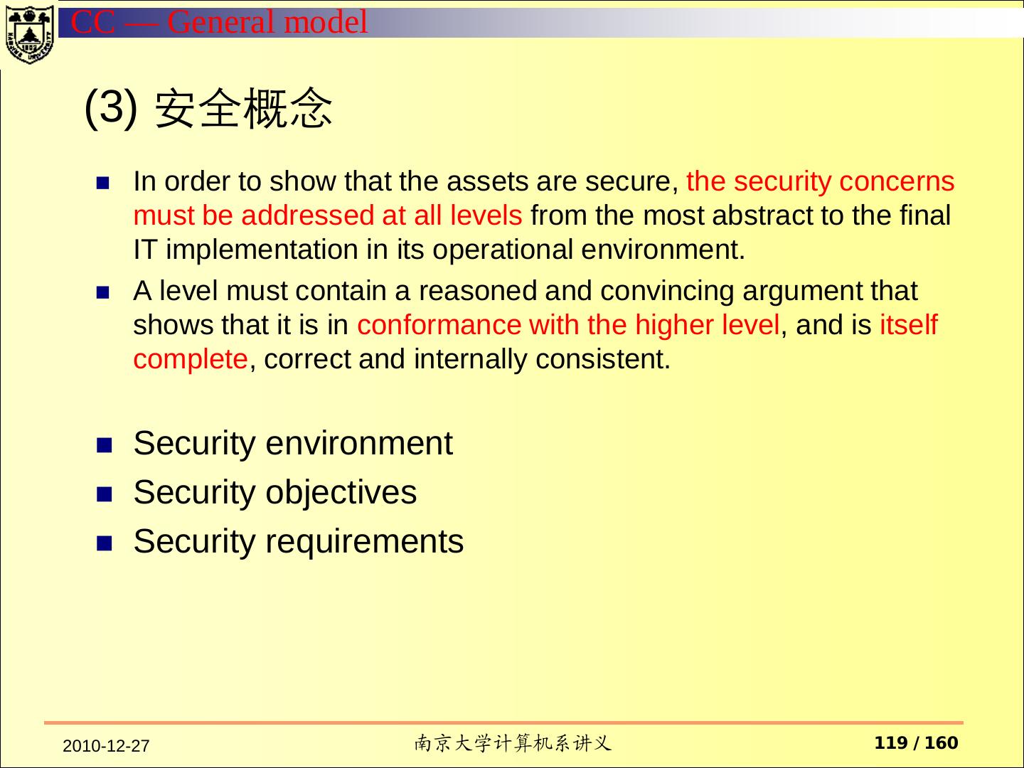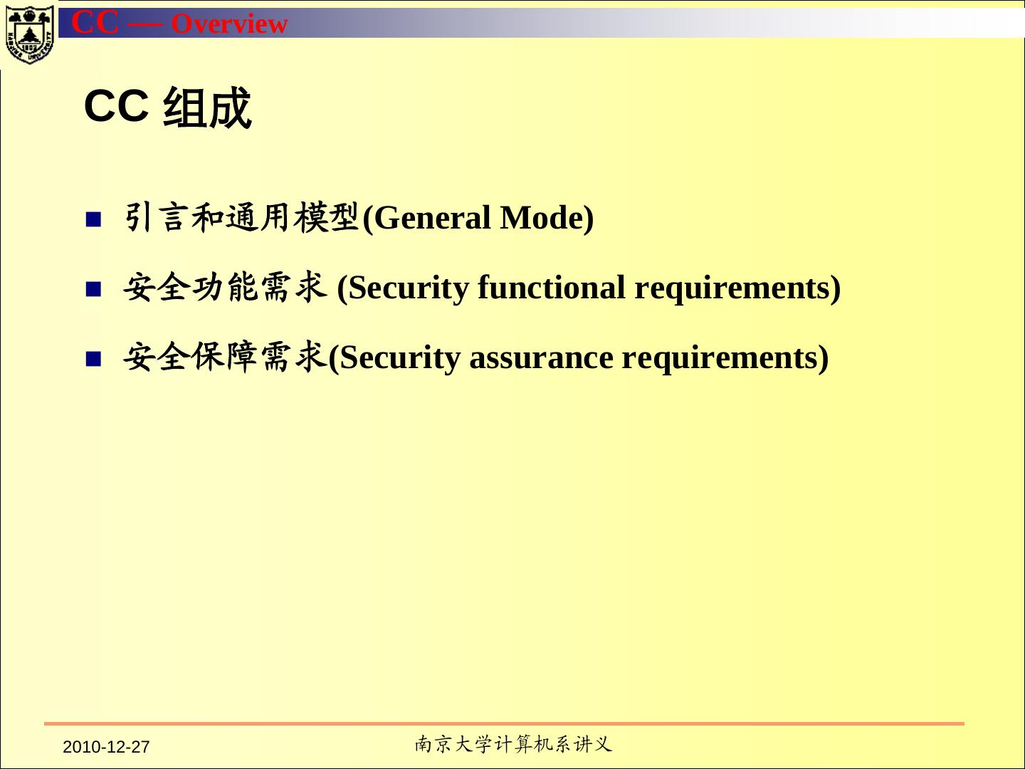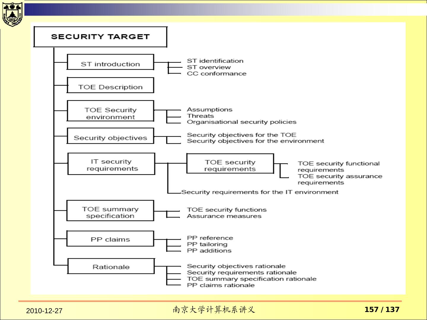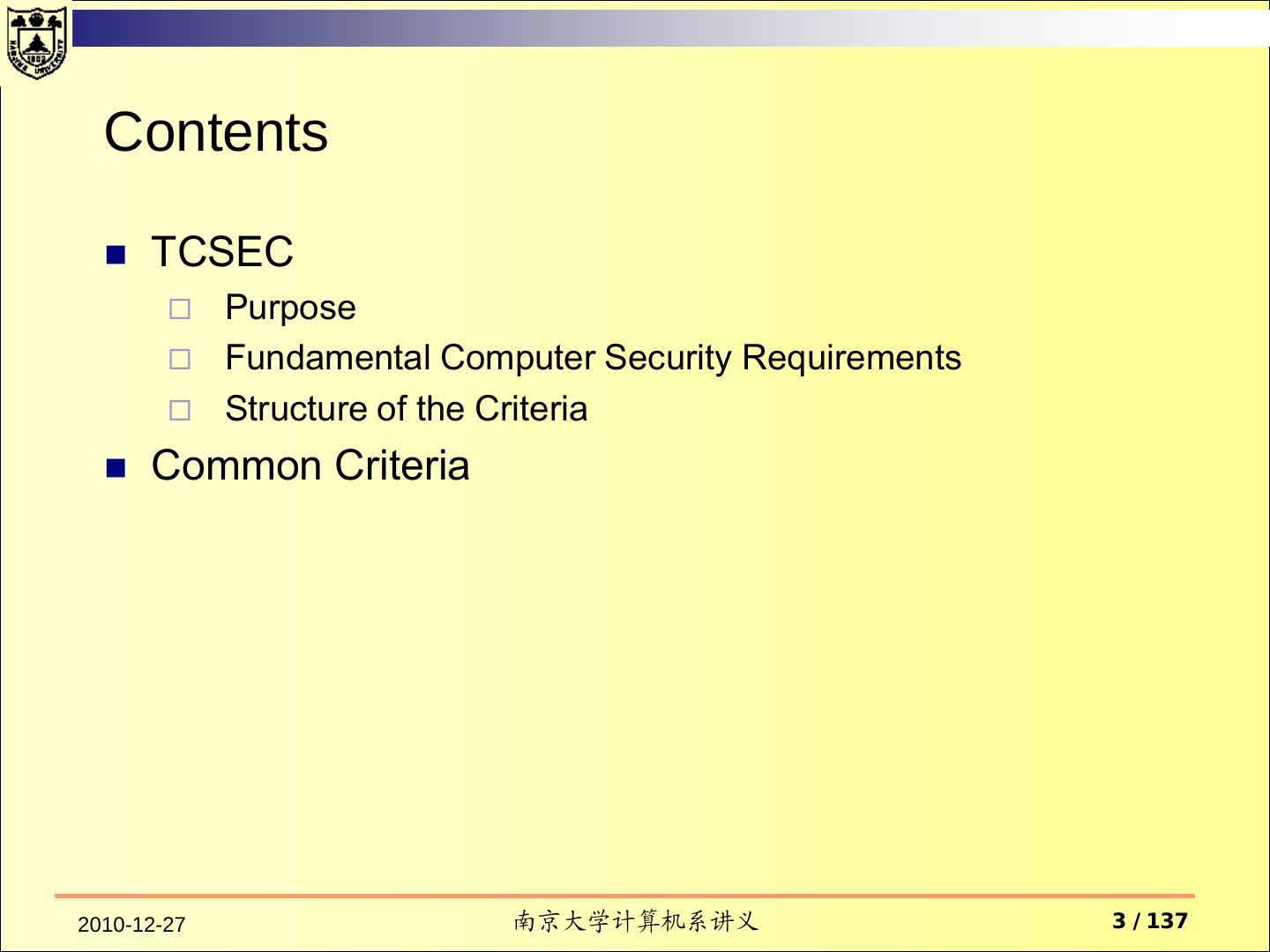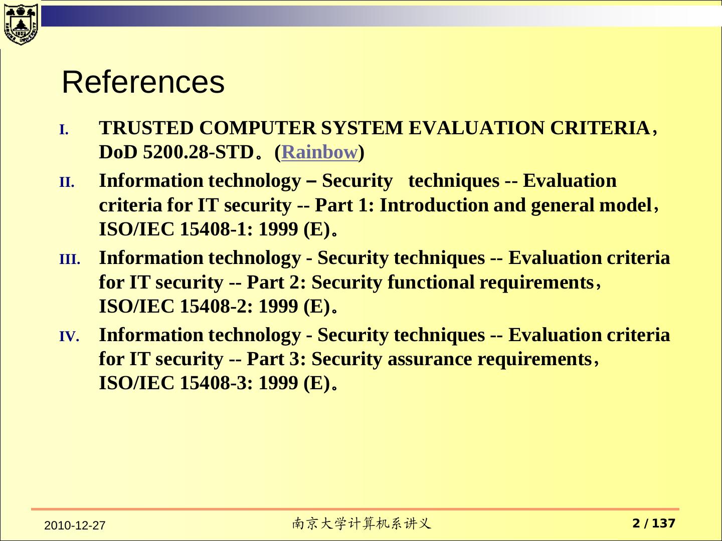 2 . References I. TRUSTED COMPUTER SYSTEM EVALUATION CRITERIA, DoD 5200.28-STD。(Rainbow) II. Information technology – Security techniques -- Evaluation criteria for IT security -- Part 1: Introduction and general model, ISO/IEC 15408-1: 1999 (E)。 III. Information technology - Security techniques -- Evaluation criteria for IT security -- Part 2: Security functional requirements, ISO/IEC 15408-2: 1999 (E)。 IV. Information technology - Security techniques -- Evaluation criteria for IT security -- Part 3: Security assurance requirements, ISO/IEC 15408-3: 1999 (E)。 2010-12-27 南京大学计算机系讲义 2 / 137