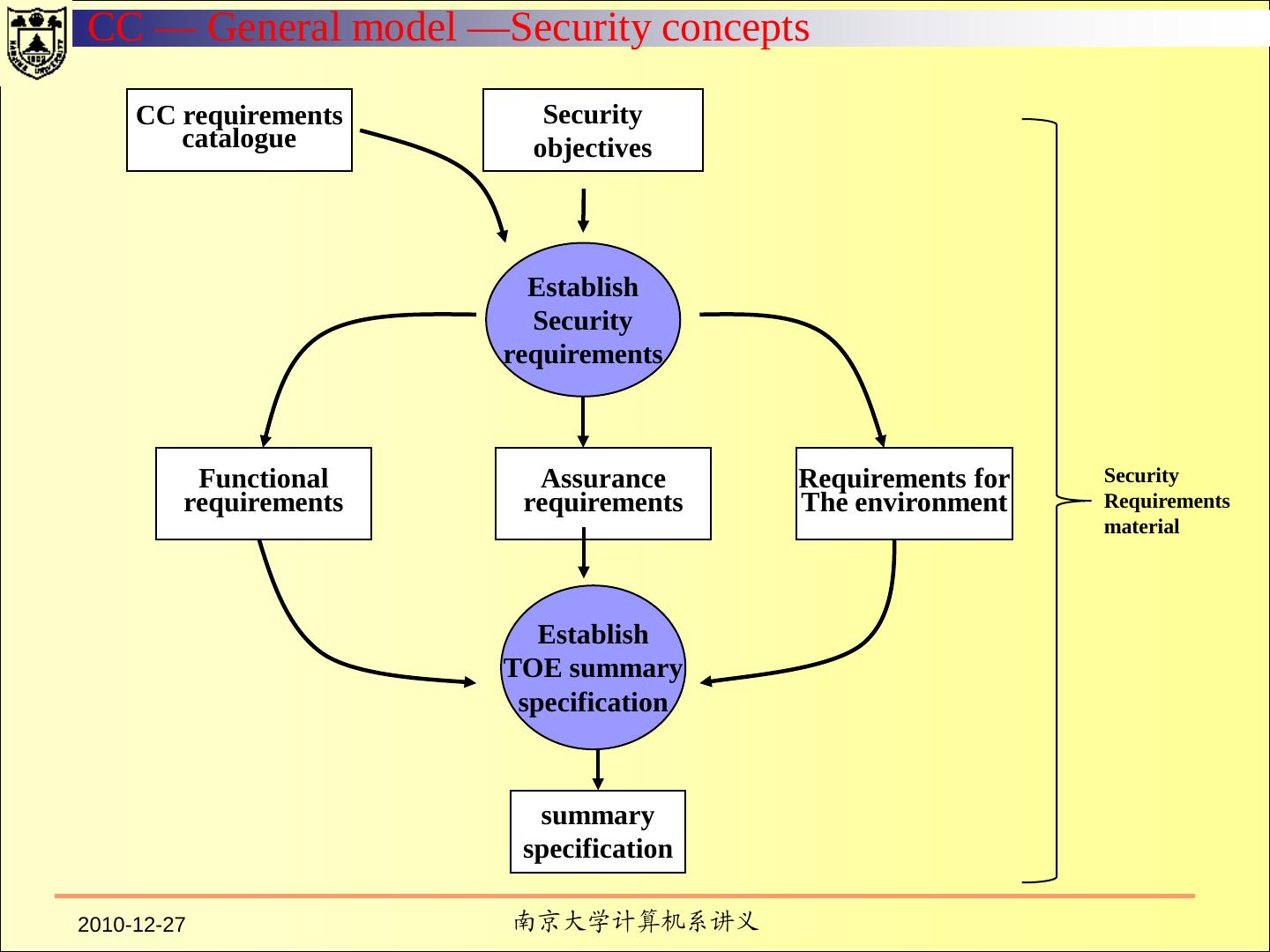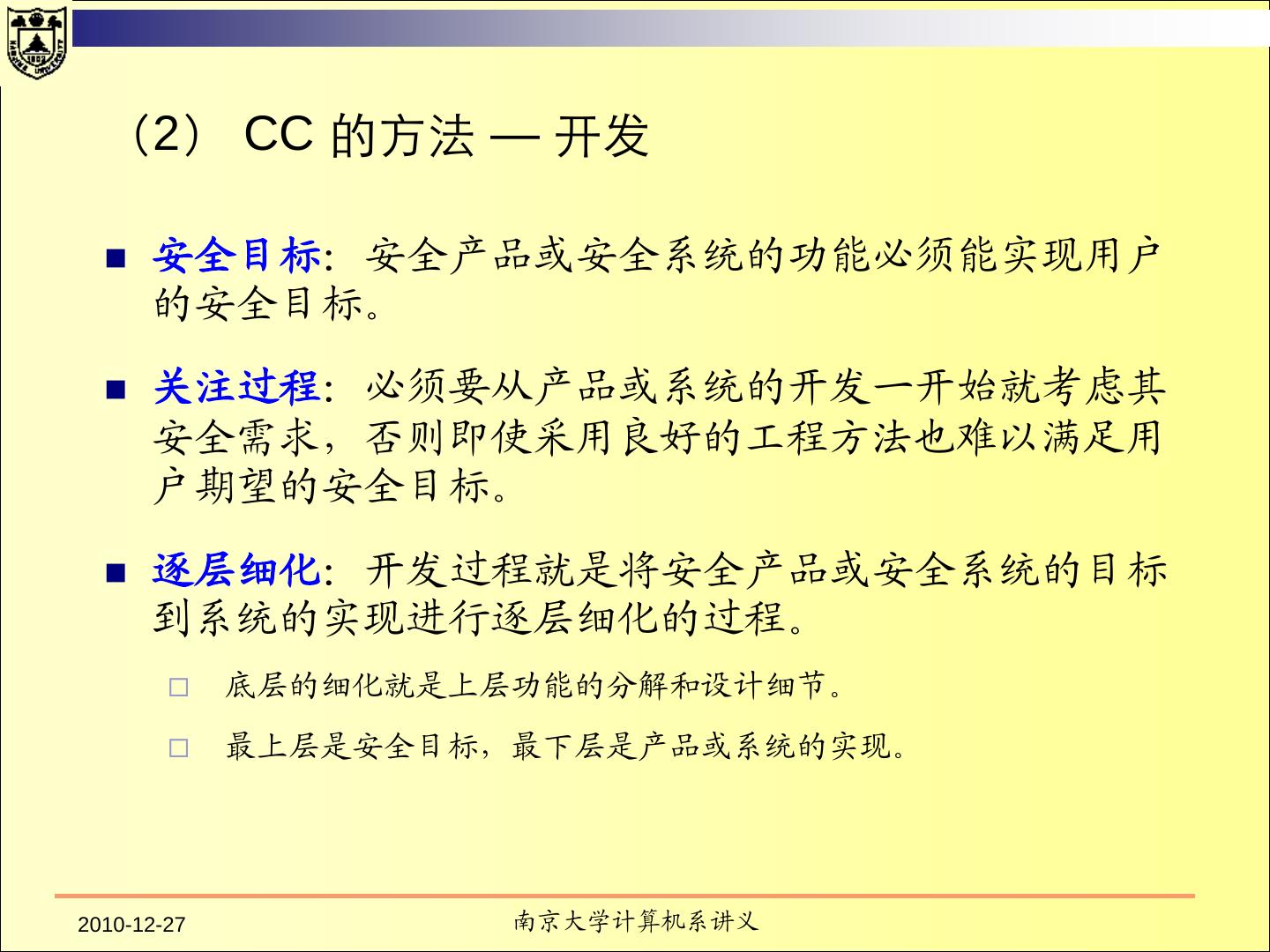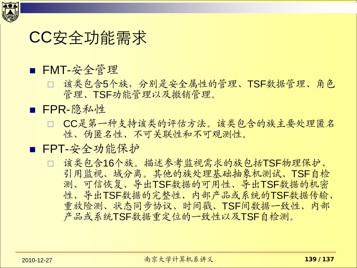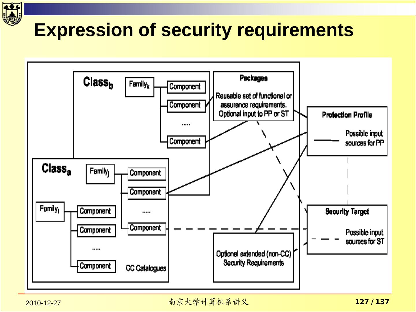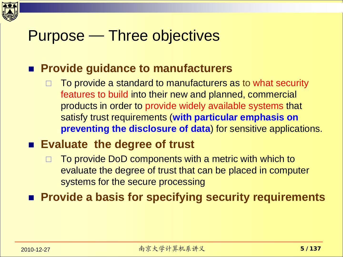 2 . References I. TRUSTED COMPUTER SYSTEM EVALUATION CRITERIA, DoD 5200.28-STD。(Rainbow) II. Information technology – Security techniques -- Evaluation criteria for IT security -- Part 1: Introduction and general model, ISO/IEC 15408-1: 1999 (E)。 III. Information technology - Security techniques -- Evaluation criteria for IT security -- Part 2: Security functional requirements, ISO/IEC 15408-2: 1999 (E)。 IV. Information technology - Security techniques -- Evaluation criteria for IT security -- Part 3: Security assurance requirements, ISO/IEC 15408-3: 1999 (E)。 2010-12-27 南京大学计算机系讲义 2 / 137