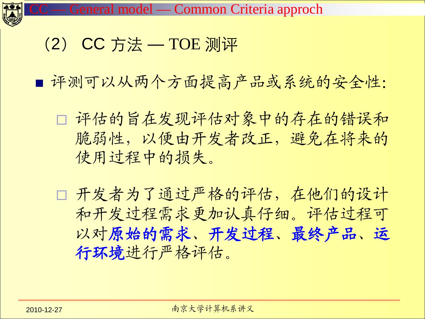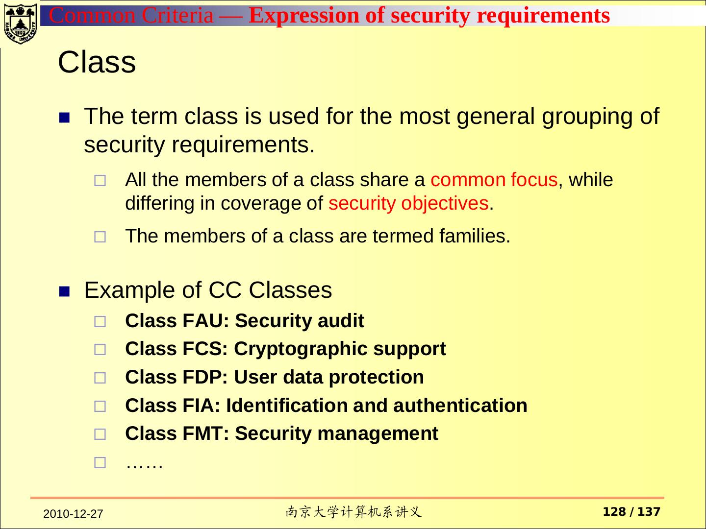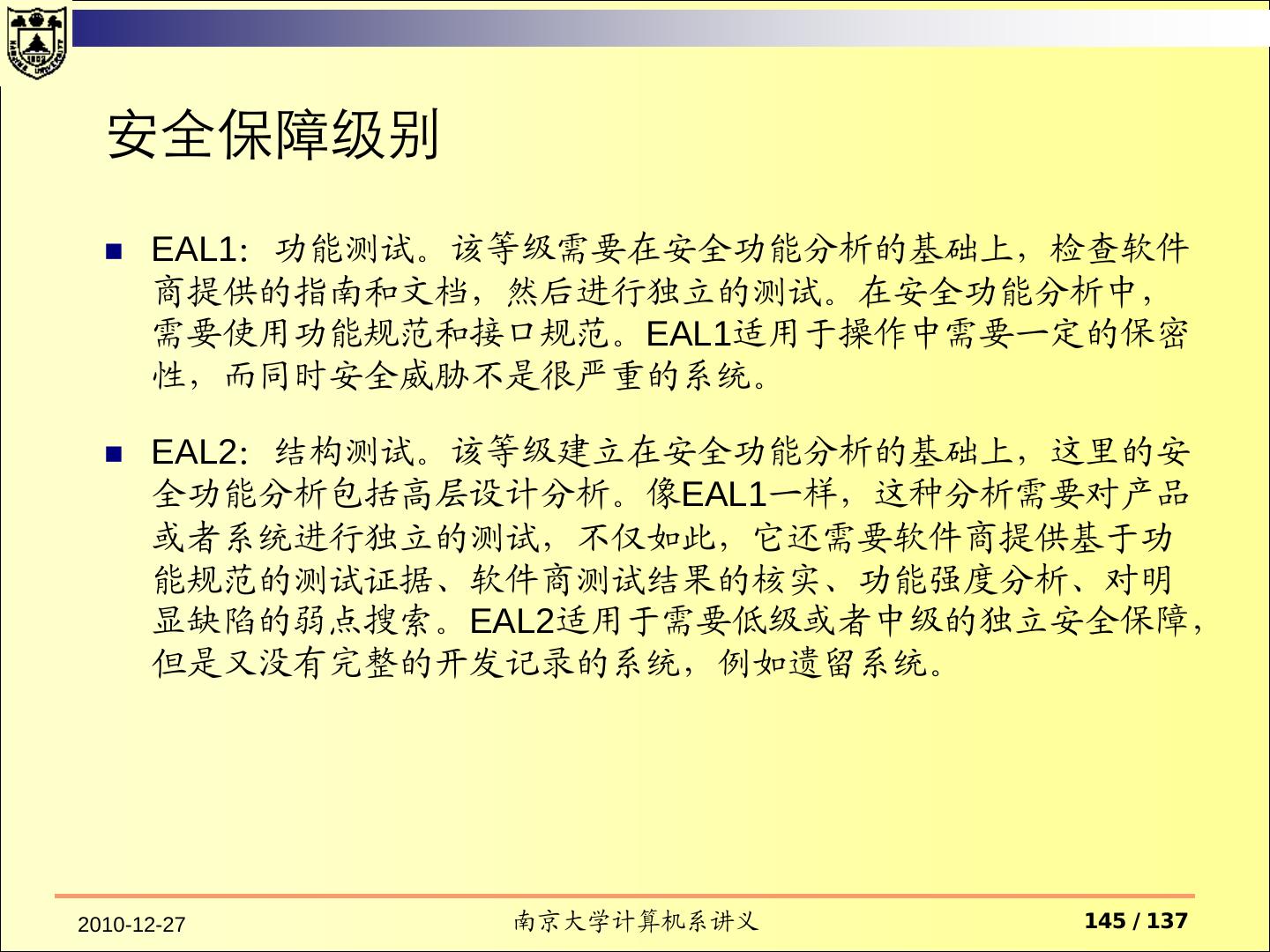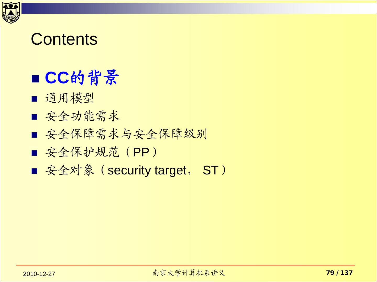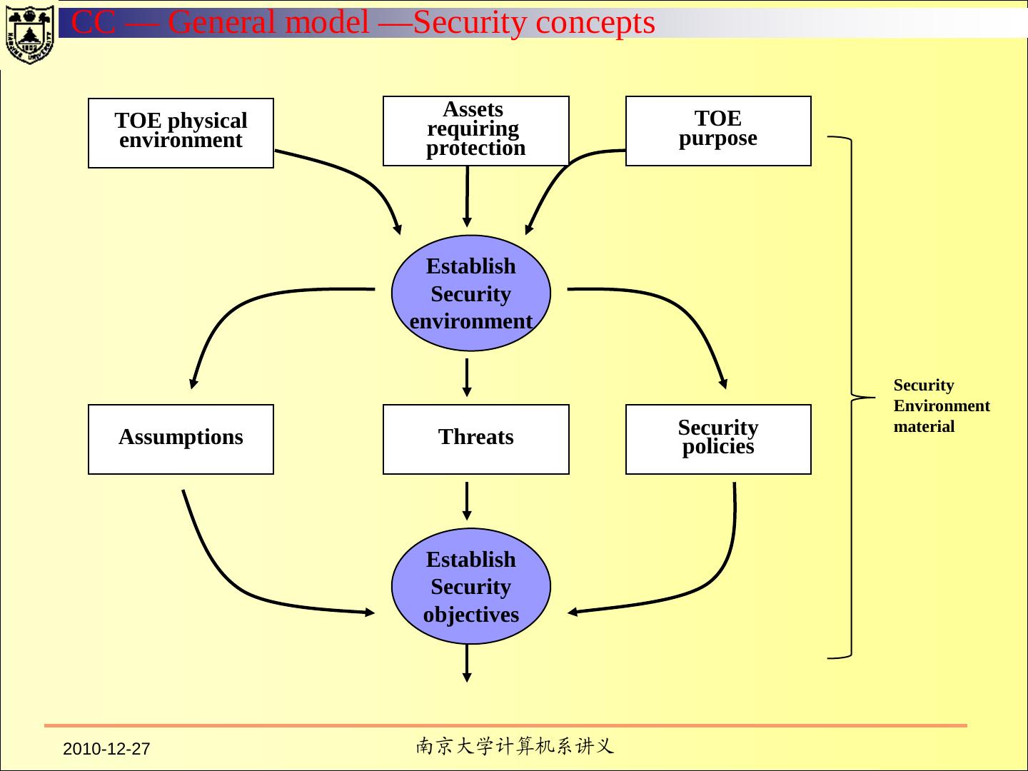 2 . References I. TRUSTED COMPUTER SYSTEM EVALUATION CRITERIA, DoD 5200.28-STD。(Rainbow) II. Information technology – Security techniques -- Evaluation criteria for IT security -- Part 1: Introduction and general model, ISO/IEC 15408-1: 1999 (E)。 III. Information technology - Security techniques -- Evaluation criteria for IT security -- Part 2: Security functional requirements, ISO/IEC 15408-2: 1999 (E)。 IV. Information technology - Security techniques -- Evaluation criteria for IT security -- Part 3: Security assurance requirements, ISO/IEC 15408-3: 1999 (E)。 2010-12-27 南京大学计算机系讲义 2 / 137