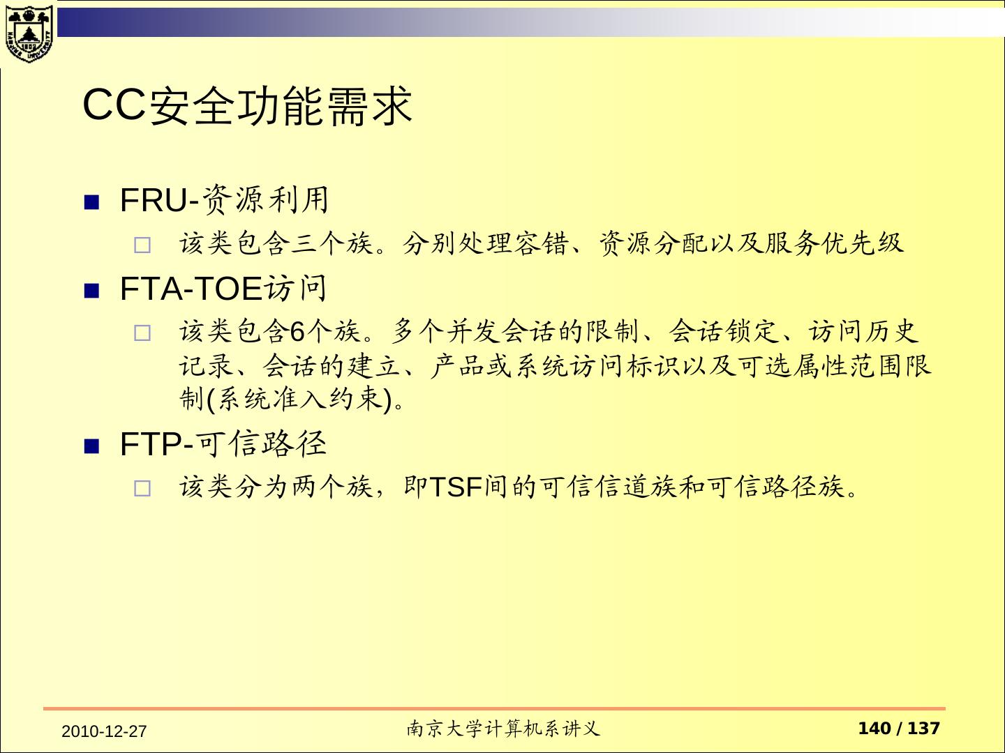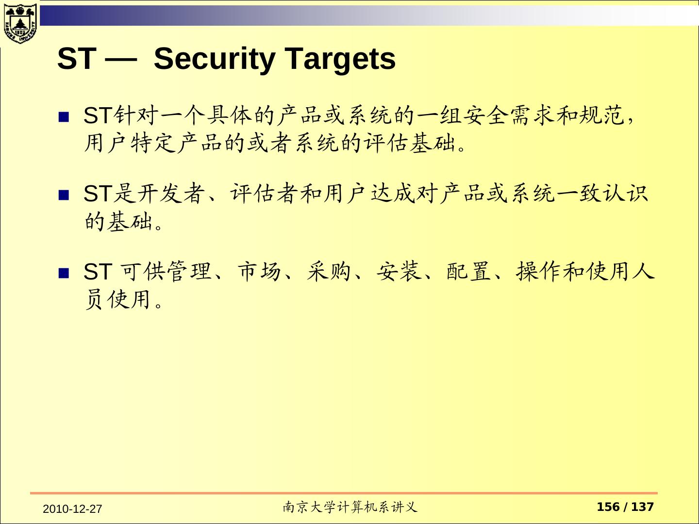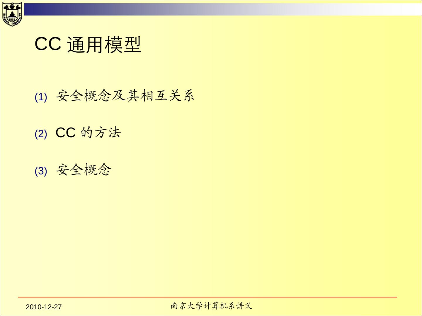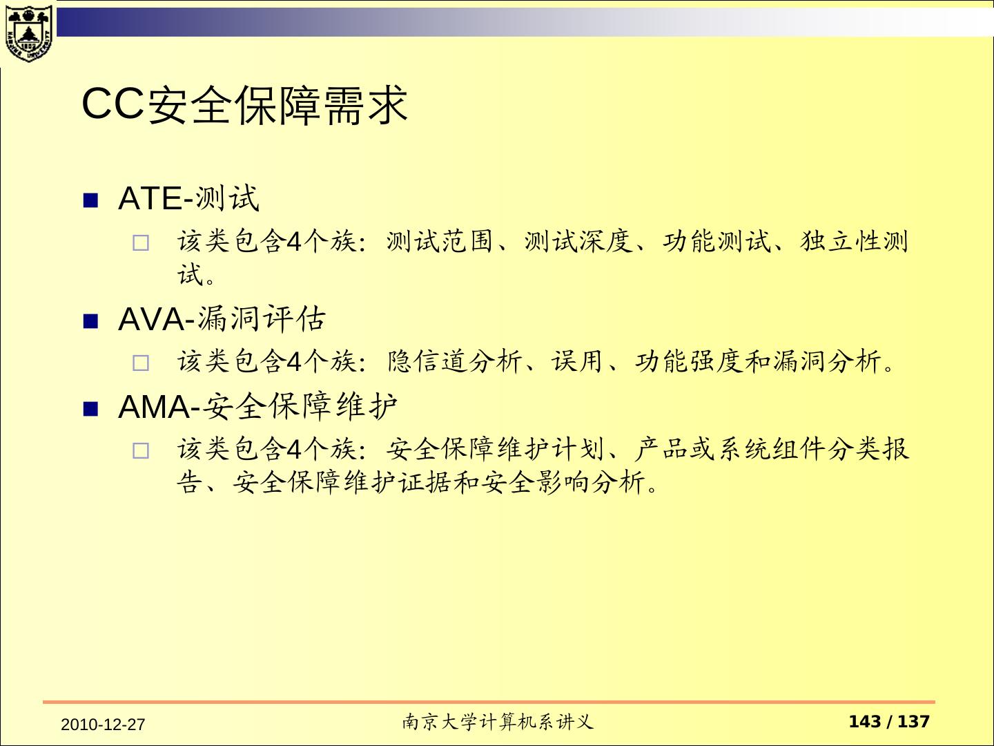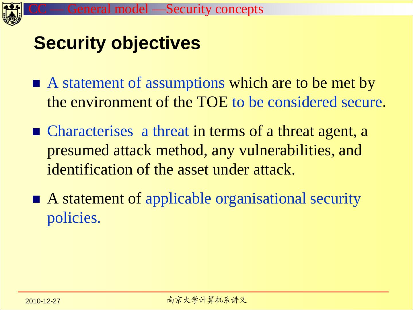 2 . References I. TRUSTED COMPUTER SYSTEM EVALUATION CRITERIA, DoD 5200.28-STD。(Rainbow) II. Information technology – Security techniques -- Evaluation criteria for IT security -- Part 1: Introduction and general model, ISO/IEC 15408-1: 1999 (E)。 III. Information technology - Security techniques -- Evaluation criteria for IT security -- Part 2: Security functional requirements, ISO/IEC 15408-2: 1999 (E)。 IV. Information technology - Security techniques -- Evaluation criteria for IT security -- Part 3: Security assurance requirements, ISO/IEC 15408-3: 1999 (E)。 2010-12-27 南京大学计算机系讲义 2 / 137