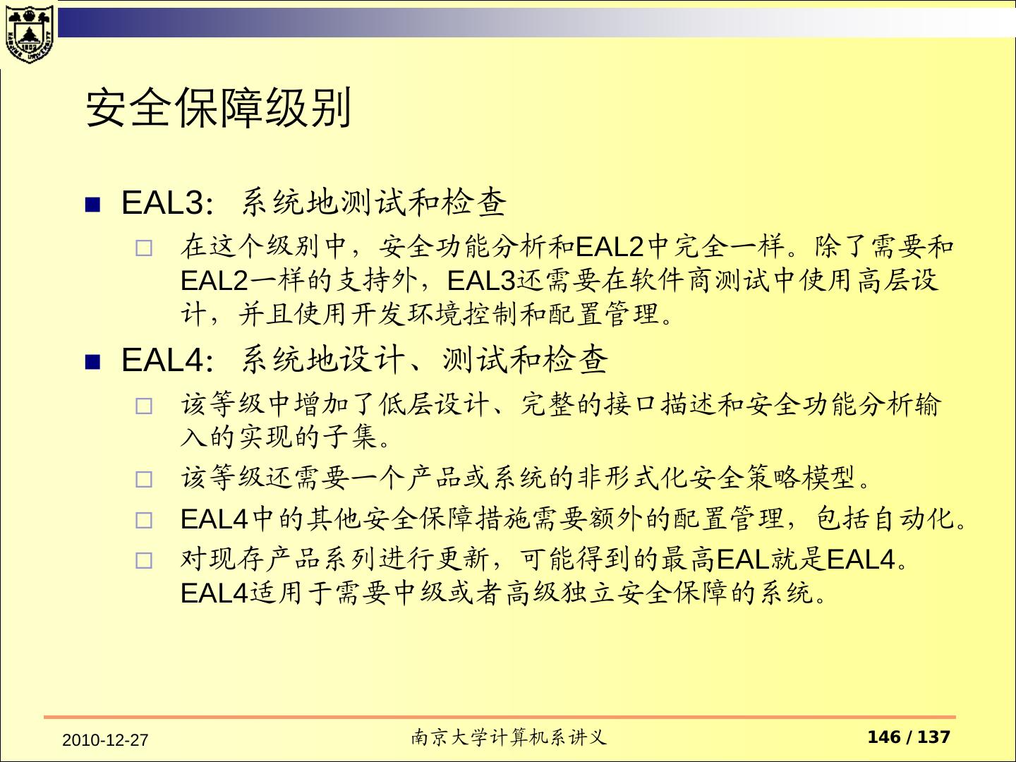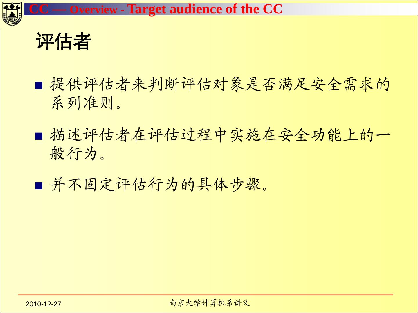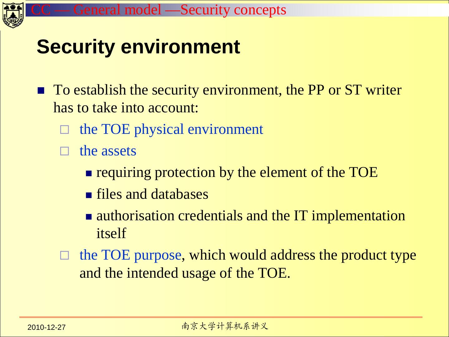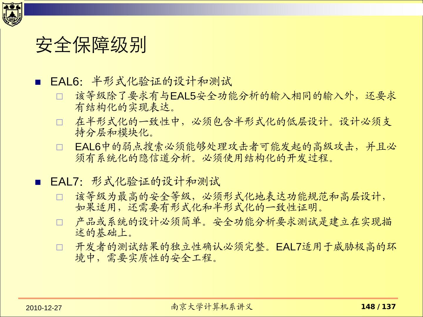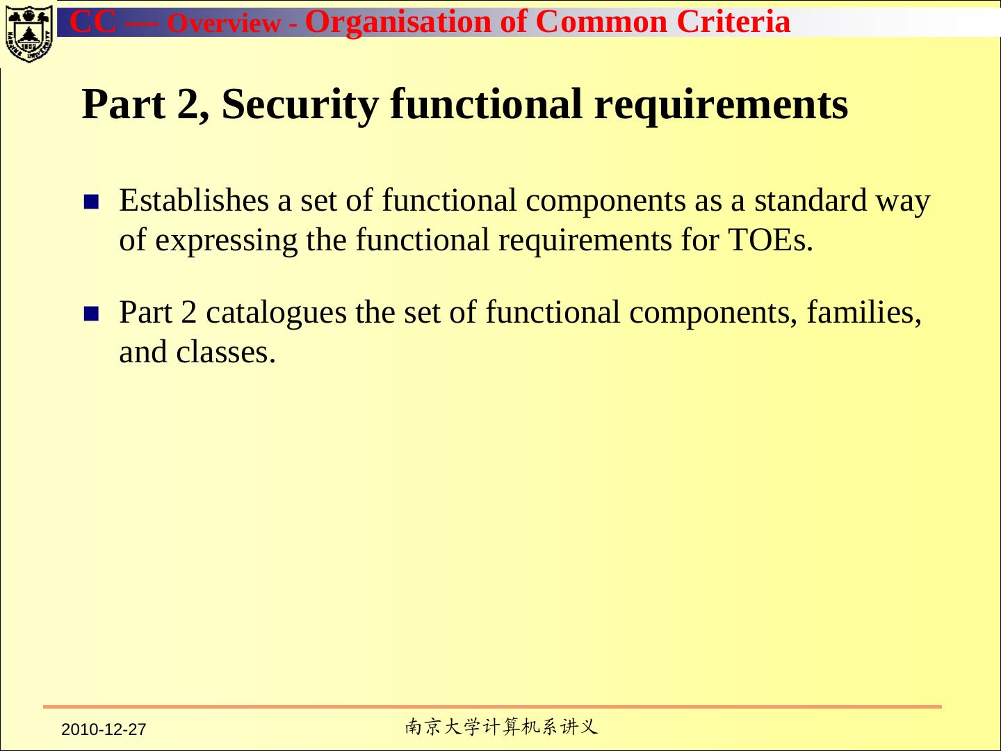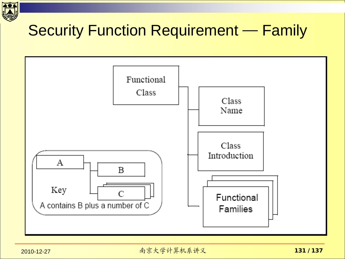 2 . References I. TRUSTED COMPUTER SYSTEM EVALUATION CRITERIA, DoD 5200.28-STD。(Rainbow) II. Information technology – Security techniques -- Evaluation criteria for IT security -- Part 1: Introduction and general model, ISO/IEC 15408-1: 1999 (E)。 III. Information technology - Security techniques -- Evaluation criteria for IT security -- Part 2: Security functional requirements, ISO/IEC 15408-2: 1999 (E)。 IV. Information technology - Security techniques -- Evaluation criteria for IT security -- Part 3: Security assurance requirements, ISO/IEC 15408-3: 1999 (E)。 2010-12-27 南京大学计算机系讲义 2 / 137