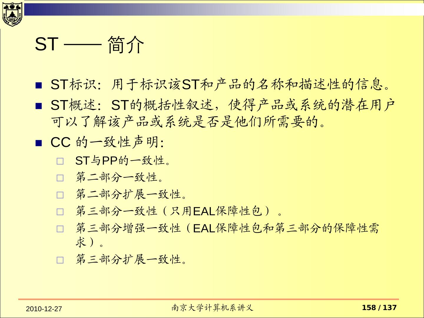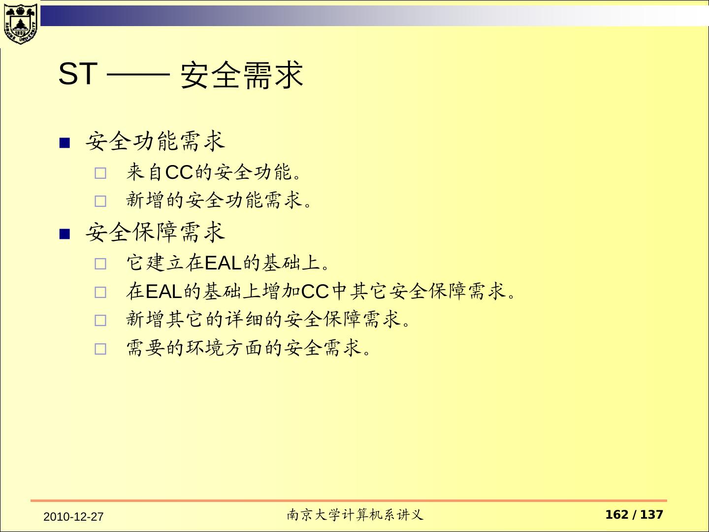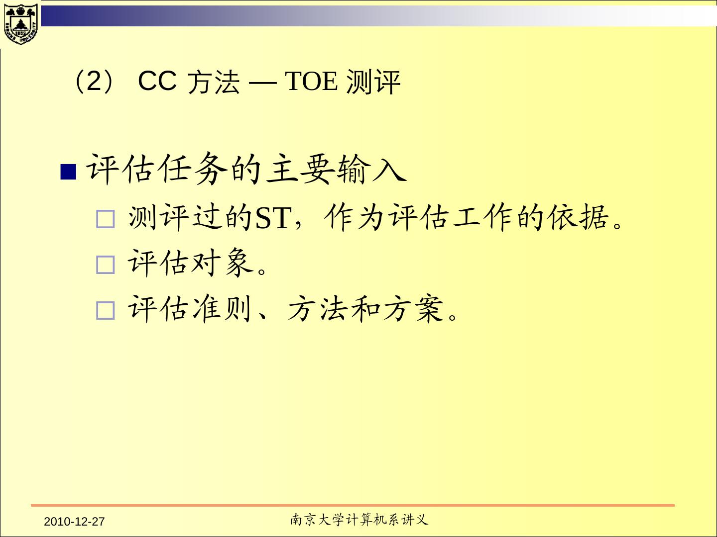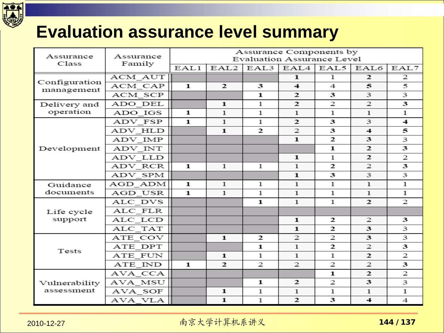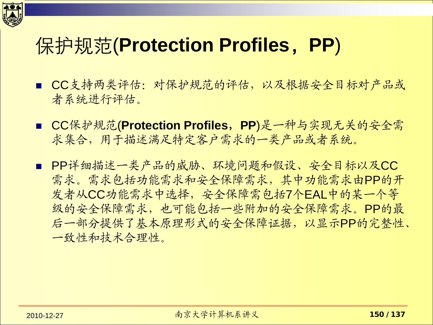 2 . References I. TRUSTED COMPUTER SYSTEM EVALUATION CRITERIA, DoD 5200.28-STD。(Rainbow) II. Information technology – Security techniques -- Evaluation criteria for IT security -- Part 1: Introduction and general model, ISO/IEC 15408-1: 1999 (E)。 III. Information technology - Security techniques -- Evaluation criteria for IT security -- Part 2: Security functional requirements, ISO/IEC 15408-2: 1999 (E)。 IV. Information technology - Security techniques -- Evaluation criteria for IT security -- Part 3: Security assurance requirements, ISO/IEC 15408-3: 1999 (E)。 2010-12-27 南京大学计算机系讲义 2 / 137