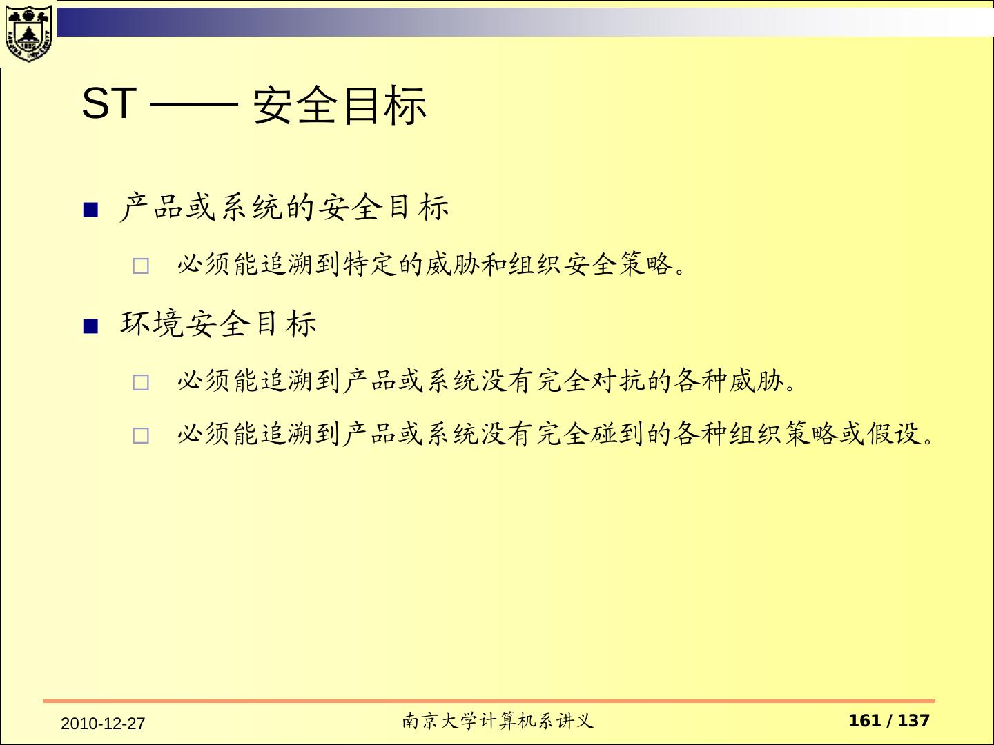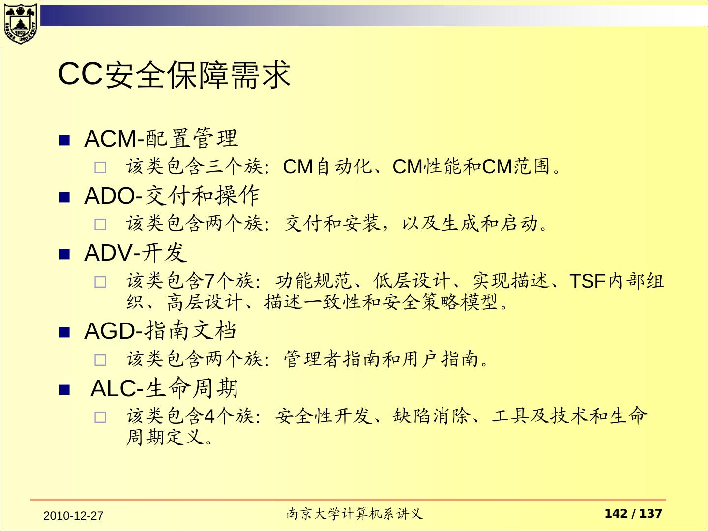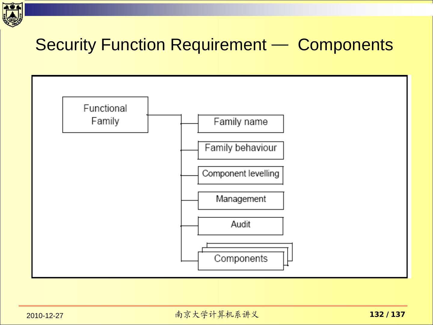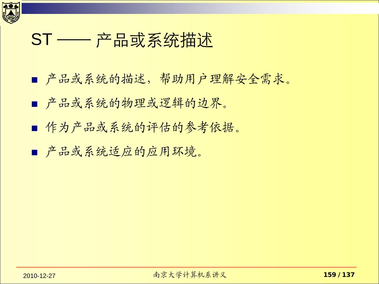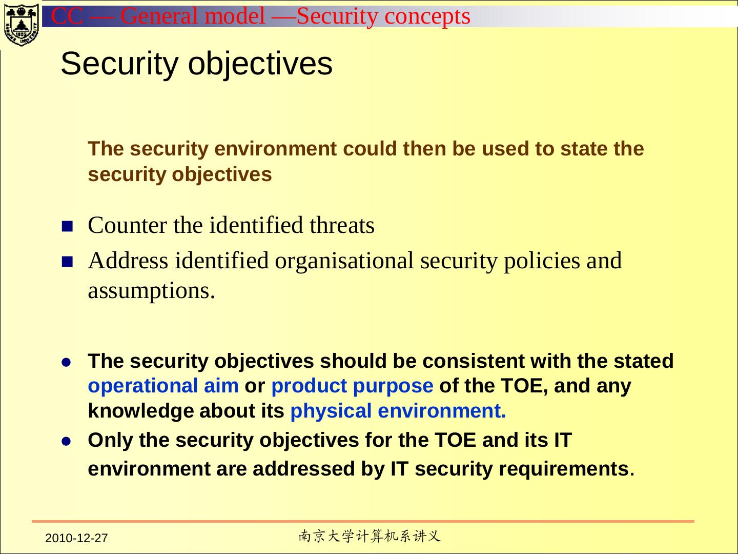 2 . References I. TRUSTED COMPUTER SYSTEM EVALUATION CRITERIA, DoD 5200.28-STD。(Rainbow) II. Information technology – Security techniques -- Evaluation criteria for IT security -- Part 1: Introduction and general model, ISO/IEC 15408-1: 1999 (E)。 III. Information technology - Security techniques -- Evaluation criteria for IT security -- Part 2: Security functional requirements, ISO/IEC 15408-2: 1999 (E)。 IV. Information technology - Security techniques -- Evaluation criteria for IT security -- Part 3: Security assurance requirements, ISO/IEC 15408-3: 1999 (E)。 2010-12-27 南京大学计算机系讲义 2 / 137