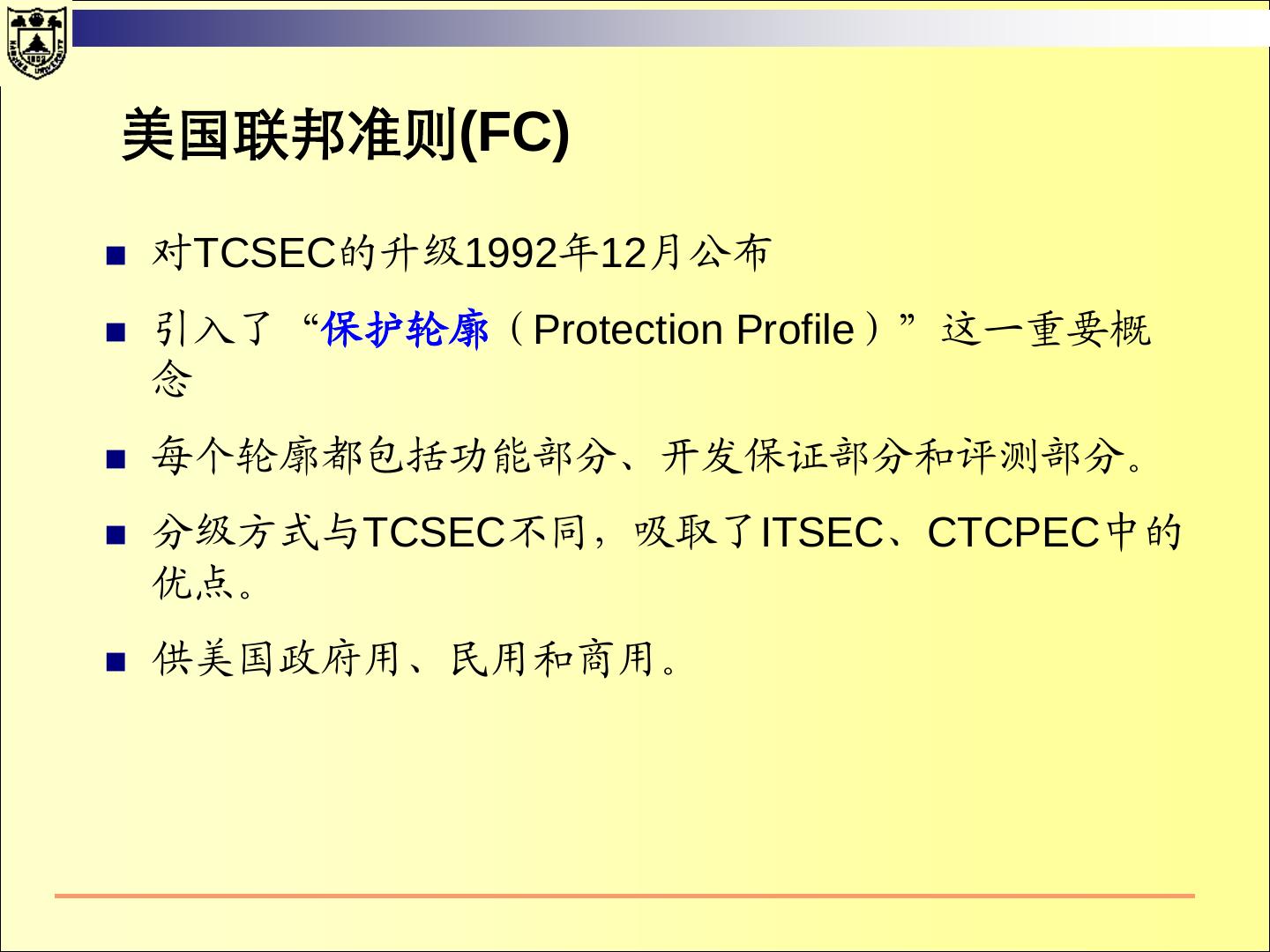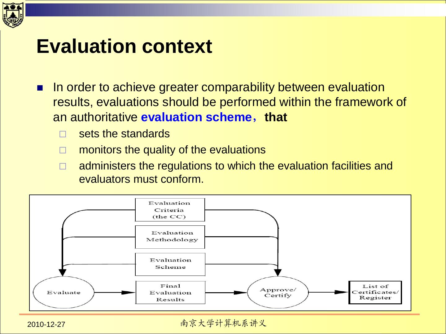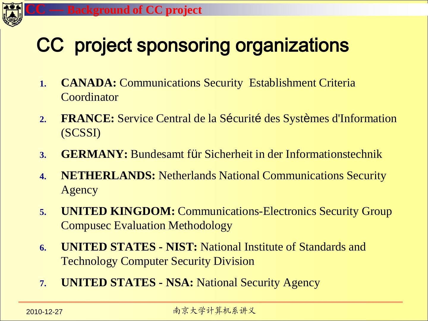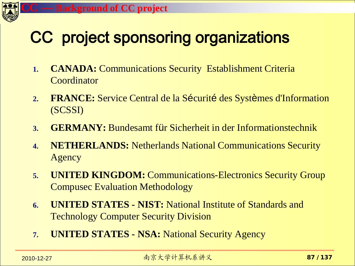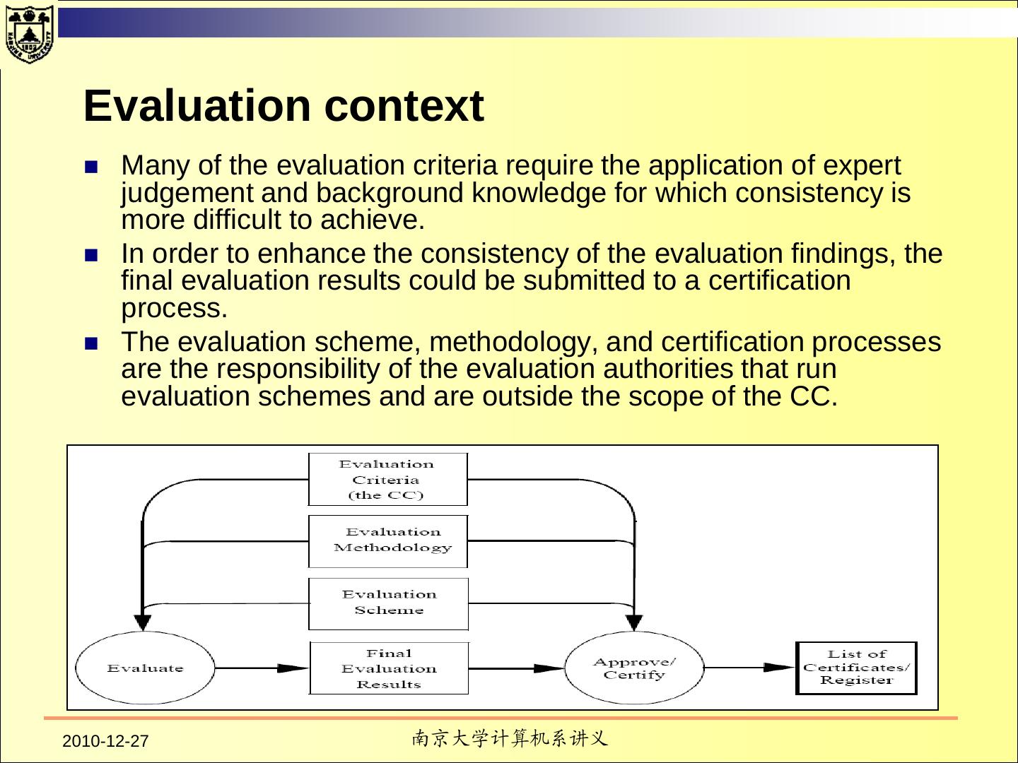 2 . References I. TRUSTED COMPUTER SYSTEM EVALUATION CRITERIA, DoD 5200.28-STD。(Rainbow) II. Information technology – Security techniques -- Evaluation criteria for IT security -- Part 1: Introduction and general model, ISO/IEC 15408-1: 1999 (E)。 III. Information technology - Security techniques -- Evaluation criteria for IT security -- Part 2: Security functional requirements, ISO/IEC 15408-2: 1999 (E)。 IV. Information technology - Security techniques -- Evaluation criteria for IT security -- Part 3: Security assurance requirements, ISO/IEC 15408-3: 1999 (E)。 2010-12-27 南京大学计算机系讲义 2 / 137