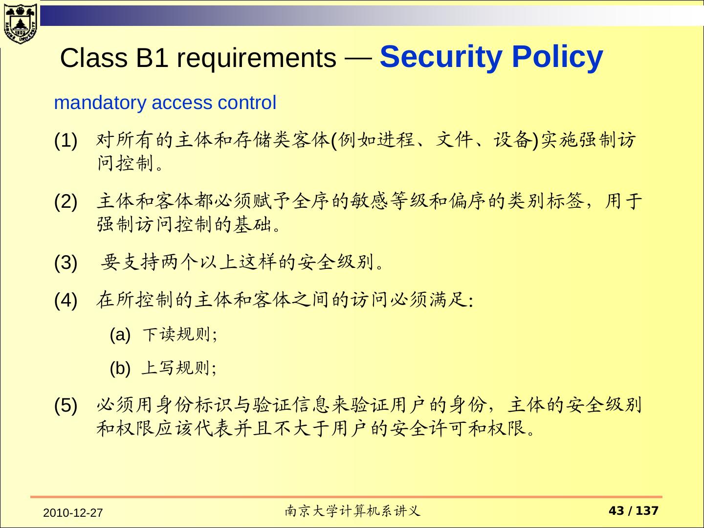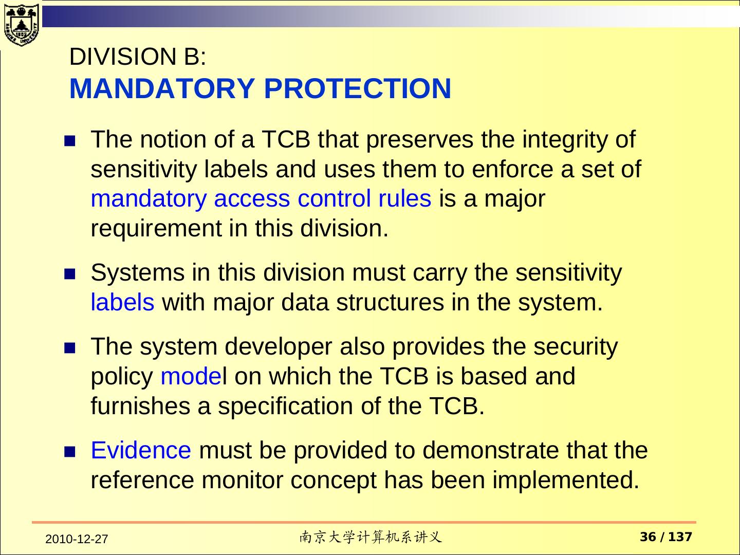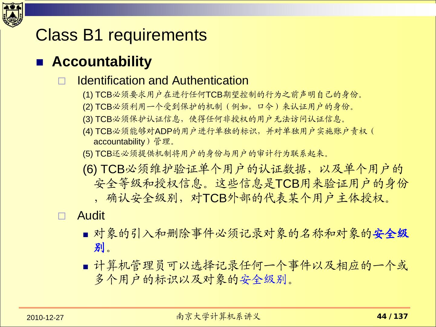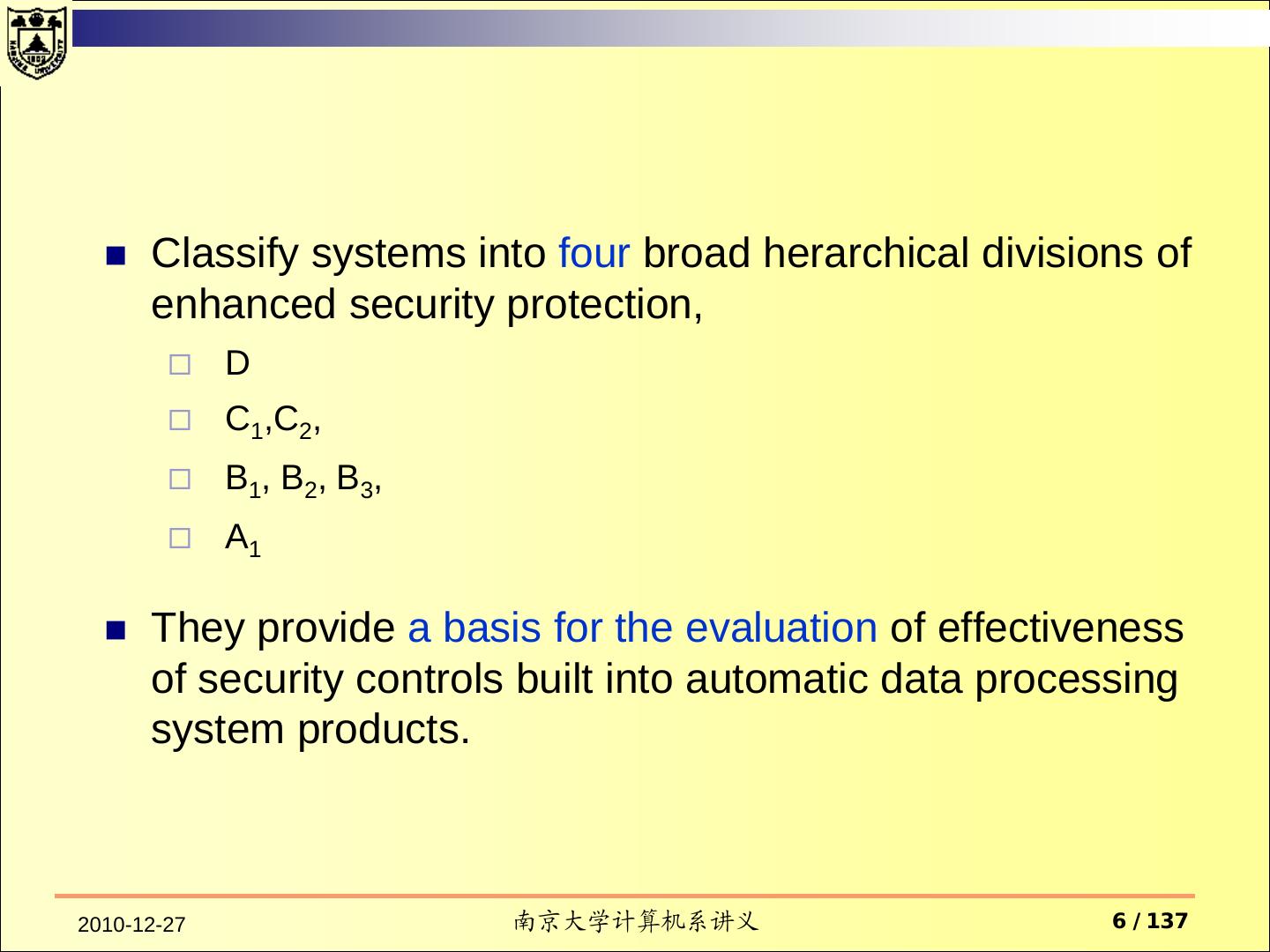 6 . Classify systems into four broad herarchical divisions of enhanced security protection, D C1,C2, B1, B2, B3, A1 They provide a basis for the evaluation of effectiveness of security controls built into automatic data processing system products. 2010-12-27 南京大学计算机系讲义 6 / 137