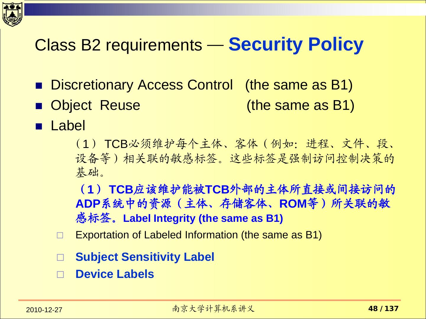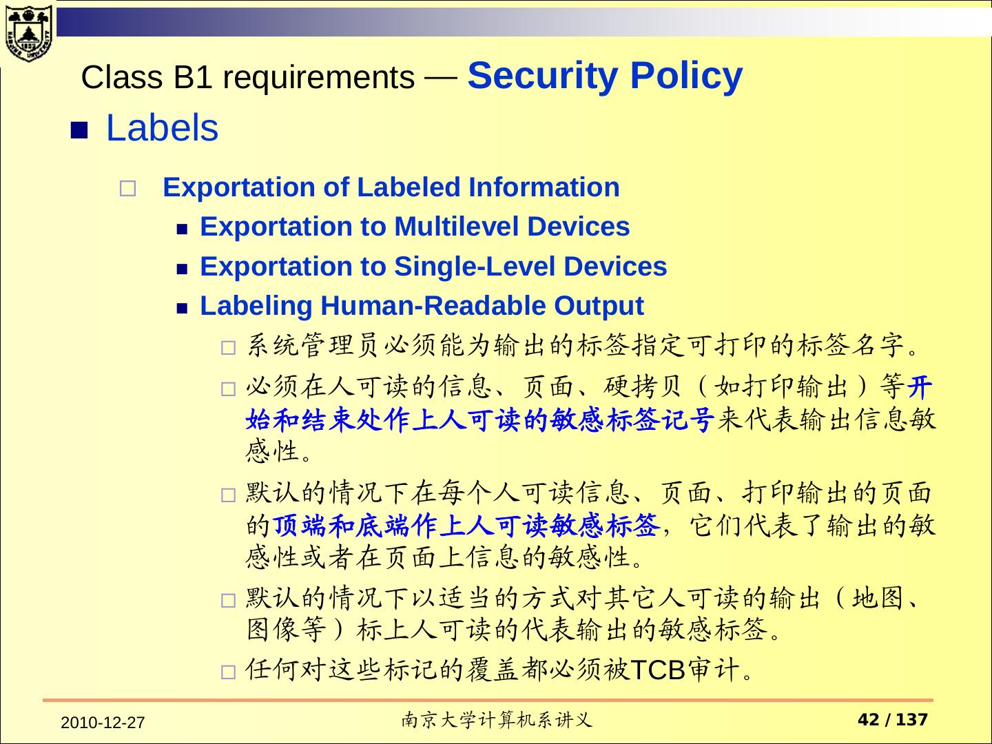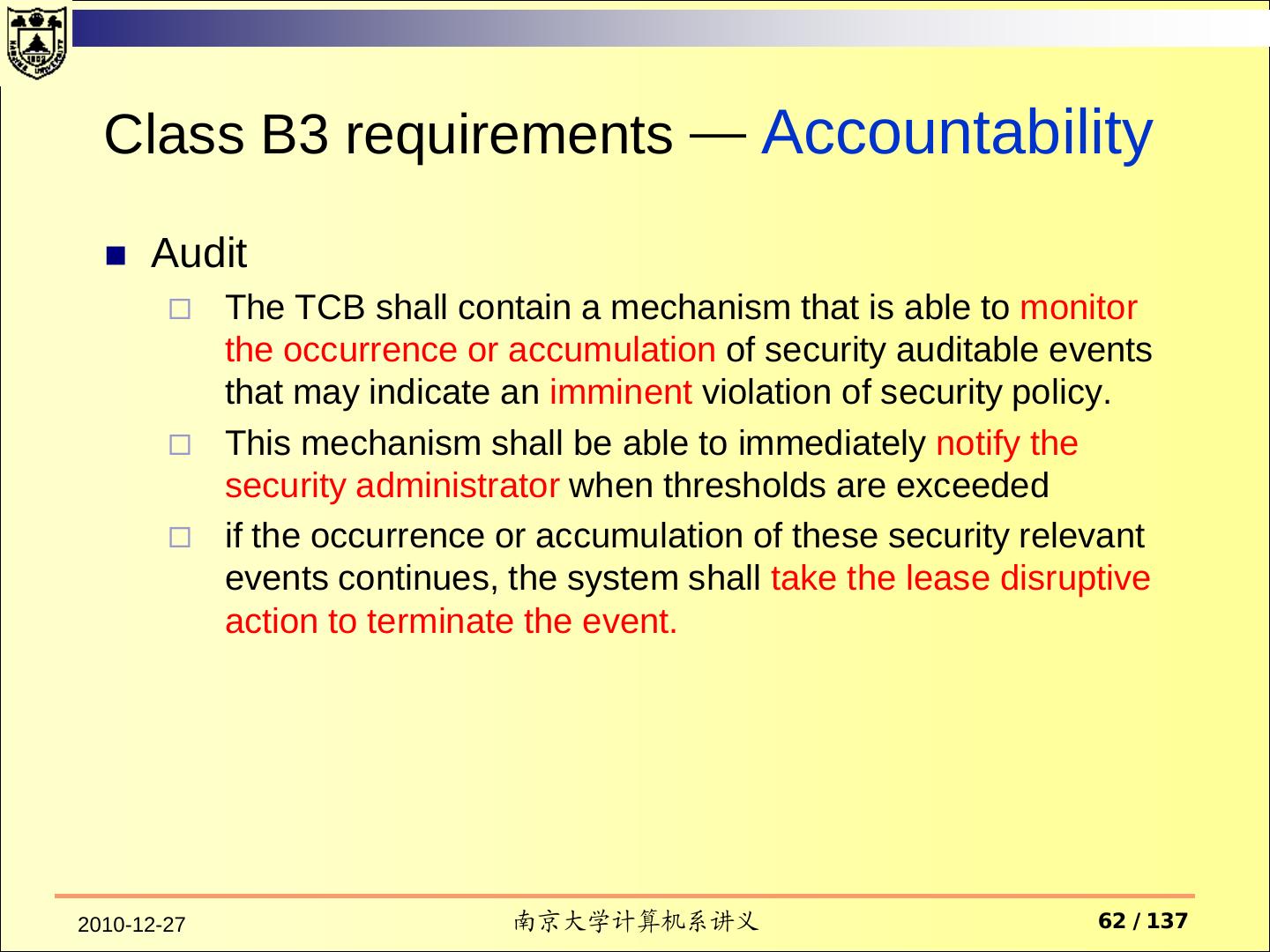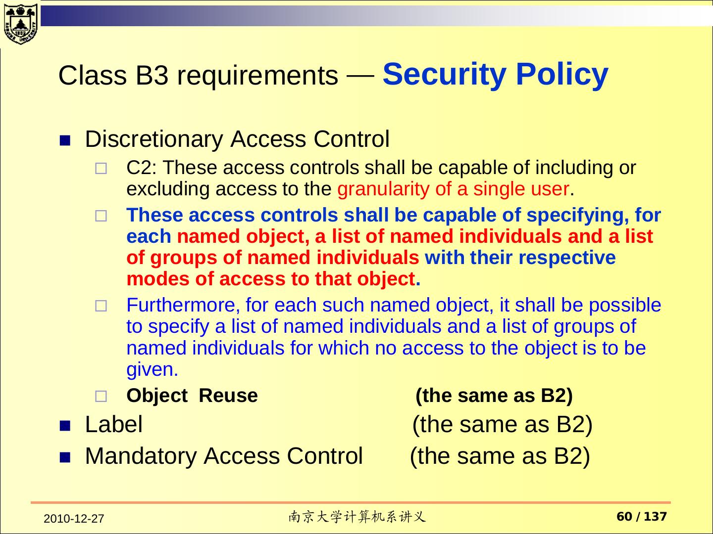 6 . Classify systems into four broad herarchical divisions of enhanced security protection, D C1,C2, B1, B2, B3, A1 They provide a basis for the evaluation of effectiveness of security controls built into automatic data processing system products. 2010-12-27 南京大学计算机系讲义 6 / 137