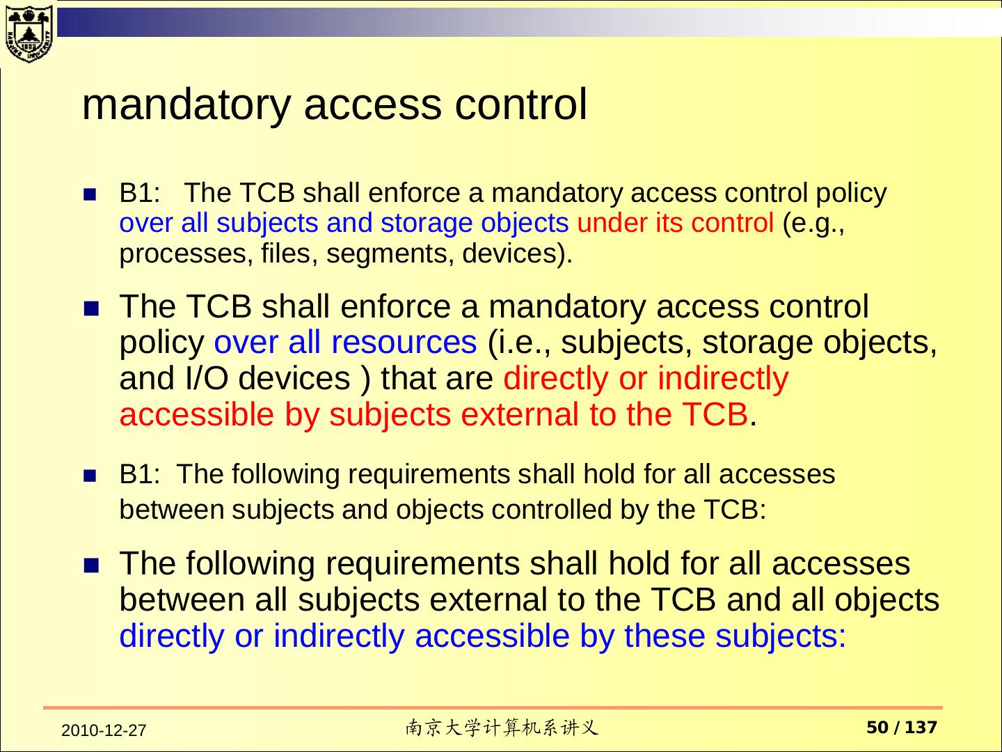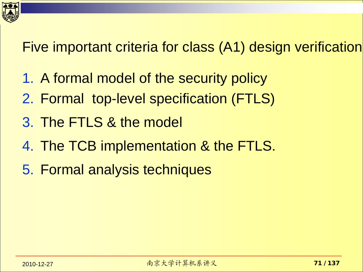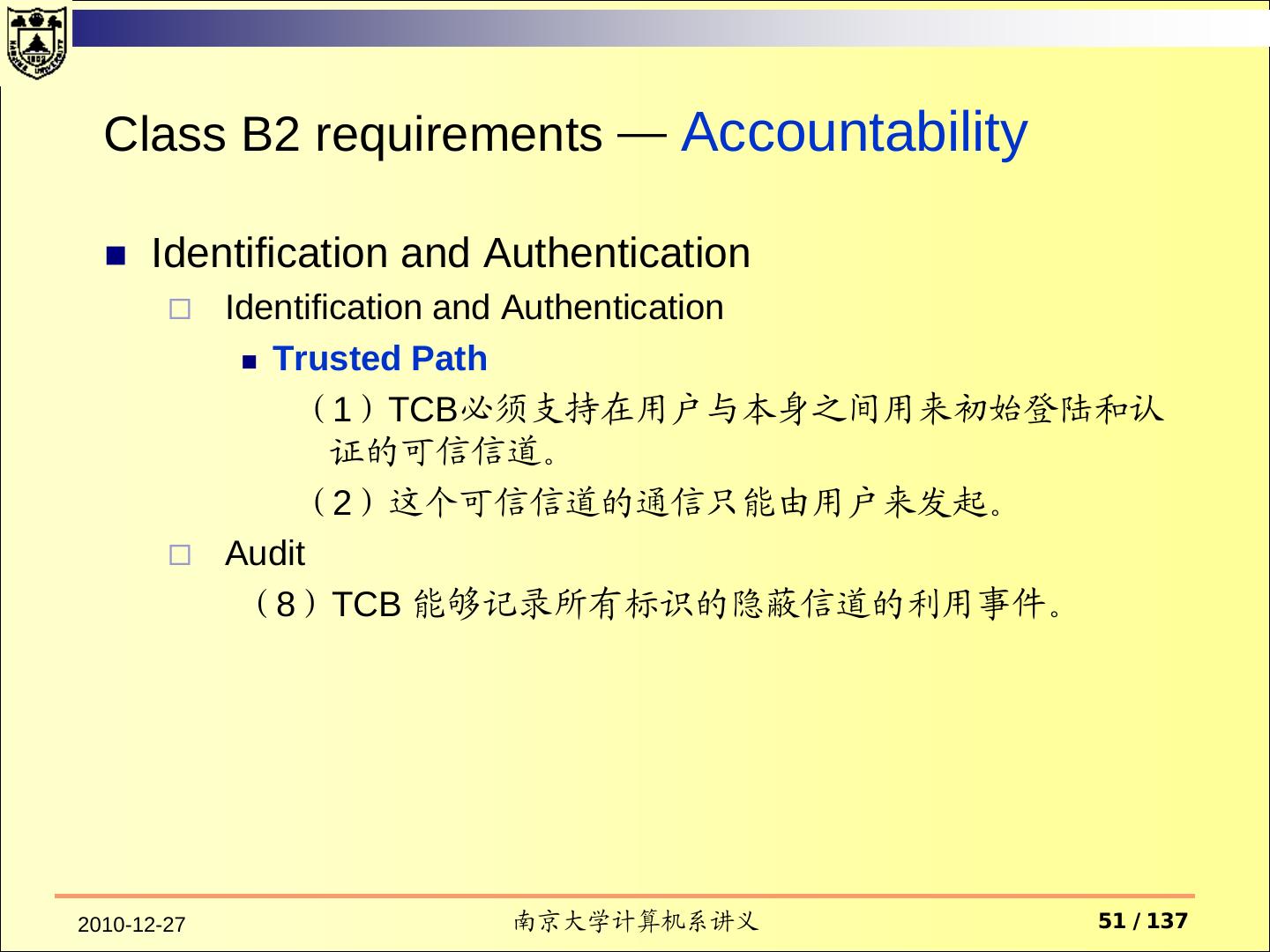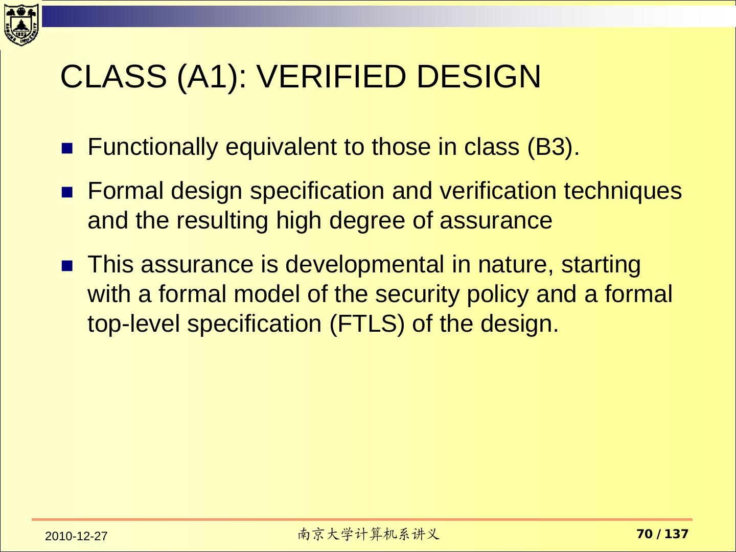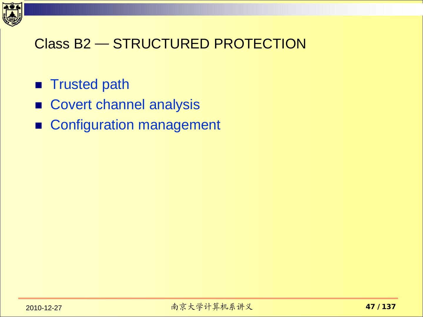 6 . Classify systems into four broad herarchical divisions of enhanced security protection, D C1,C2, B1, B2, B3, A1 They provide a basis for the evaluation of effectiveness of security controls built into automatic data processing system products. 2010-12-27 南京大学计算机系讲义 6 / 137