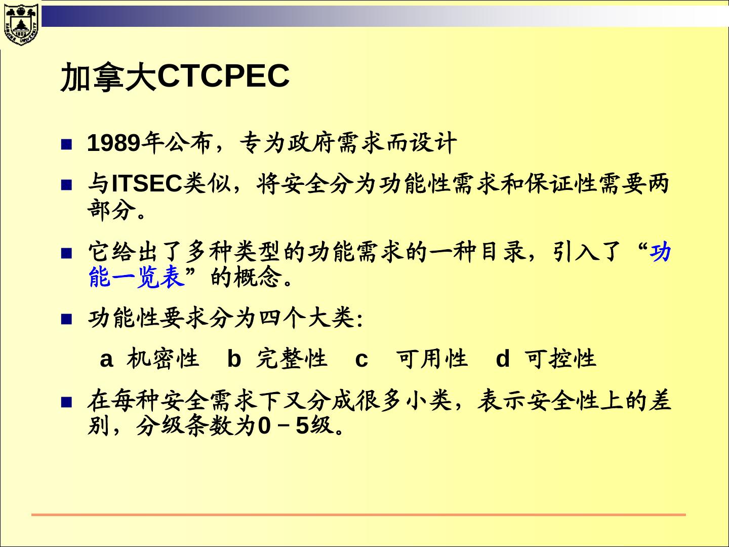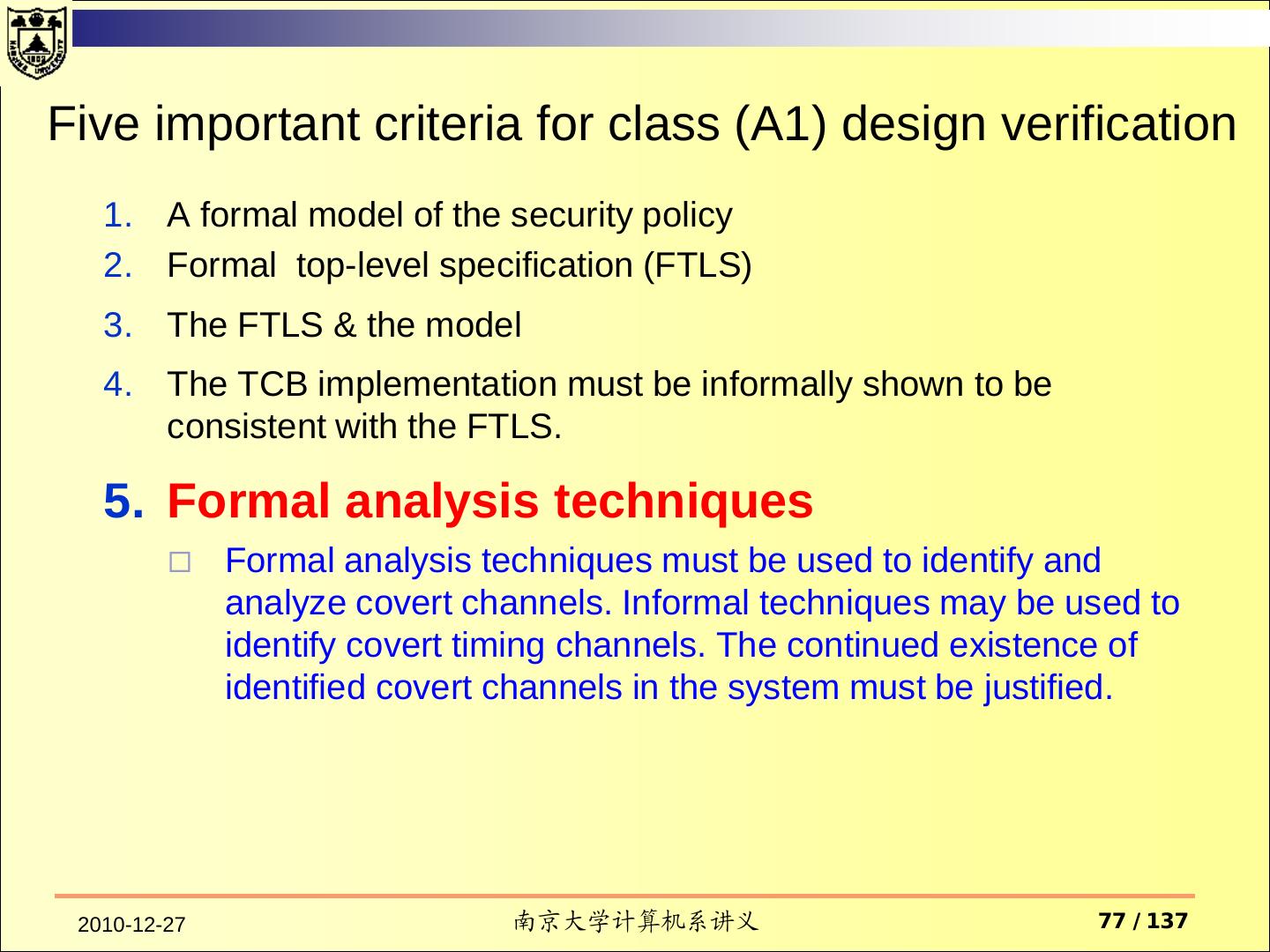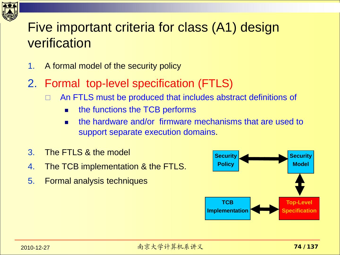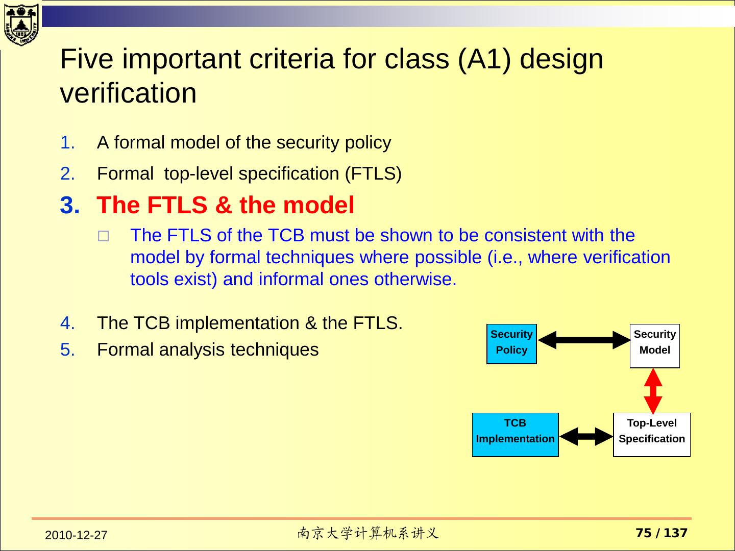 6 . Classify systems into four broad herarchical divisions of enhanced security protection, D C1,C2, B1, B2, B3, A1 They provide a basis for the evaluation of effectiveness of security controls built into automatic data processing system products. 2010-12-27 南京大学计算机系讲义 6 / 137