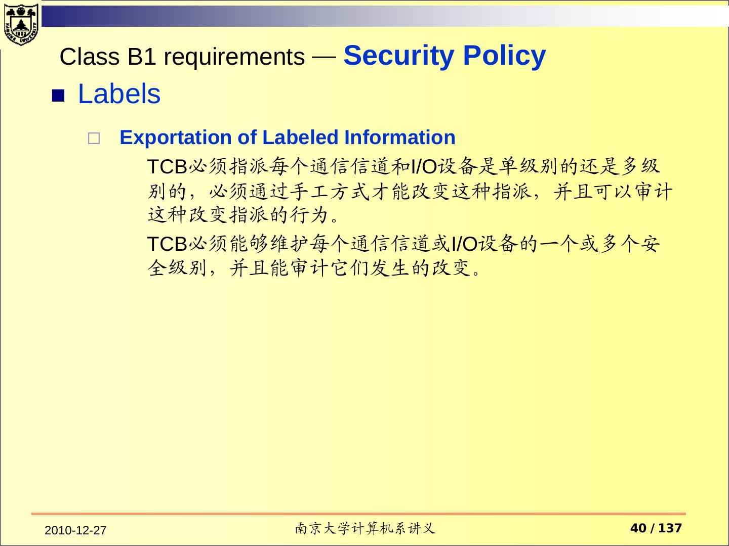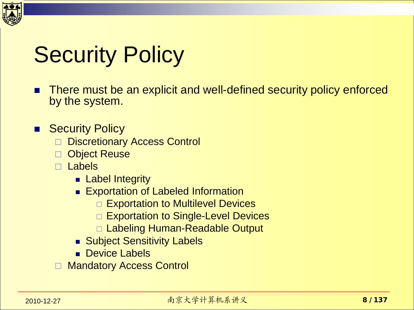 8 . Security Policy There must be an explicit and well-defined security policy enforced by the system. Security Policy Discretionary Access Control Object Reuse Labels Label Integrity Exportation of Labeled Information Exportation to Multilevel Devices Exportation to Single-Level Devices Labeling Human-Readable Output Subject Sensitivity Labels Device Labels Mandatory Access Control 2010-12-27 南京大学计算机系讲义 8 / 137
