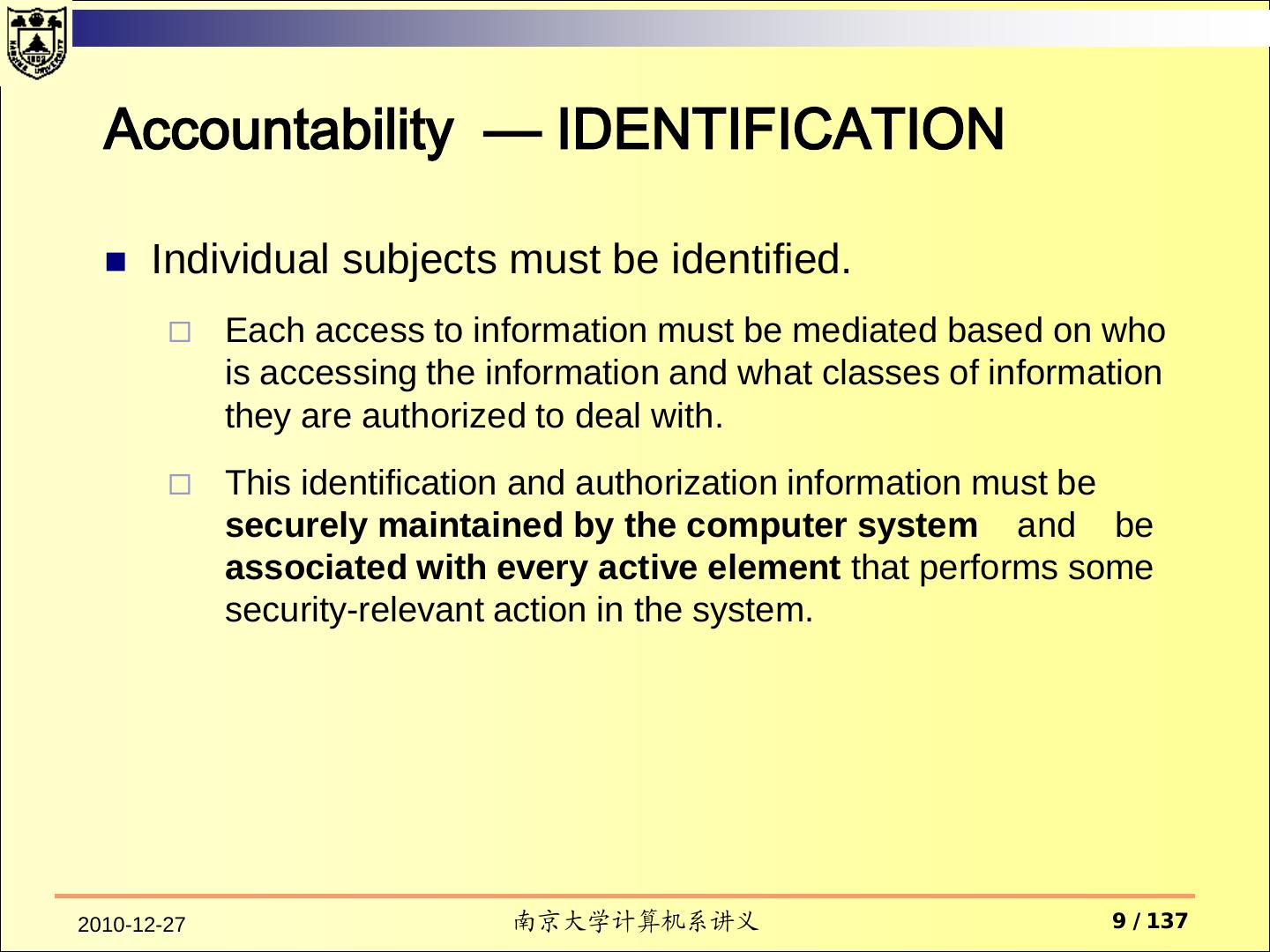 9 . Accountability — IDENTIFICATION Individual subjects must be identified. Each access to information must be mediated based on who is accessing the information and what classes of information they are authorized to deal with. This identification and authorization information must be securely maintained by the computer system and be associated with every active element that performs some security-relevant action in the system. 2010-12-27 南京大学计算机系讲义 9 / 137