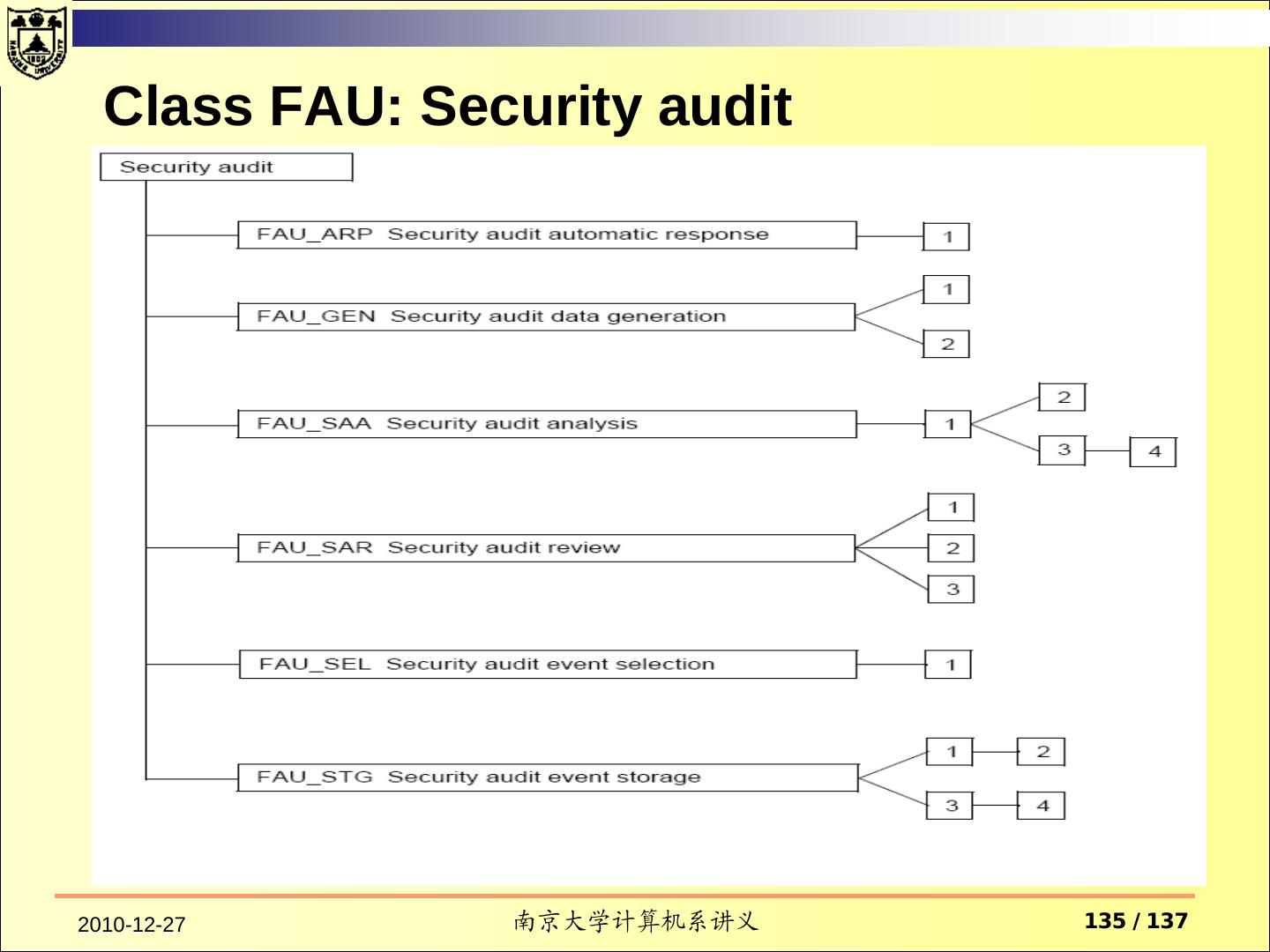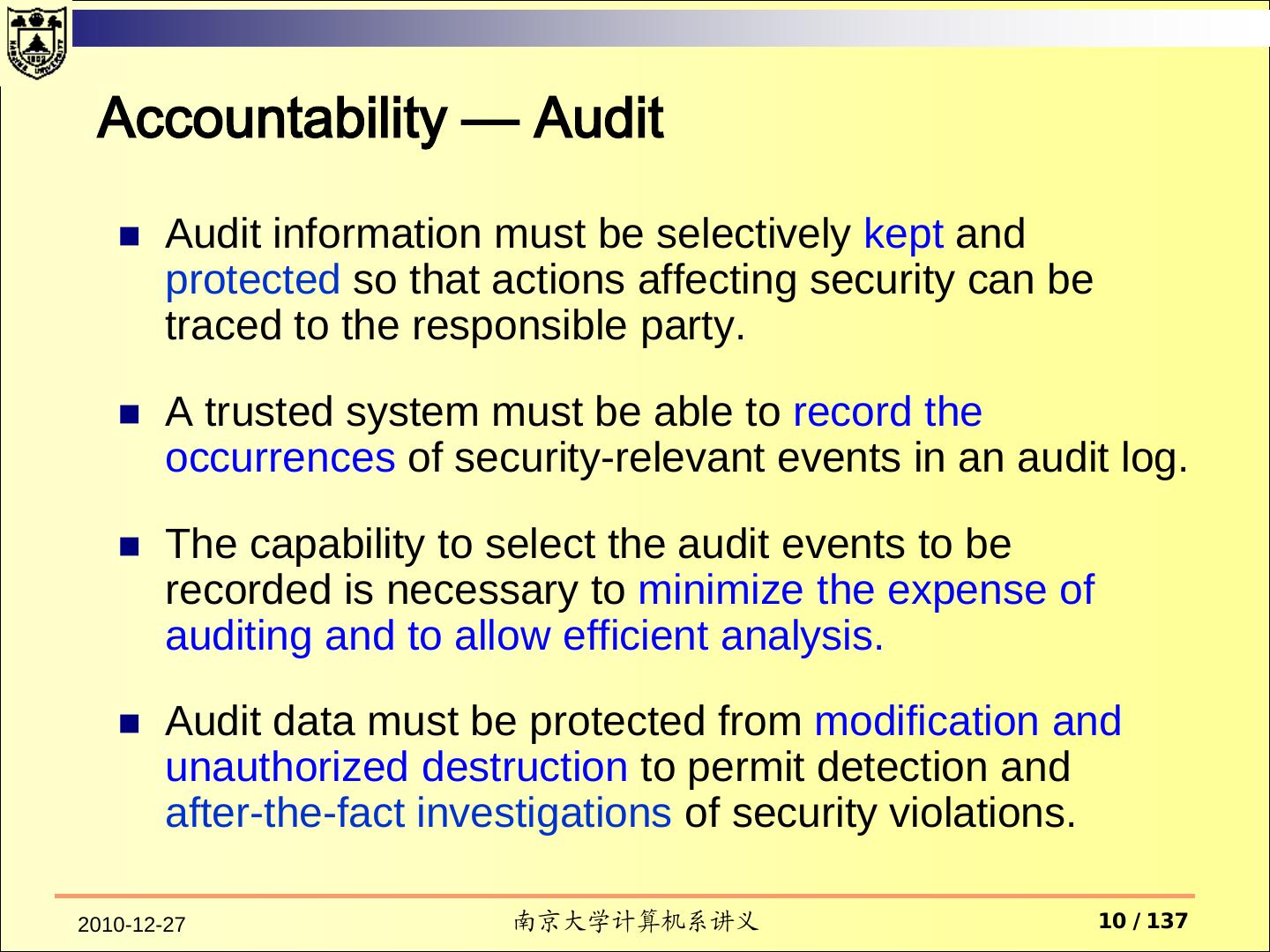 10 . Accountability — Audit Audit information must be selectively kept and protected so that actions affecting security can be traced to the responsible party. A trusted system must be able to record the occurrences of security-relevant events in an audit log. The capability to select the audit events to be recorded is necessary to minimize the expense of auditing and to allow efficient analysis. Audit data must be protected from modification and unauthorized destruction to permit detection and after-the-fact investigations of security violations. 2010-12-27 南京大学计算机系讲义 10 / 137